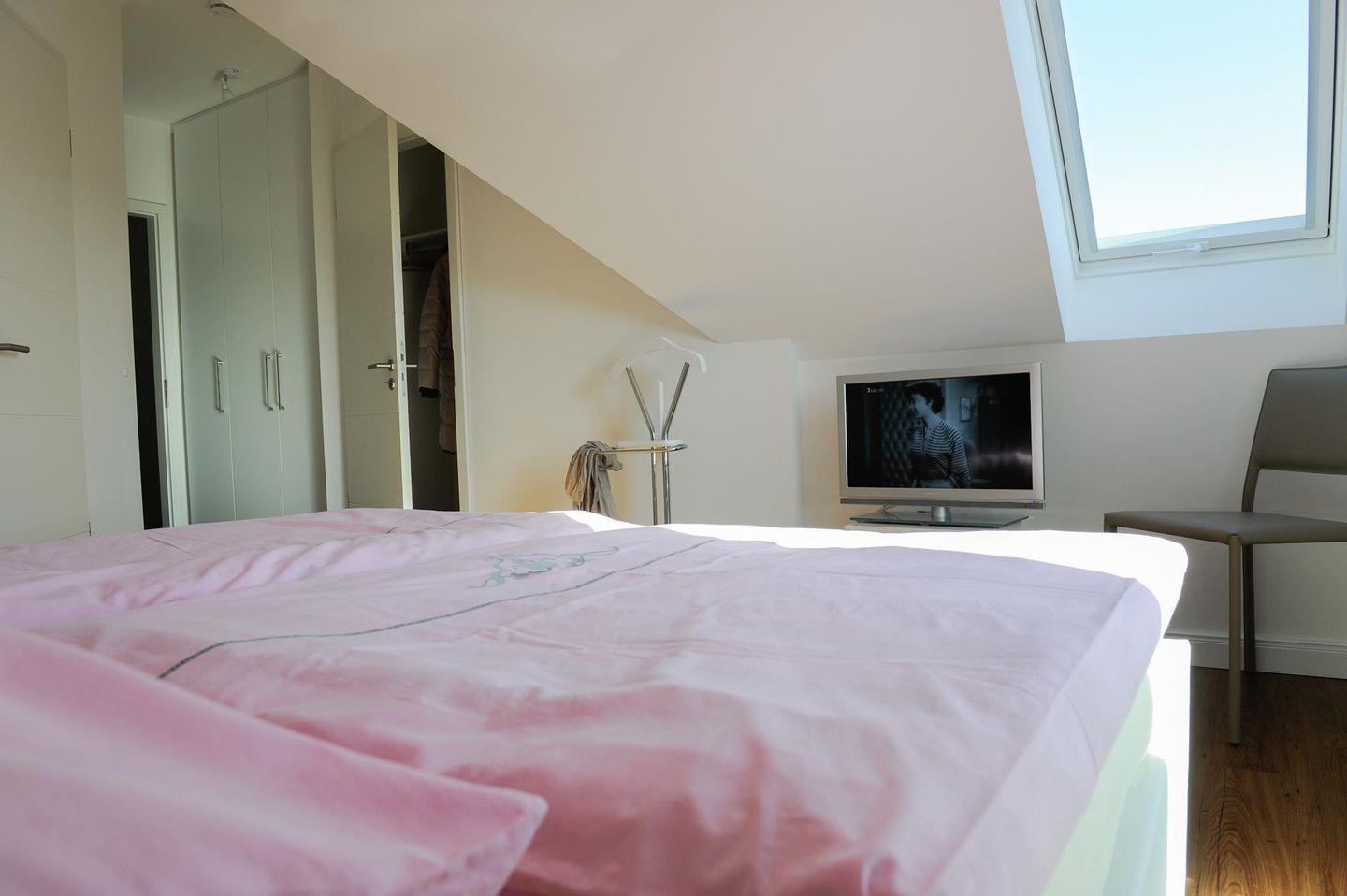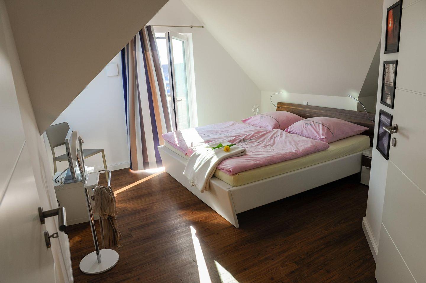 Schlafzimmer 1 mit bequemem Doppelbett, geräumigem Einbauschrank, LCD-TV, kleinem Balkon und eigenem Bad-Zugang