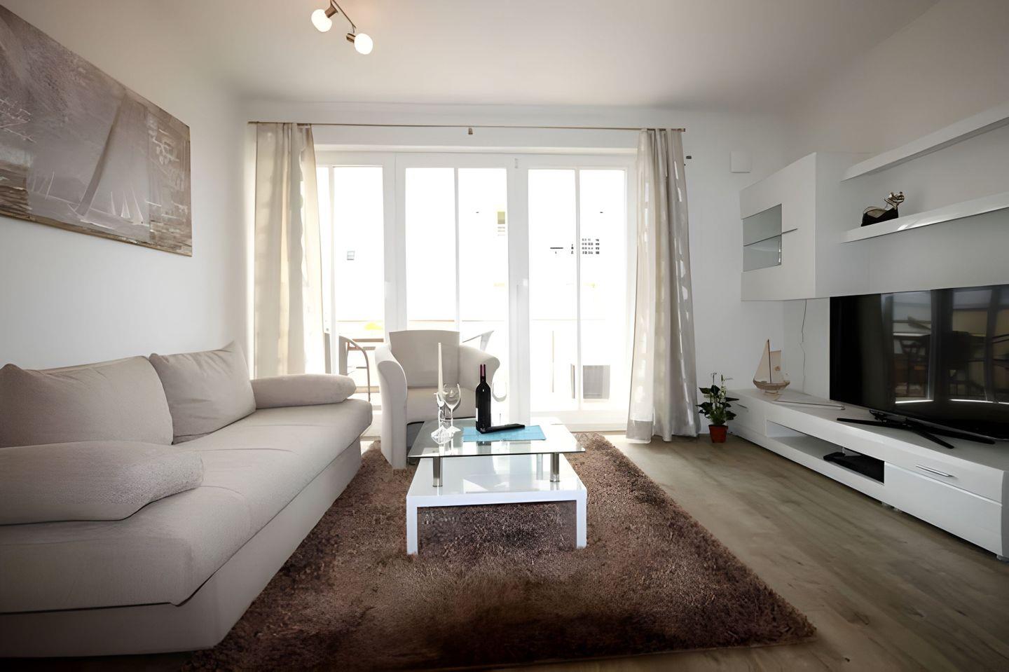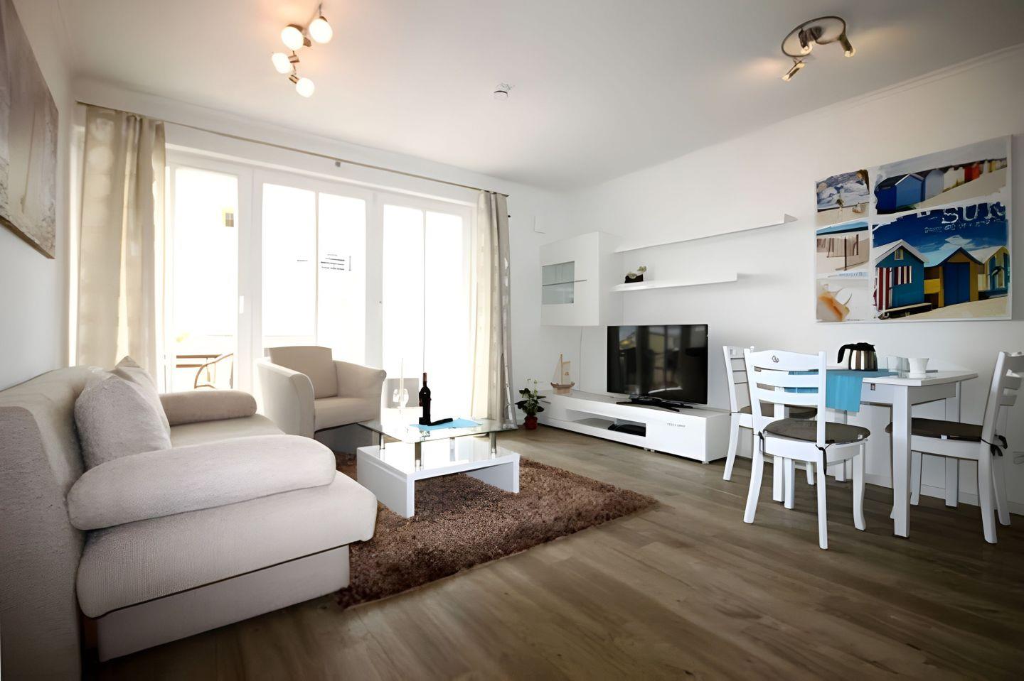 Der WOHN-/ ESSBEREICH ist mit einer bequemen Schlafcouch, einem Sessel sowie einem großen Flachbild-TV, einer Stereoanlage und einem Blu-ray-Player ausgestattet. In der offenen KÜCHE finden Sie einen Herd mit Cerankochfeld, Backofen, Geschirrspüler, Kühlschrank mit Gefrierfach, Toaster, Wasserkocher und eine Filterkaffeemaschine sowie weiteres Kochzubehör. Hier lädt auch ein hölzerner Esstisch zu gemeinsamen Mahlzeiten ein. Im angrenzenden modernen BAD finden Sie eine bodengleiche Dusche, einen Waschtisch mit Spiegel, Föhn und einen Handtuchtrockner vor. Ein Doppelbett empfängt Sie im SCHLAFZIMMER. Das Bett hat eine durchgehende Matratze. Hier befindet sich auch ein zweites Fernsehgerät und ein großzügiger Kleiderschrank. Von diesem Raum und auch vom Wohnbereich aus, können Sie den BALKON betreten, der nach Süd-Ost ausgerichtet ist. Ein maritimer Strandkorb sowie ein Tisch mit vier Balkonstühlen, sorgen für Entspannung. Sämtliche Räume der Unterkunft sind mit einer Fußbodenheizung ausgestattet worden. Zu Ihrer Ferienwohnung gehört ein KOSTENFREIER TIEFGARAGENSTELLPLATZ. Bitte beachten Sie die DURCHFAHRTSHÖHE von max. 1,90m! Bei Überschreitung der maximalen Durchfahrtshöhe ihres Fahrzeugs, besteht die Möglichkeit auf einen kostenpflichtigen Parkplatz in unmittelbarer Nähe auszuweichen. Zudem befindet sich in der Tiefgarage eine Abstellmöglichkeit für Ihre FAHRRÄDER.