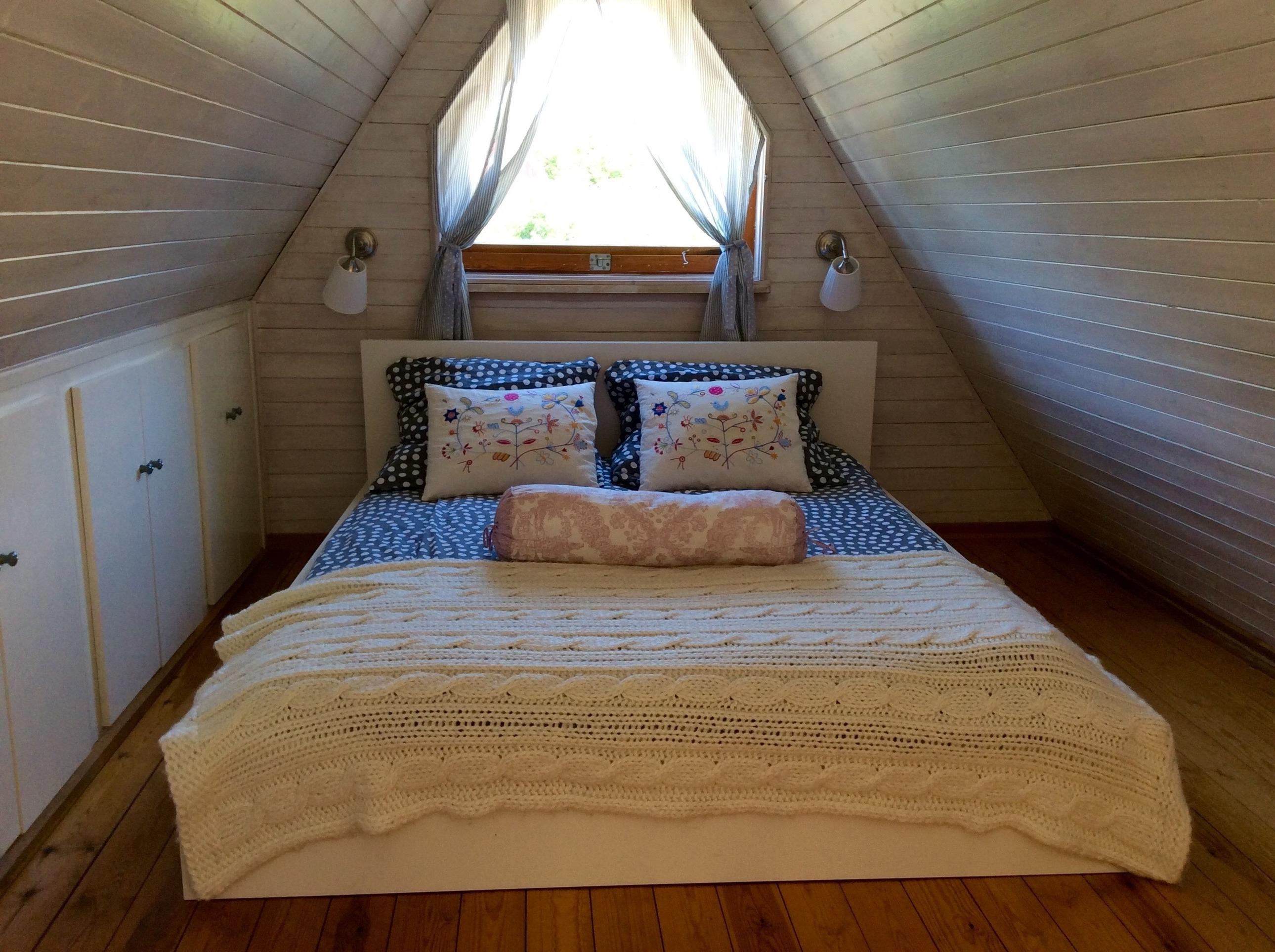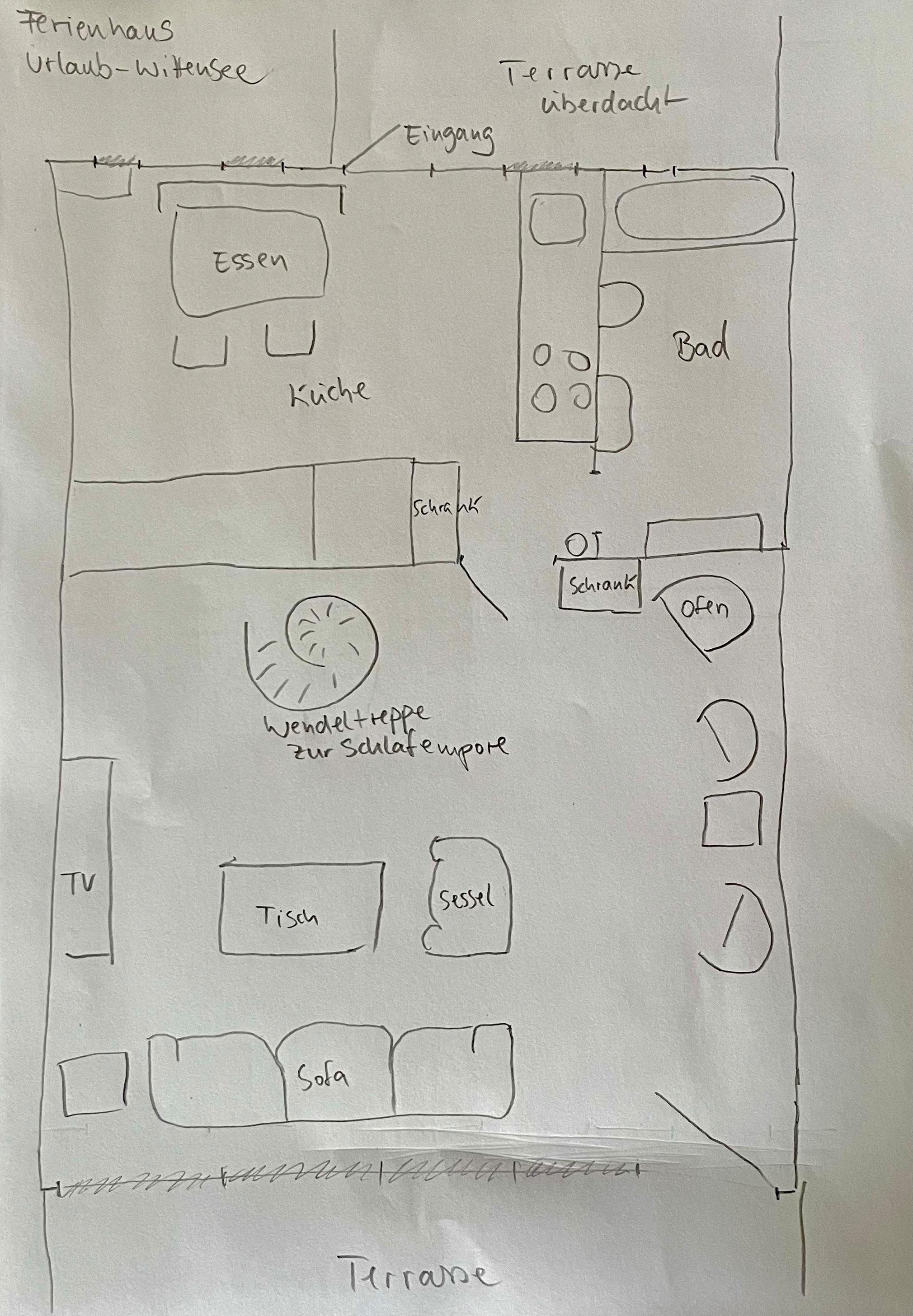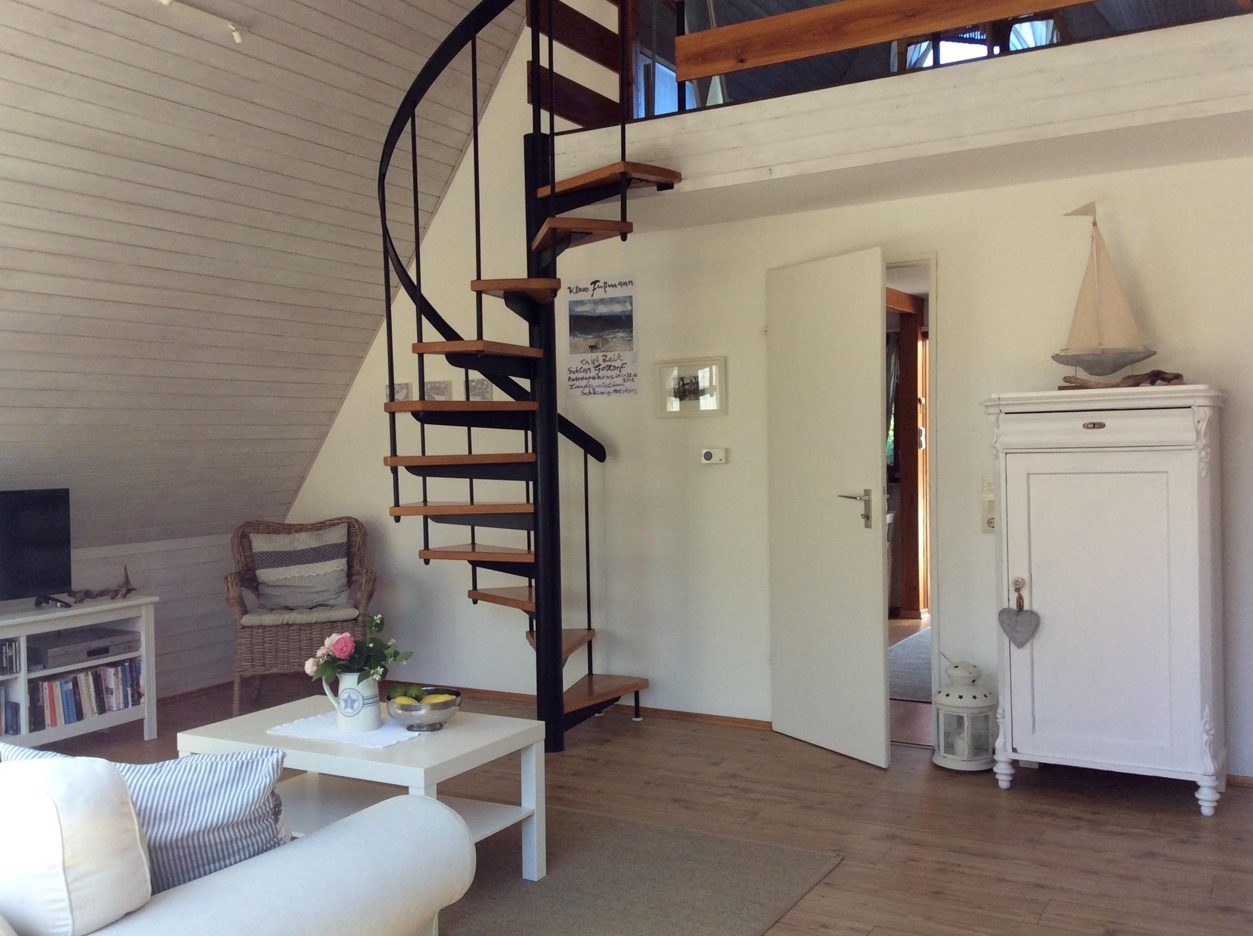 Der große, nach oben hin offene Wohnbereich strahlt eine gemütliche Atmosphäre aus. Über eine Wendeltreppe erreicht man eine Empore. Hier befindet sich der Schlafbereich mit einem Doppelbett.