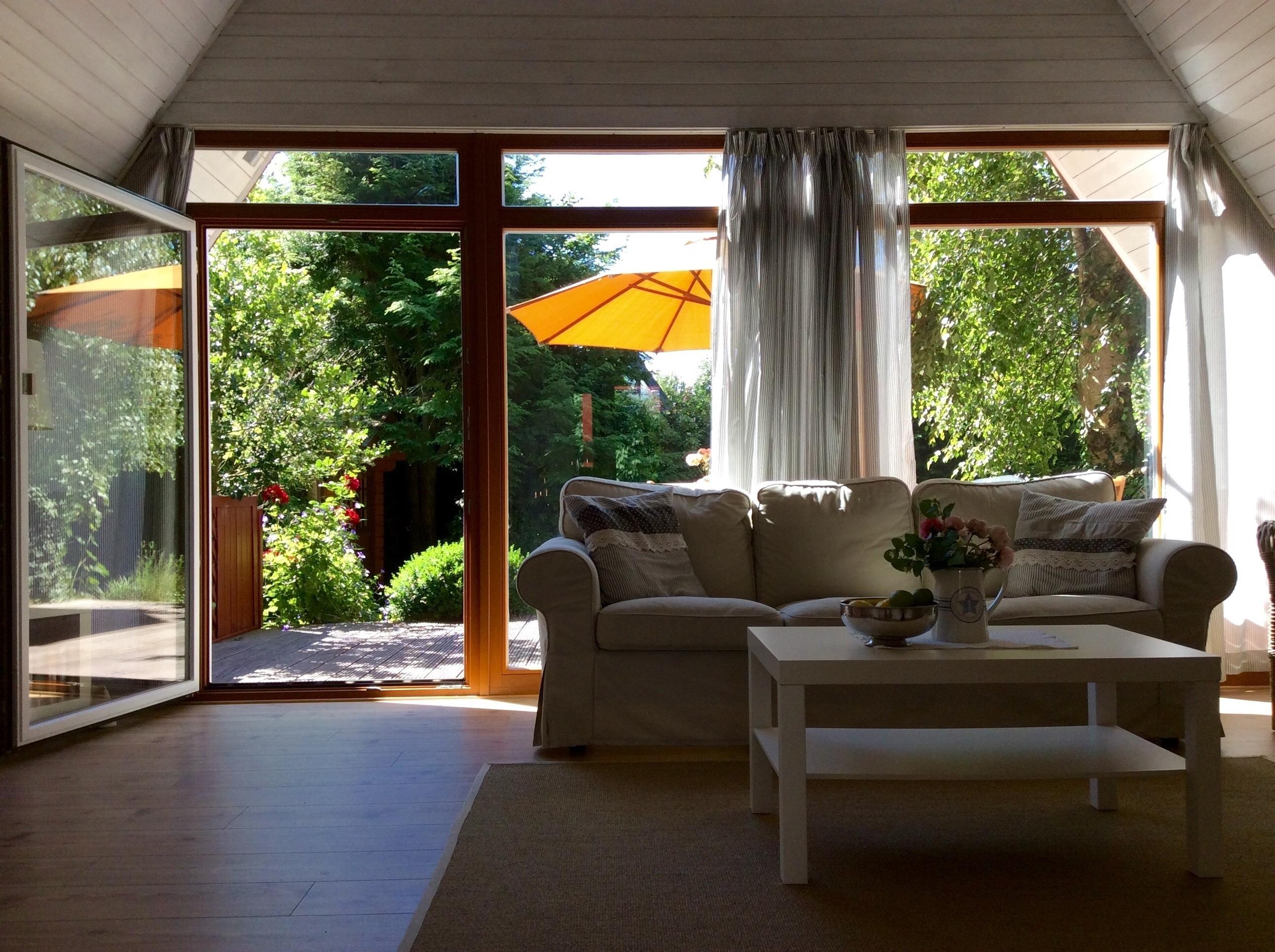Vom Wohnzimmer erreicht man eine großzügige Holzterrasse inmitten eines liebevoll gepflegten, ruhigen, eingewachsenen Gärtchens.
