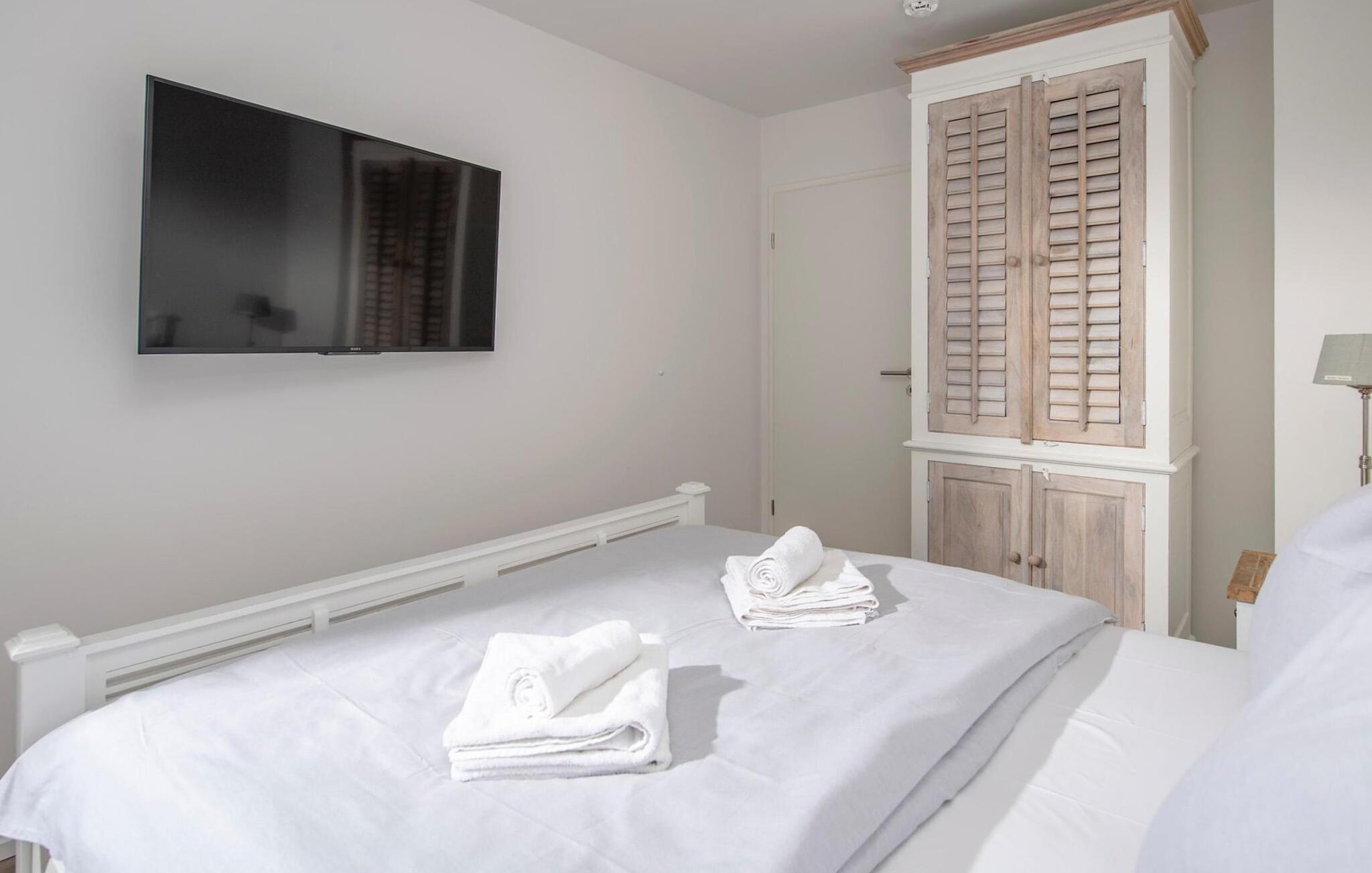 Die beiden Schlafzimmer bieten Zugang zur zweiten Terrasse. Das Hauptschlafzimmer ist hierbei mit einem zusätzlichen TV ausgestattet.