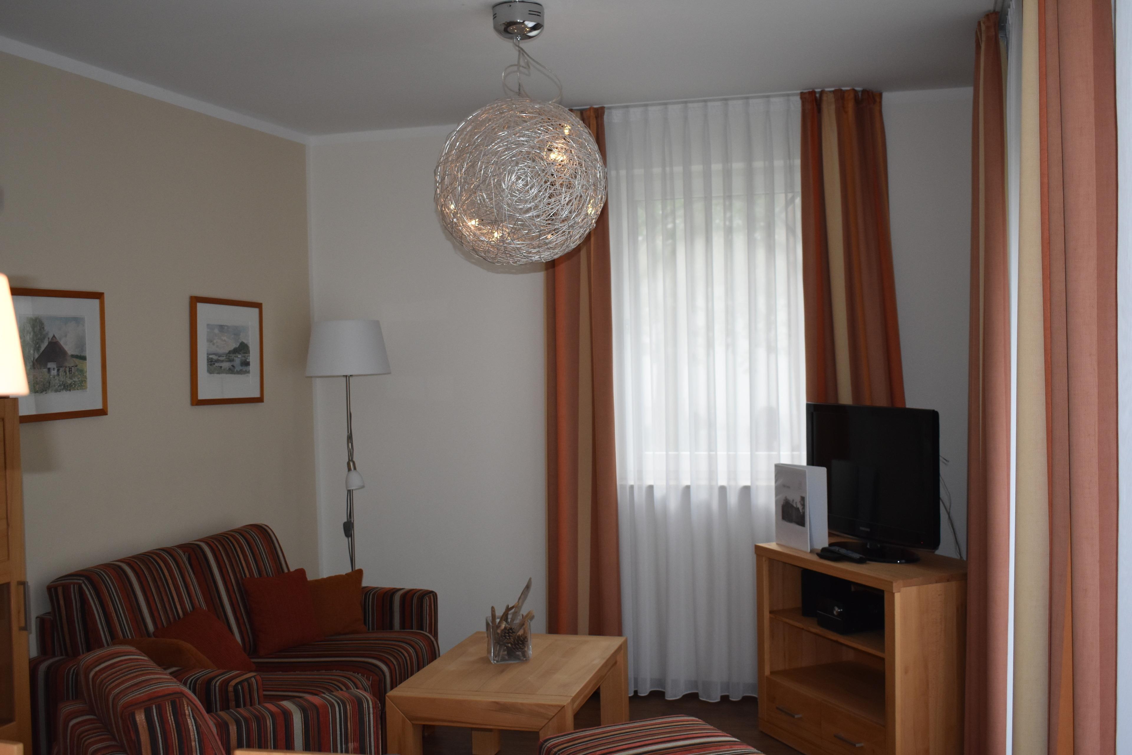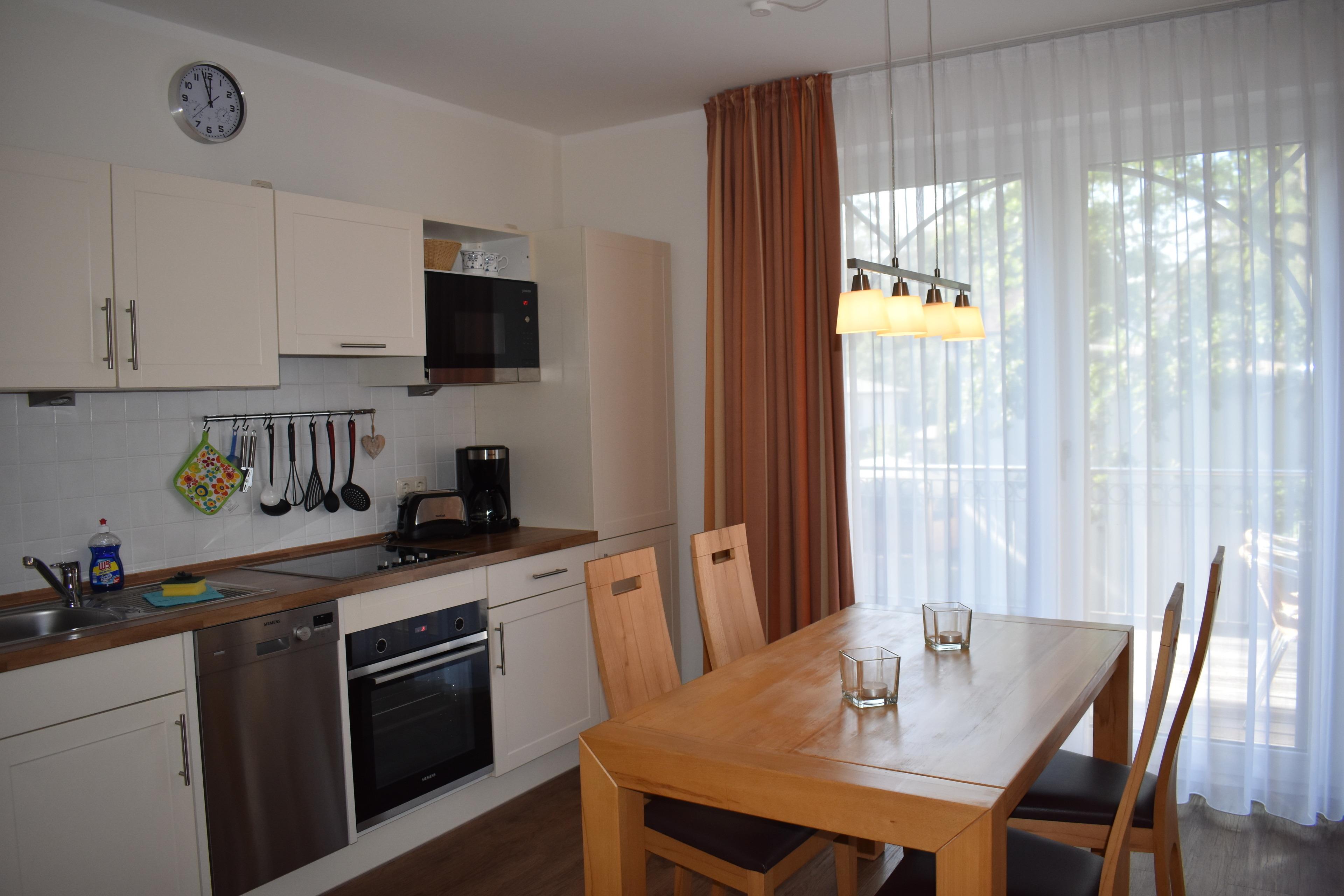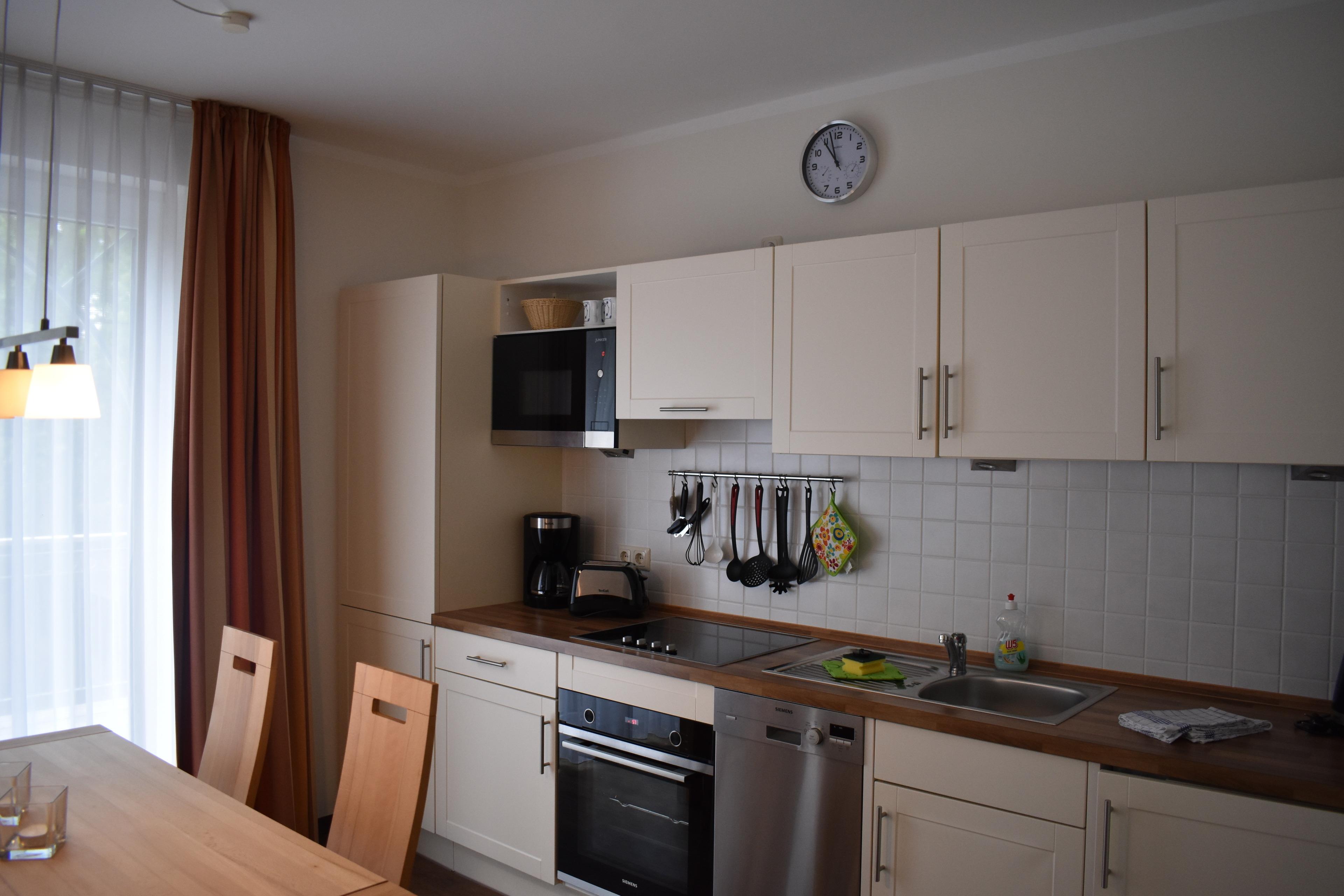 Das Wohnzimmer verfügt über eine gemütliche Sitzgarnitur mit Sessel, Sofa und einem LED-TV. Weiterhin steht eine Musikanlage zur Verfügung. Die Küchenzeile ist komplett ausgestattet. Backofen, Cerankochfeld, Geschirrspüler, Mikrowelle und alles was man so braucht findet man dort. Ein großer Esstisch lädt zum verweilen ein. Das Elternschlafzimmer mit großem Doppelbett verfügt außerdem über ein zweiten TV. Im zweiten kleineren Schlafzimmer befinden sich zwei Einzelbetten. Auf der zur Wohnung gehörenden großen Terrasse befinden sich eine Sitzgarnitur und Sonnenliegen. Die Wohnung ist modern und hochwertig eingerichtet. Ein Wlan Zugang ist vorhanden.