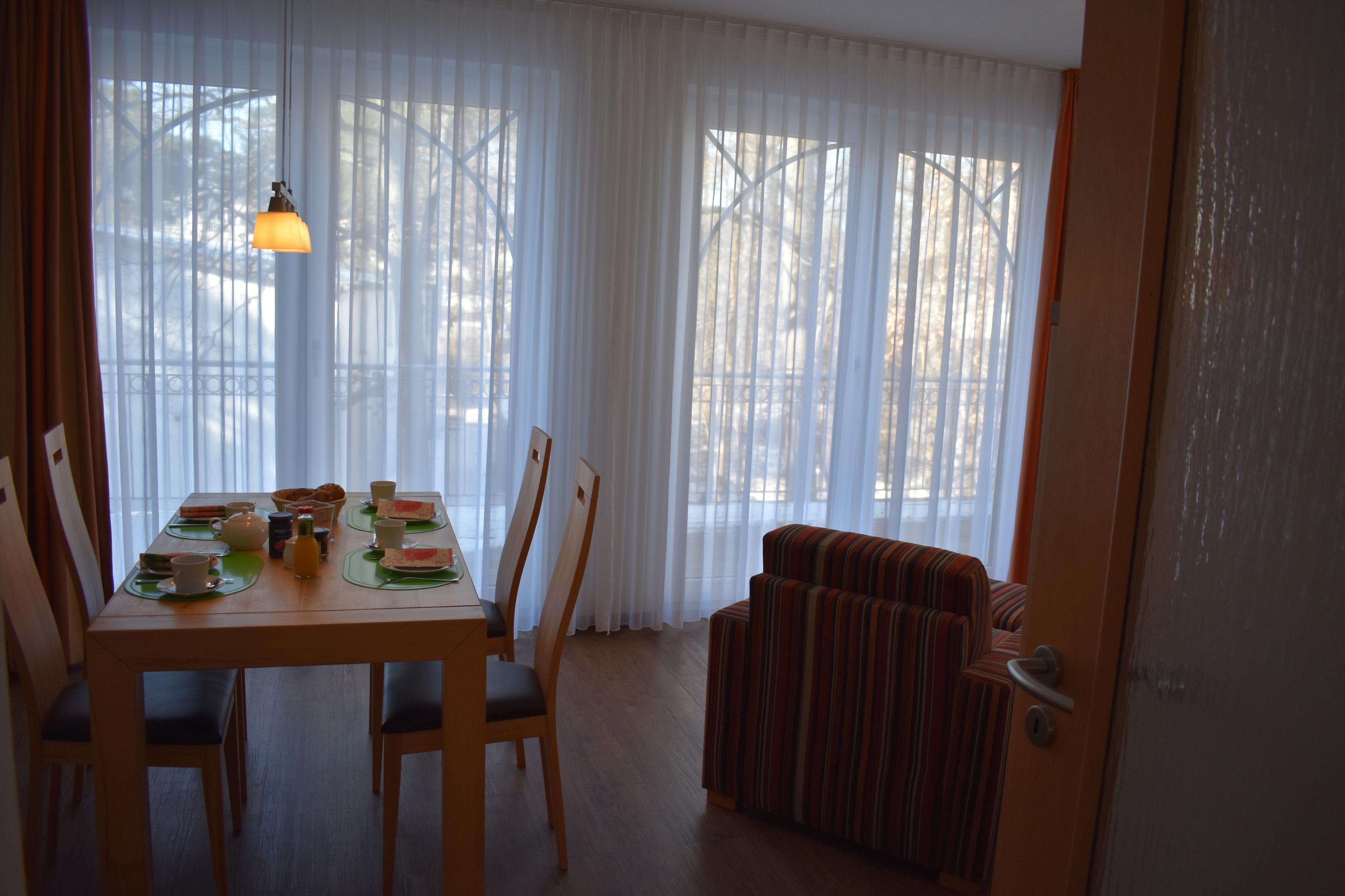 Das Wohnzimmer verfügt über eine gemütliche Sitzgarnitur mit Sofa und Sessel. Ein TV und eine Musikanlage sind natürlich vorhanden. Die Küchenzeile ist komplett ausgestattet. Hier finden sie alles was sie brauchen. Backofen, Ceranfeld, Mikrowelle, Geschirrspüler sind vorhanden. Im Küchenbereich befindet sich auch ein großer Esstisch, wo die ganze Familie Platz findet. Das Elternschlafzimmer verfügt über ein großes Doppelbett. Dort befindet sich auch ein zweiter TV. Im zweiten kleineren Schlafzimmer befinden sich zwei Einzelbetten. Zur Wohnung gehört auch eine 18 qm große Terrasse. Dort kann man in ruhe die Sonne genießen. Balkonmöbel und Liegen sind vorhanden.