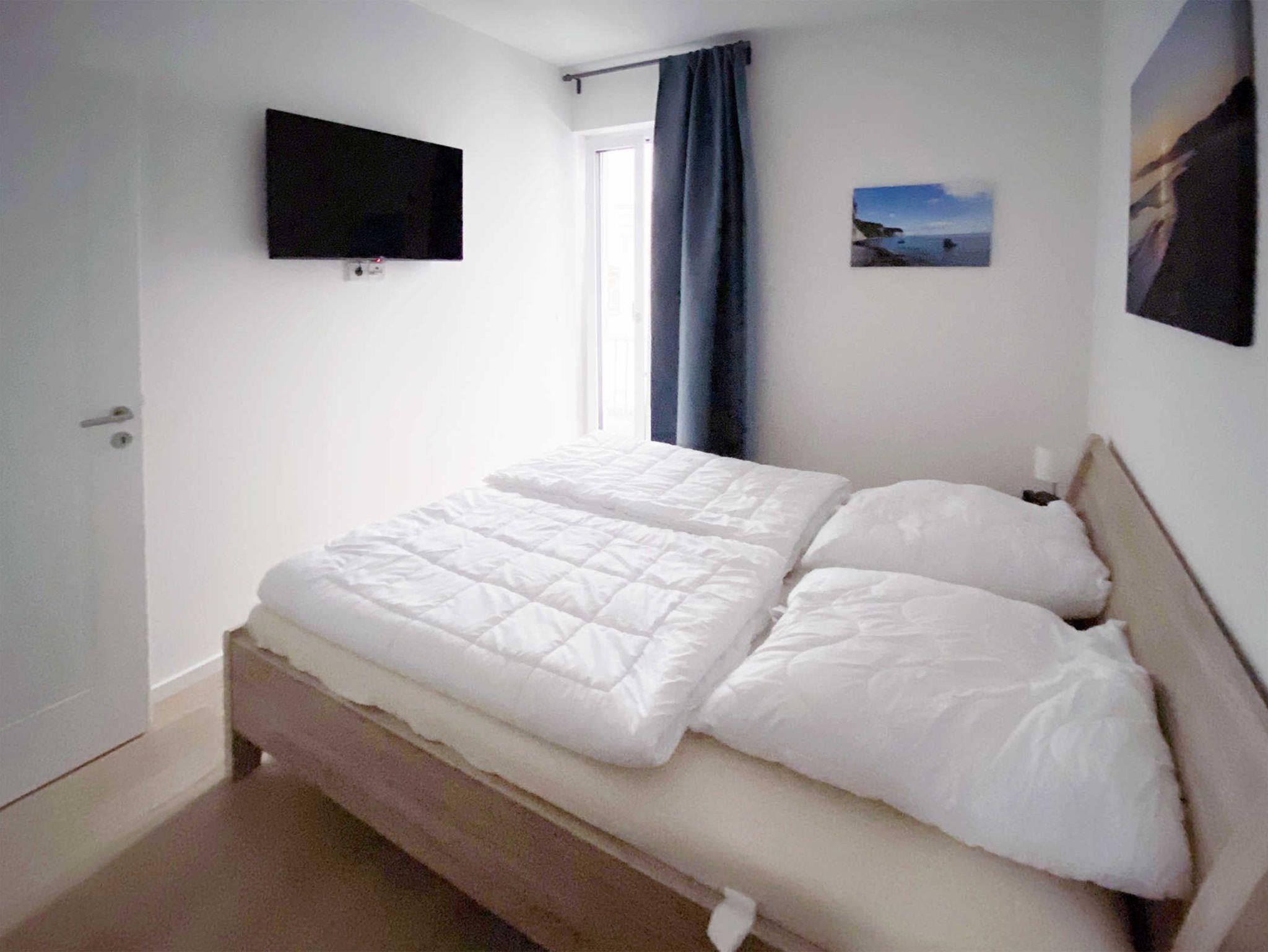 Das Schlafzimmer mit einem 1,80 x 2,00 m großem Doppelbett liegt ruhig nach Süden hin zur Villa Strandläufer. Für getrennt schlafende Personen bietet das komfortable Schlafsofa mit Lattenrost und guter Matratze und einer Liegefläche von 160 x 200 cm im Wohnzimmer eine sehr gute 2. Schlafmöglichkeit.