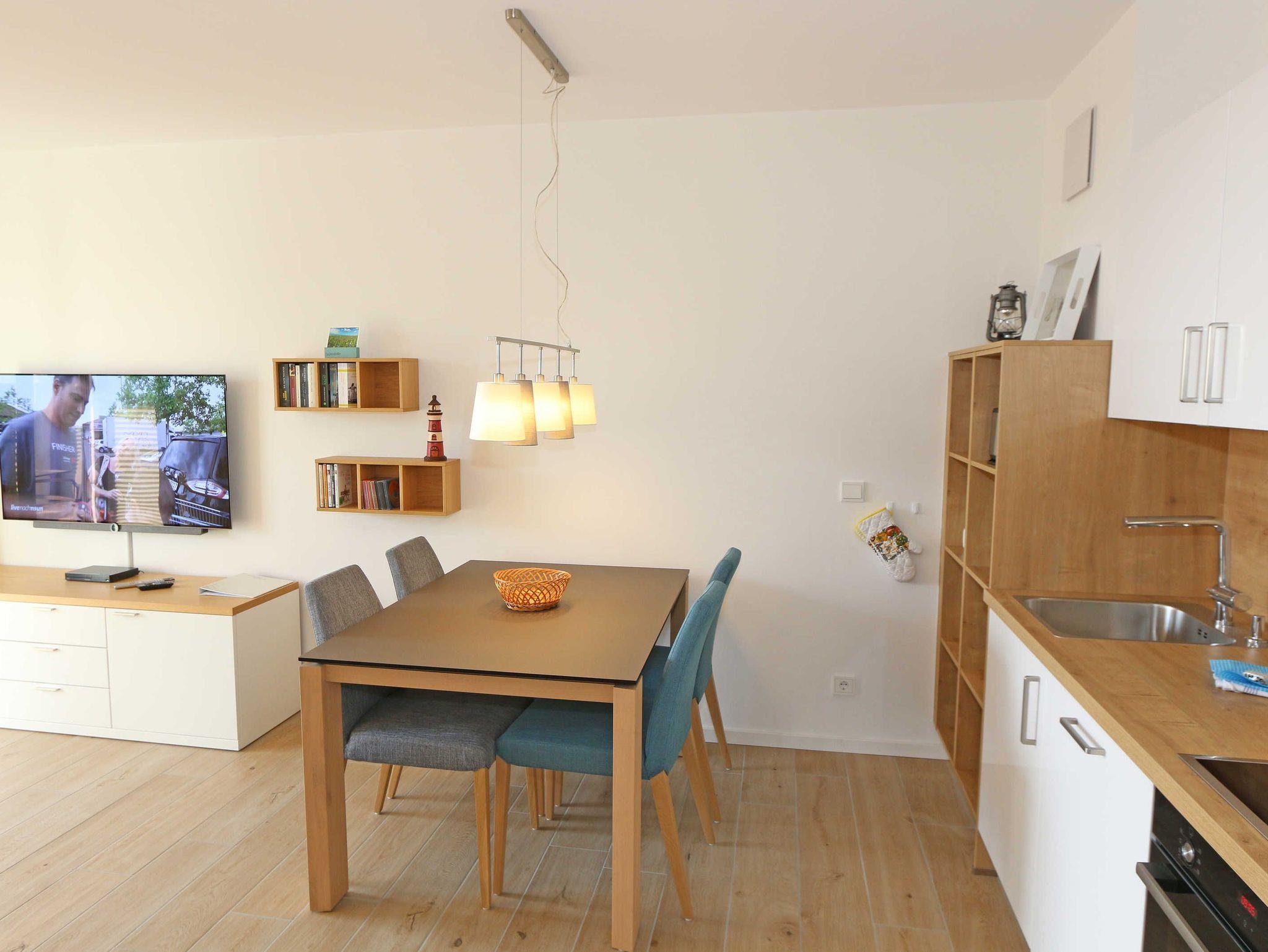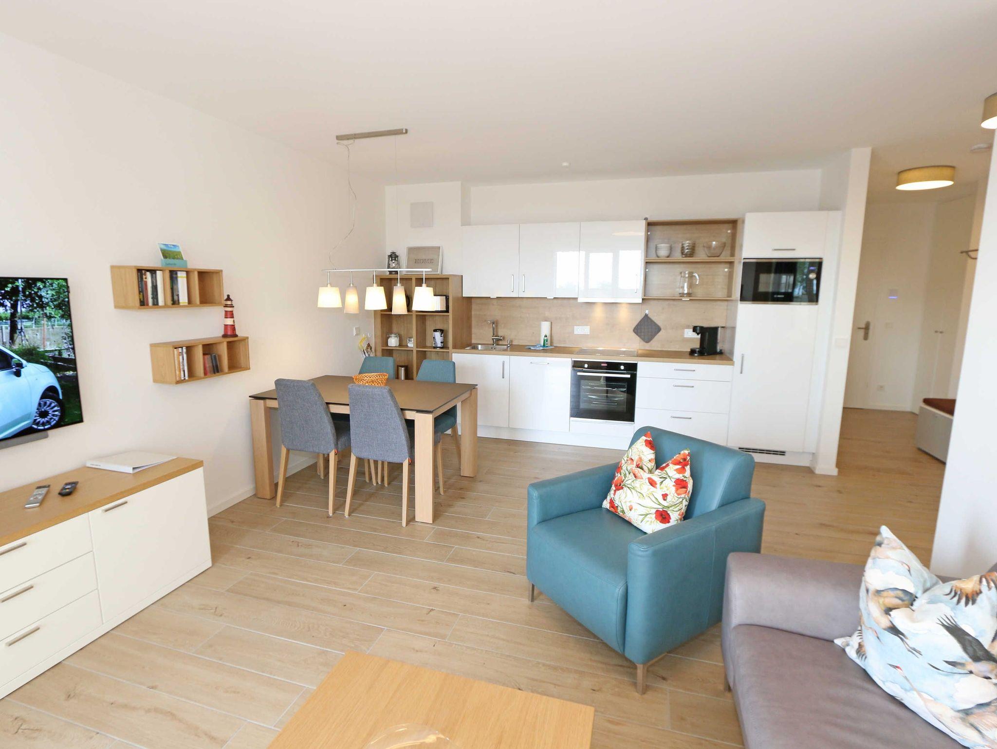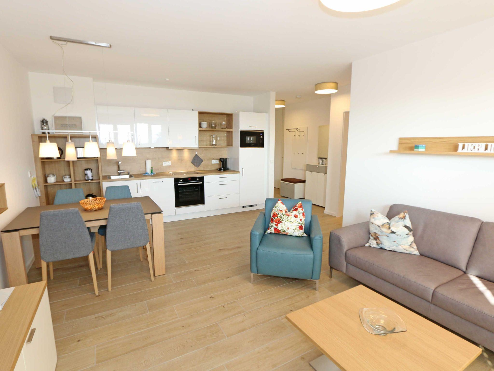 Die stilvoll und komfortabel eingerichtete Nichtraucherferienwohnung „Morgensonne“ befindet sich in der 1. Etage des Hauses. Es erwartet Sie eine 2 Raumwohnung mit einer Gesamtfläche von ca. 62 qm, welche Sie bequem mit dem Fahrstuhl erreichen können. Die Wohnung ist mit viel Liebe zum Detail ausgestattet und für maximal 2 Personen. Der offene Wohnbereich ist mit modernen Möbeln ausgestattet und verfügt über einen Couchtisch mit einem Sessel, Stehlampe, einem Sideboard und einer bequemen Ledercouch in modischen Farben. Für die Unterhaltung steht Ihnen ein Smart-TV von Loewe mit Blu-Ray-Player zur Verfügung ebenso wie eine kleine Auswahl an Urlaubslektüre und Musik-CD`s. Auch auf einen kostenlosen Internetanschluss (WLAN) müssen Sie nicht verzichten. Auf dem nach Osten zum Meer hin ausgerichteten und überdachten Balkon stehen Ihnen eine Sitzgarnitur mit Sonnenschirm für ein gemütliches Frühstück in der Morgensonne oder ein Glas Wein am Abend zur Verfügung. Dabei genießen Sie einen wundervollen Blick auf die Strandpromenade und die Ostsee. Die hochwertig eingerichtete Einbauküchenzeile besitzt Bosch-Hausgeräte mit Induktionskochfeld, Backofen, Kühlschrank mit Gefrierkombination, Mikrowelle, Toaster, Wasserkocher, Kombi Pad Kaffeemaschine mit Thermoskanne von Senseo, Eierkocher und verschiedenen Küchenutensilien. Der Essbereich schließt sich an und besteht aus einem Esstisch und gepolsterten Stühlen. Für einen erholsamen Schlaf steht Ihnen ein Boxspringbett (1,80m x 2,00m) zur Verfügung, mit durchgehendem Topper in Komforthöhe. Nachttischablagen mit Wandleuchten, ein großzügiger Kleiderschrank und ein Smart-TV ergänzen die Ausstattung im Schlafzimmer. Im Wohn ? und im Schlafzimmer gibt es außerdem einen Sichtschutz mit Faltjalousien, eine Verdunkelung mit Vorhängen sowie Insektenschutzgitter für einen erholsamen Schlaf. Von hier gelangen Sie auch auf Ihren Balkon. Im innenliegenden Bad finden Sie einen Waschtisch, ein Wandspiegel, eine ebenerdige Regendusche, ein WC, ein Fön, ein Handtuchtrockner und ein Kosmetikspiegel. Zur Entspannung nach dem Bad im Meer oder an kühlen Tag trägt die Infrarotsauna bei. Der Flurbereich ist mit einem Ganzkörperspiegel ausgestattet. Alle Räume haben geflieste Böden. Eine Fußbodenheizung sorgt an kühleren Tagen für wohlige Wärme. In einem separaten Abstellraum im Eingangsbereich befindet sich ein Staubsauger, ein Wäscheständer und div. Reinigungsutensilien. Zudem können Sie hier auch Ihre Koffer oder Badeutensilien aufbewahren. Ihre eigenen oder gemieteten Fahrräder können Sie in einen Fahrradständer im begrünten Außenbereich abstellen. In der Tiefgarage (Einfahrtshöhe 2,00m) steht Ihnen ein PKW-Abstellplatz (Nr. 15/Morgensonne) zur Verfügung. Im Untergeschoss des Gebäudes befindet sich ein weiterer Wellnessbereich mit einer Gemeinschaftssauna und einem Ruheraum. Ein Waschraum mit Waschmaschinen und Wäschetrockner stehen gegen Bezahlung zur Verfügung. Haustiere sind nicht erlaubt. Die Erstausstattung eines Wäschepaketes (komplette Bettwäsche, 1 Duschhandtuch, 2 kleine Handtücher) können Sie bis 14 Tage vor der Anreise gegen einen Aufpreis dazu buchen oder durch eigene ergänzen. Ab 2 gebuchten Paketen erhalten Sie einmalig 1 Geschirrtuch und einen Duschvorleger dazu.