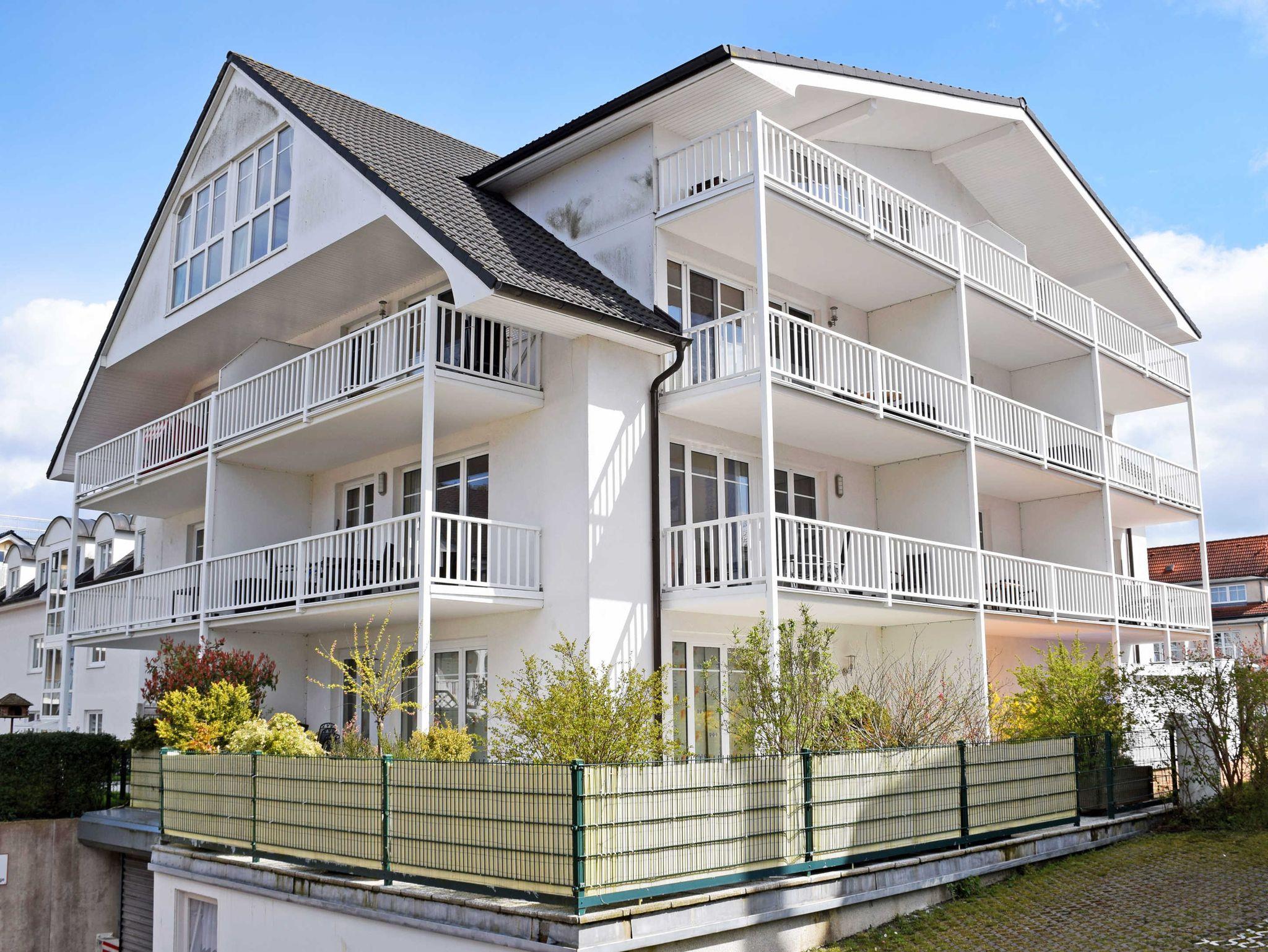 Moderne Fewo mit Balkon und Strandkorb am Meer