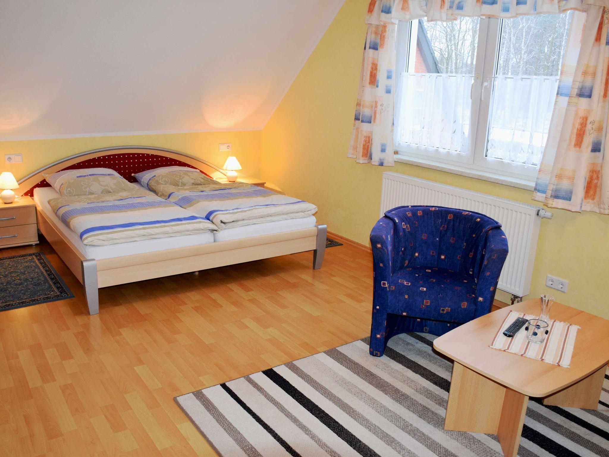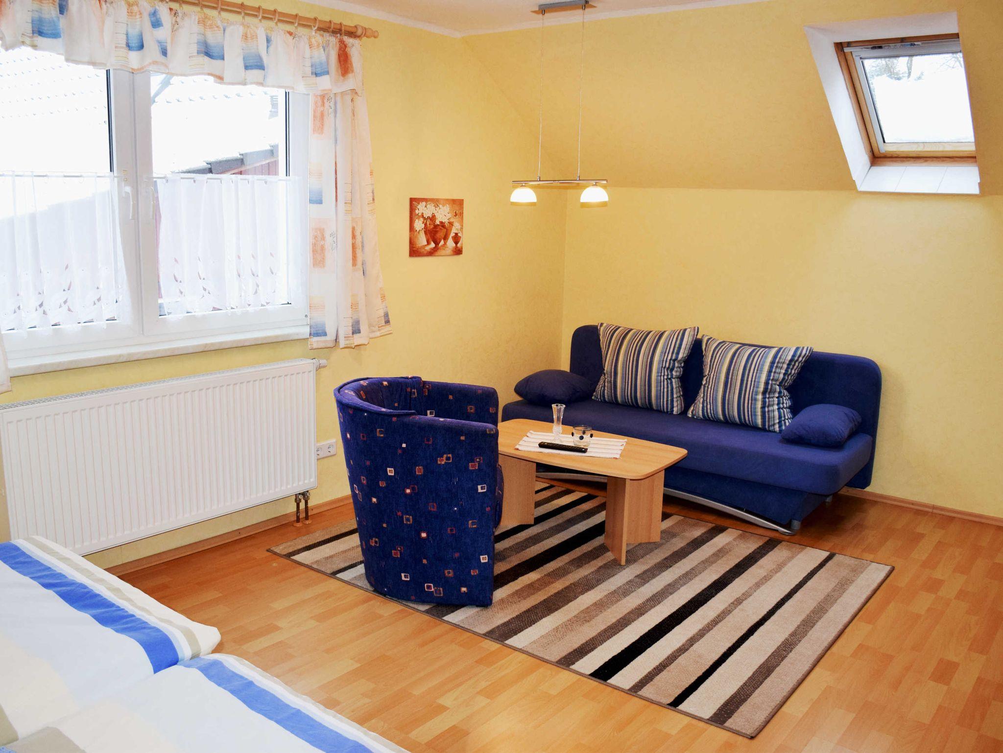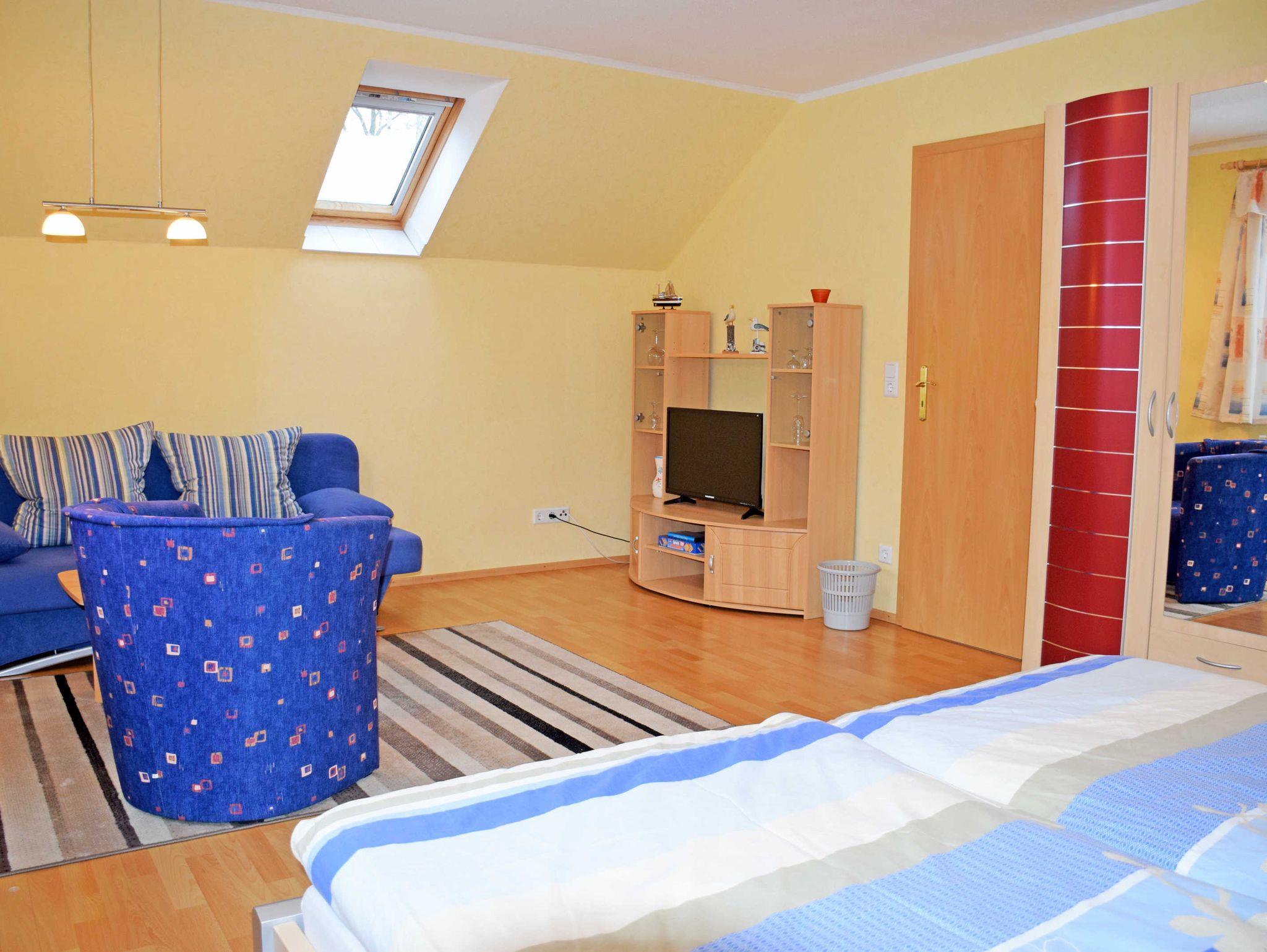 Im hellen und großen Wohn-Schlafzimmer befinden sich eine bequeme Sitzcouch mit Tisch und ein modernes TV-Gerät sowie ein Doppelbett mit Leselampe. Die separate Küche ist mit einem Herd, Wasserkocher, Kaffeemaschine, Toaster und Kühlschrank komplett ausgestattet. Für einen dritten Gast von 4 bis 16 Jahren kann die Couch im Wohnbereich aufgebettet werden. Bei Ihrer Anreise sind für Sie die Betten bereits mit Bettwäsche aufbezogen, Handtücher bitten wir Sie mitzubringen.