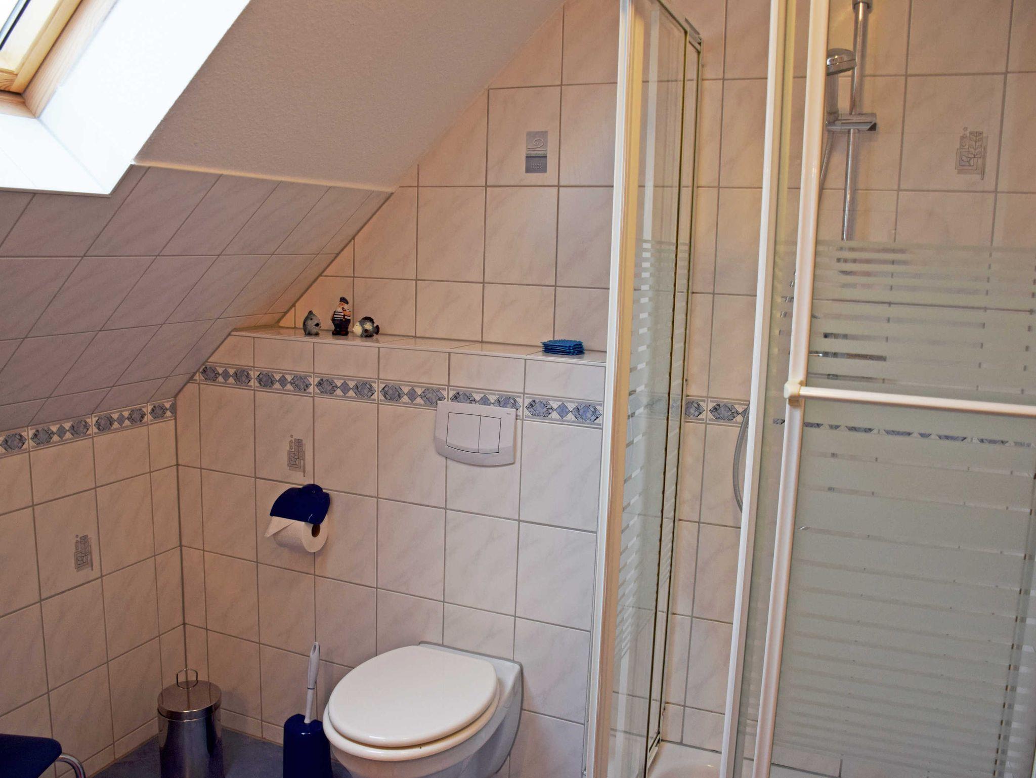 Das Bad ist mit Dusche, WC und Waschtisch ausgestattet und verfügt über Tageslicht. Zu dieser Ferienwohnung gehört auch ein kleiner Balkon mit Gartenmöbeln.