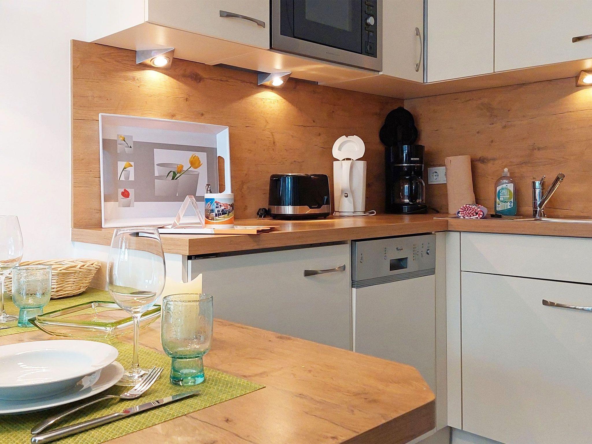 Hell, freundlich und Platz für 2-3 Personen: Die Nichtraucher-Ferienwohnung Strandkrabbe hat ein separates Schlafzimmer mit Doppelbett sowie ein Schlafsofa für eine dritte Person im Wohn- und Essbereich. Dort steht Ihnen auch der Fernseher sowie eine gut ausgestattete Küchenzeile zur Verfügung. Sie hat einen 4-Plattenherd, eine Spülmaschine, einen Kühlschrank mit Gefrierfach, eine Mikrowelle, eine Kaffeemaschine und einen Toaster.