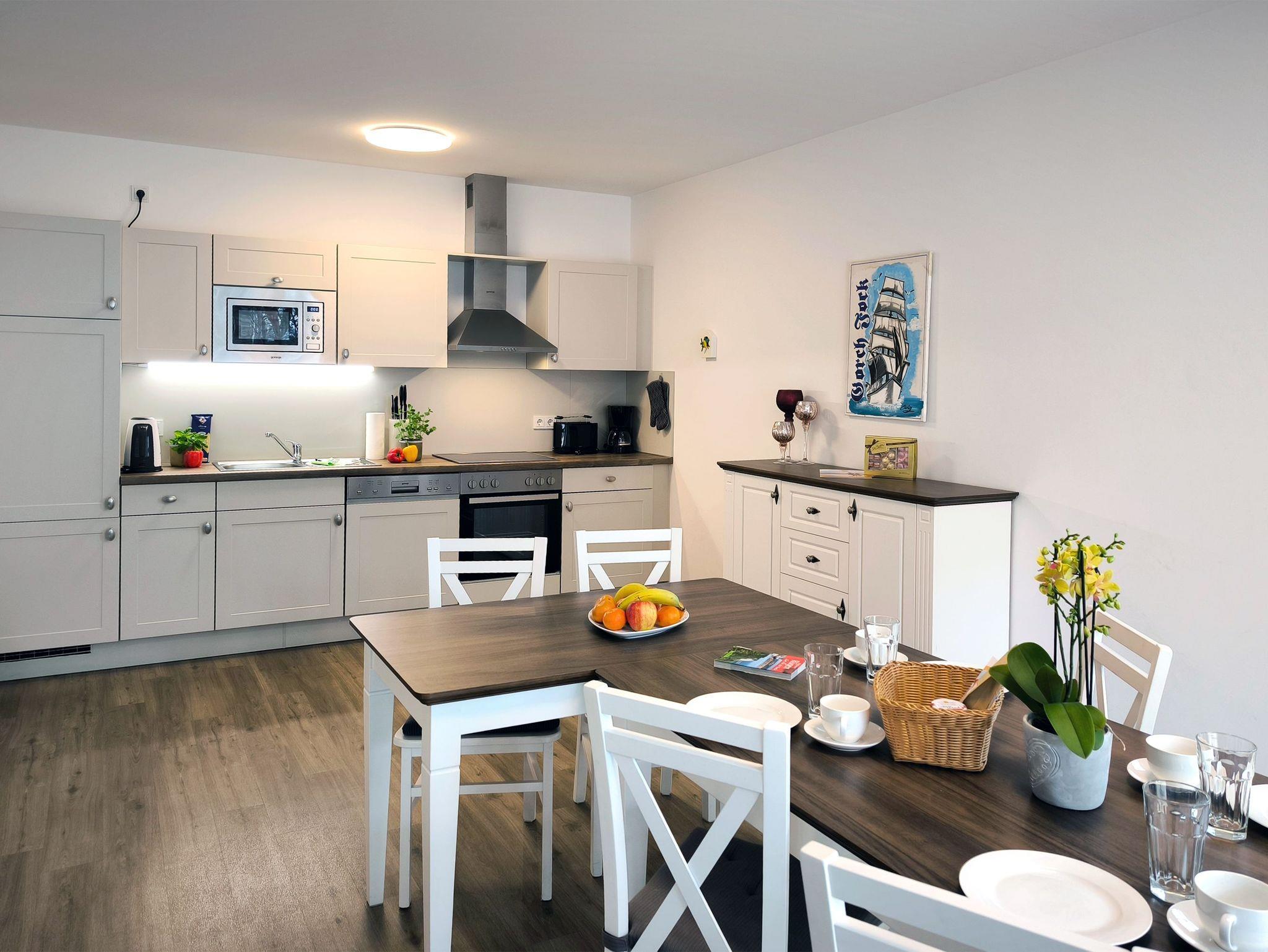 Es gibt 1 Doppelschlafzimmer und ein Zimmer mit 2 Einzelbetten und ein komfortables Schlafsofa im Wohnbereich und eine Küchenzeile mit Geschirrspülmaschine, Backofen, 4 Platten Ceranherd etc. Besonderer Komfort ist durch die 2 Bäder gegeben , eines mit Badewanne und eines mit Dusche. So können hier bequem bis zu 6 Personen übernachten.