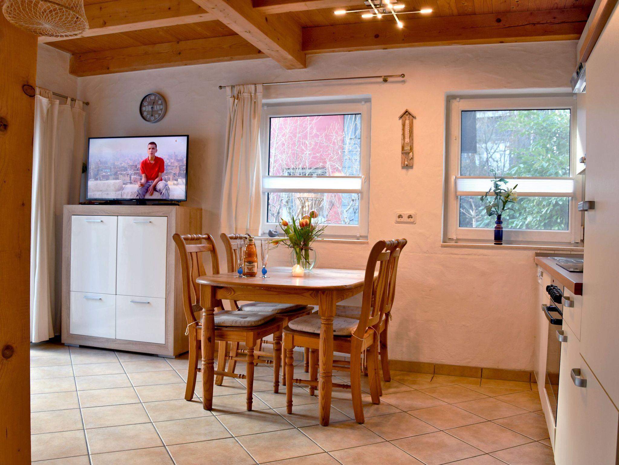 Im Erdgeschoss dominiert das geräumige Wohn- und Esszimmer mit integrierter Küchenzeile, Kaminofen und vorgelagerter Terrasse. Für mediale Unterhaltung sorgen ein großformatiger Flatscreen-TV und kostenfreies W-LAN, auch eine kleine Buch- und Spieleauswahl ist vorhanden.