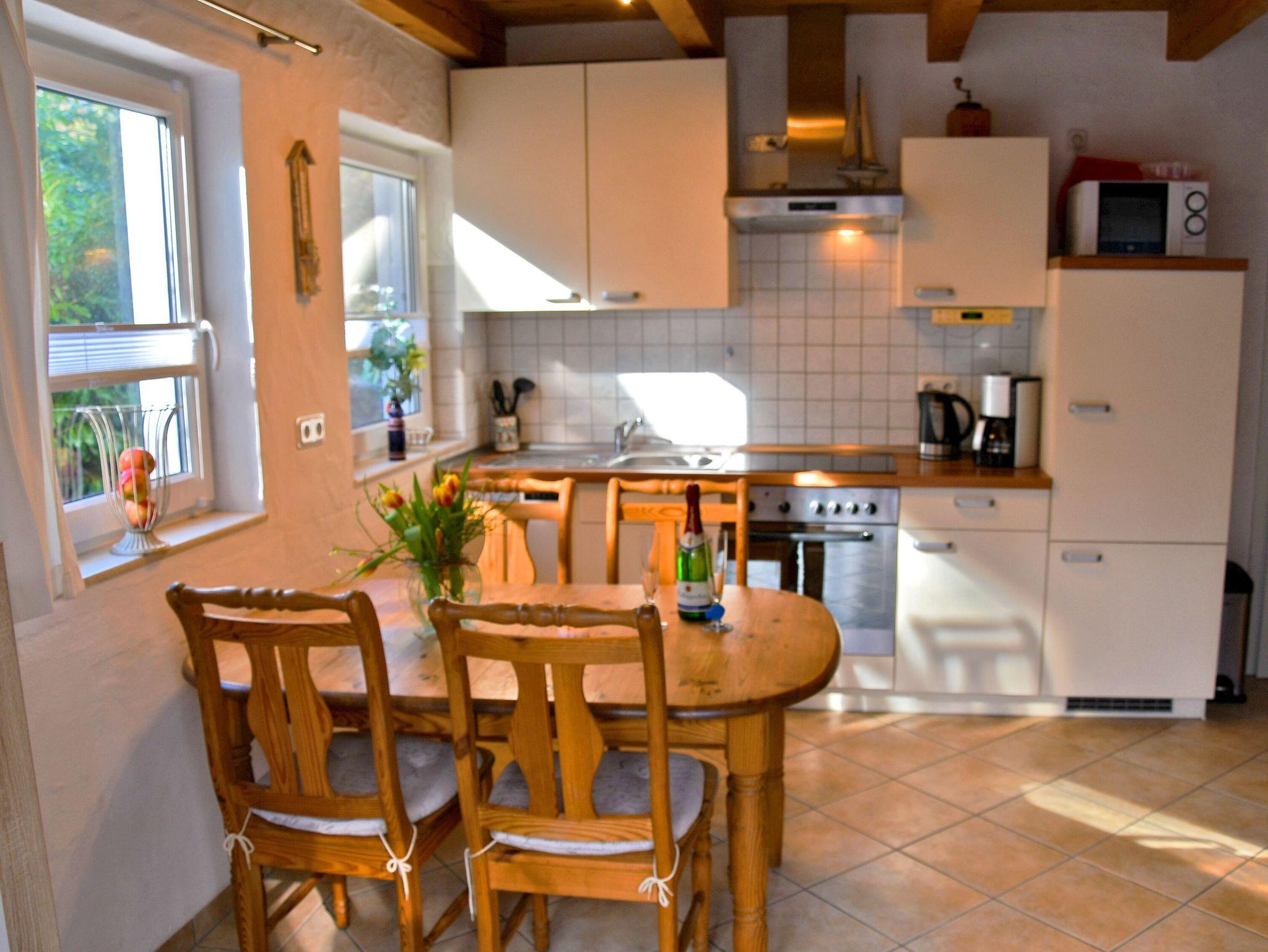 Die Küche bietet mit einem 4-Zonen-Ceranherd inklusive Backofen und Abzugshaube, einer Mikrowelle, Kühlschrank mit Gefrierfach, Geschirrspüler sowie Kaffeemaschine, Wasserkocher und Toaster alles, um sich bequem selbst zu versorgen. Bis zum nächsten Einkaufsmarkt mit Bäcker sind es nur wenige Gehminuten.