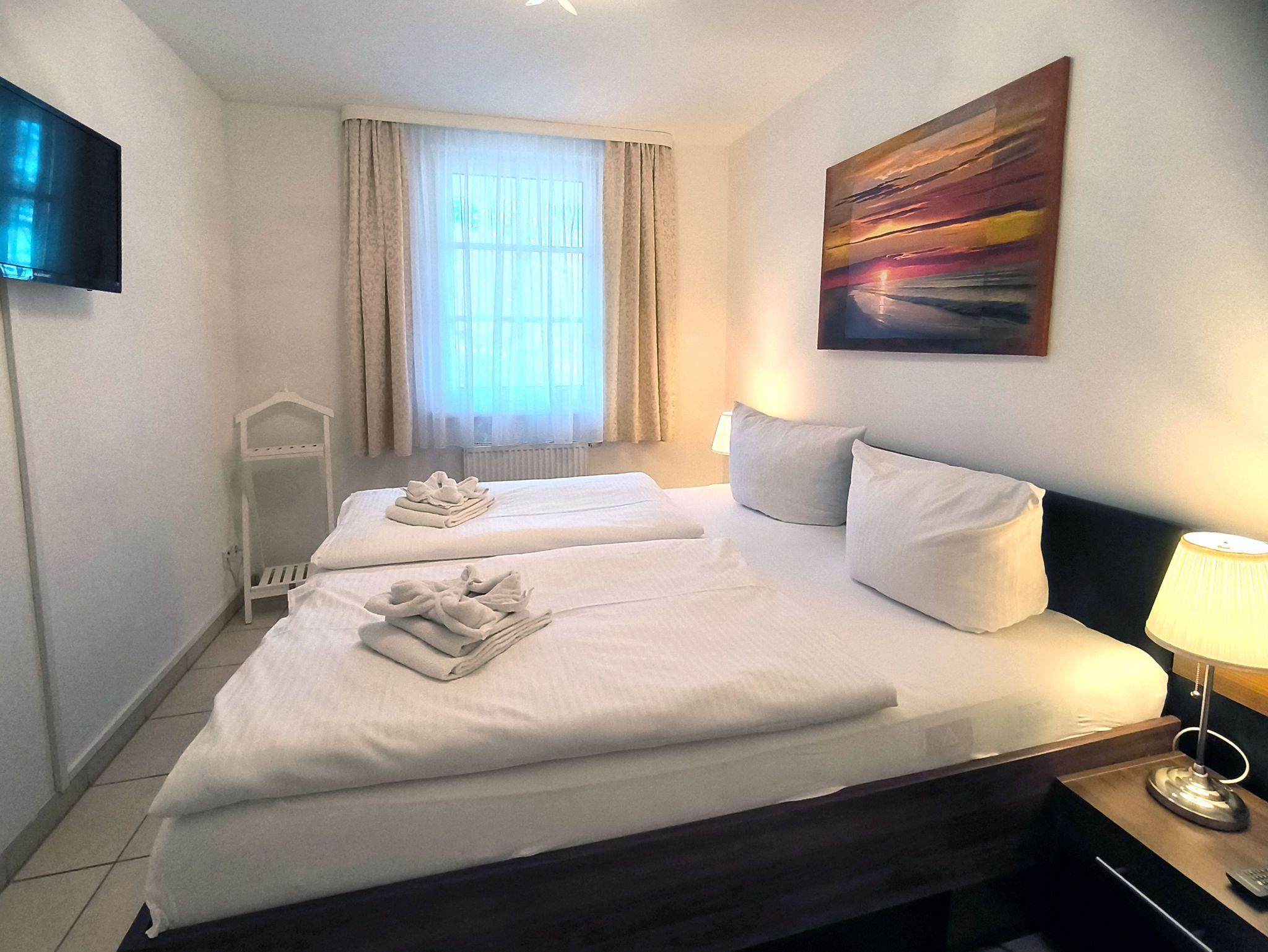 Das Schlafzimmer ist mit einem Doppelbett ausgestattet. Im Wohnzimmer steht ein Schlafsofa für zwei Personen bereit. Der Raum hat einen Fernseher, ein Radio und einen CD-Player. WLAN ist inklusive.
