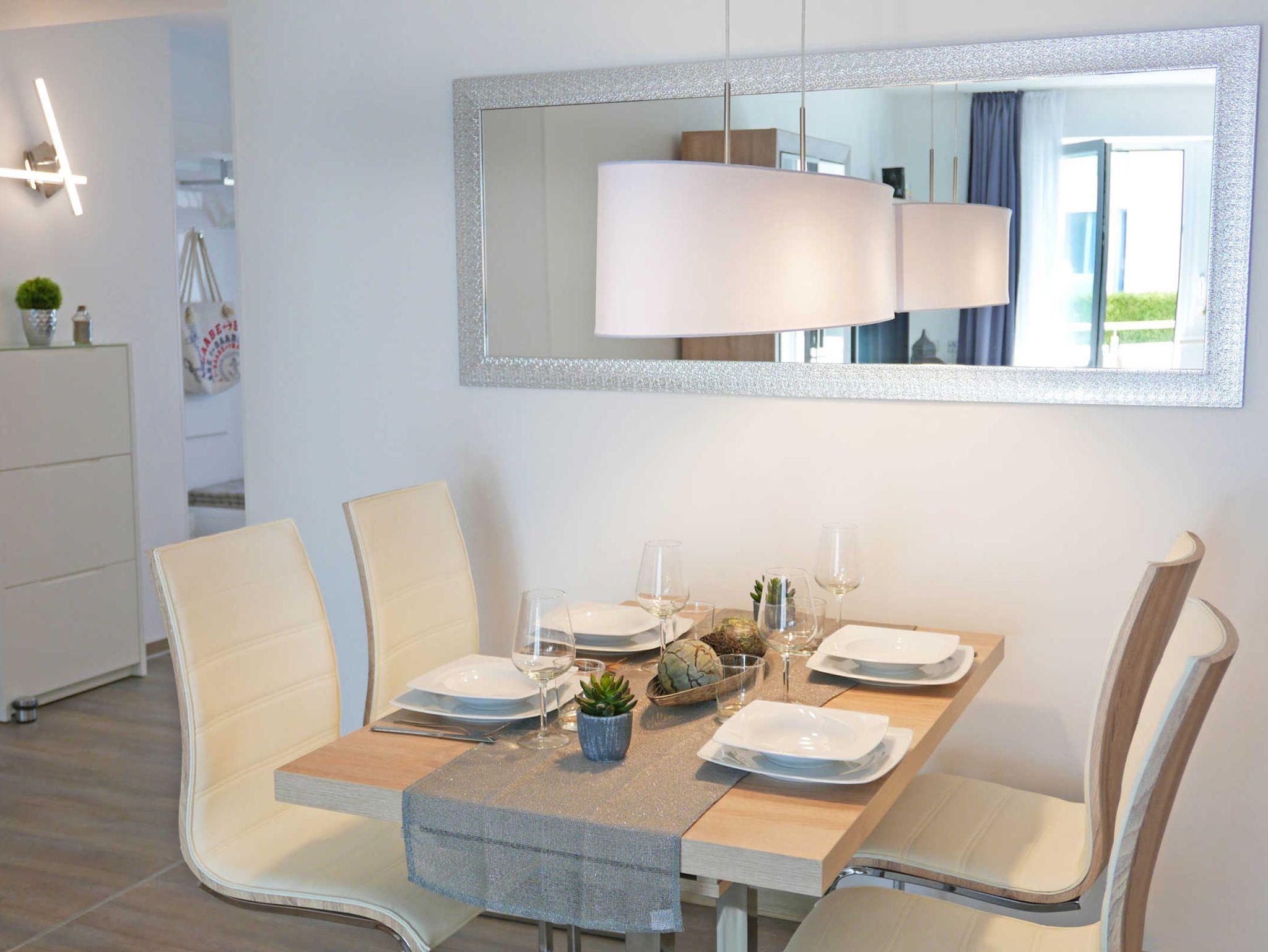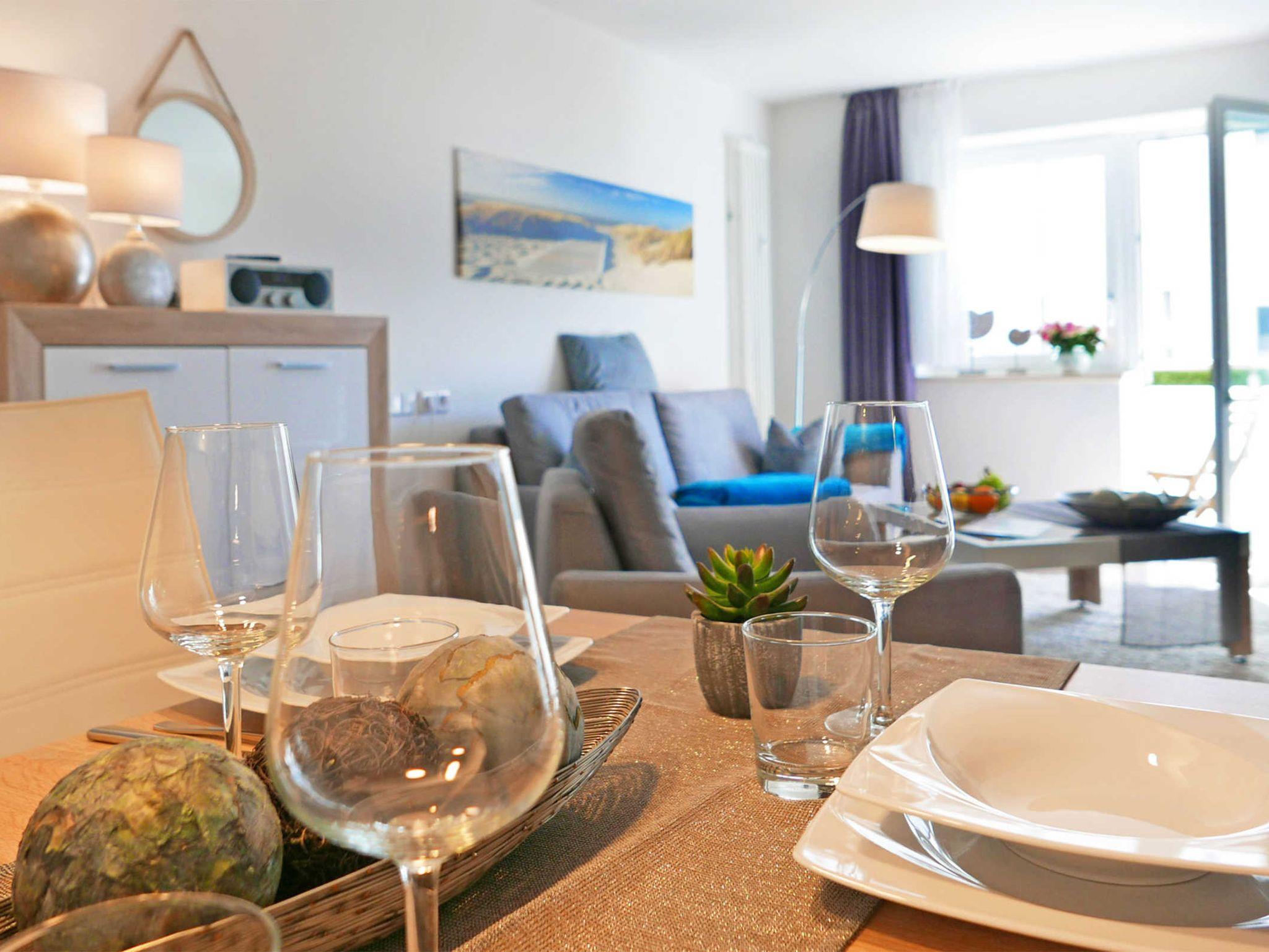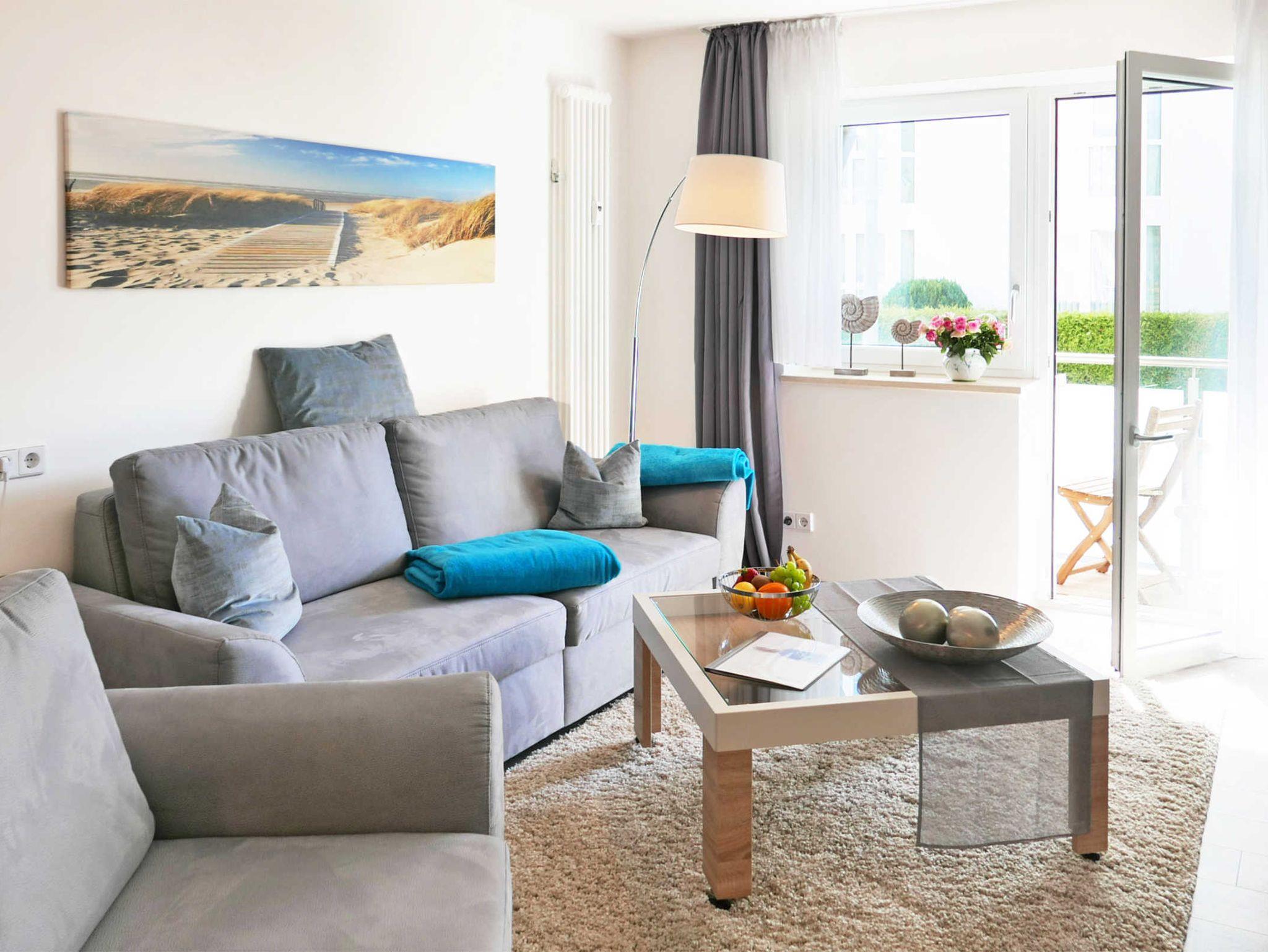 Helle 2- Zimmer-Ferienwohnung für bis zu 4 Personen mit gemütlicher Sofaecke und modernem Essbereich sowie Saunalandschaft, Fitnessraum, Aufzug, Parkplatz, und WLAN im Haus. Gelegen in der Strandstr. 31, direkt an der schönsten Straße von Baabe mit Blick bis zum Meer. Ein wundervoller Ort für Baabe. Mitten im Leben und doch ruhig. Das Meer vor Augen......