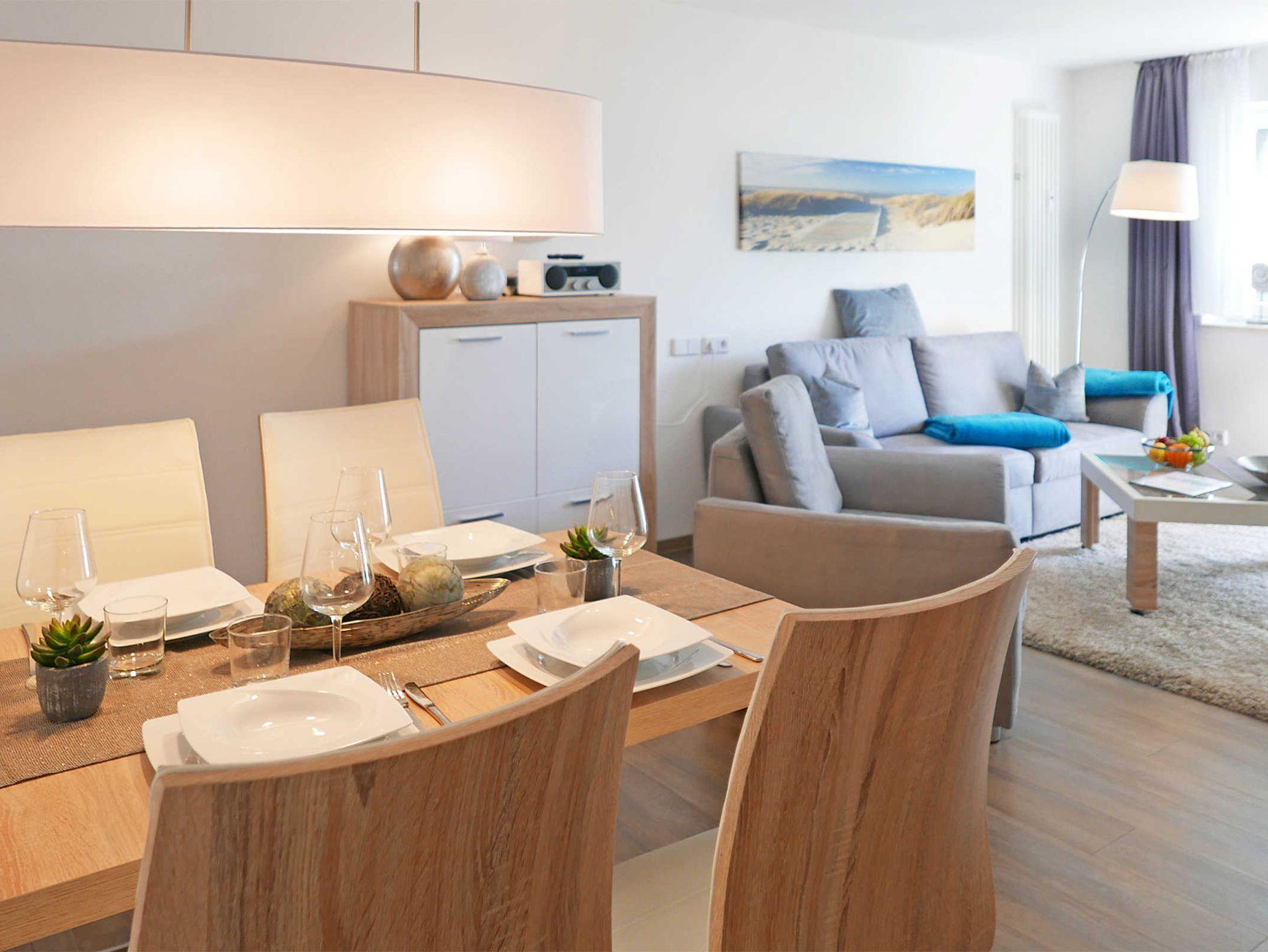 Modern eingerichtete Ferienwohnung in der 1. Etage mit Balkon in strandnähe. Das Schlafzimmer ist mit einem hochwertigem Boxspringbett (180x200cm) ausgestattet und verfügt zusätzlich über einen großen Fernseher. In dem Wohnzimmer finden Sie zum einen den ansprechenden Sofabereich mit großzügigem Flachbildfernseher, zum anderen einen Esstisch, der je nach belieben vergrößert werden kann. Das Sofa kann auf 180x200 oder einzeln zu 90x200 ausgezogen werden. In der Küchenzeile befindet sich ein Backofen, Herd, Kühlschrank mit Gefrierfach, Geschirrspülmaschine, Kaffeemaschine, Toaster, Wasserkocher und Mixer. Die Dusche im Bad ist ebenerdig. Auf dem Balkon befinden sich zwei Stühle und ein Tisch.