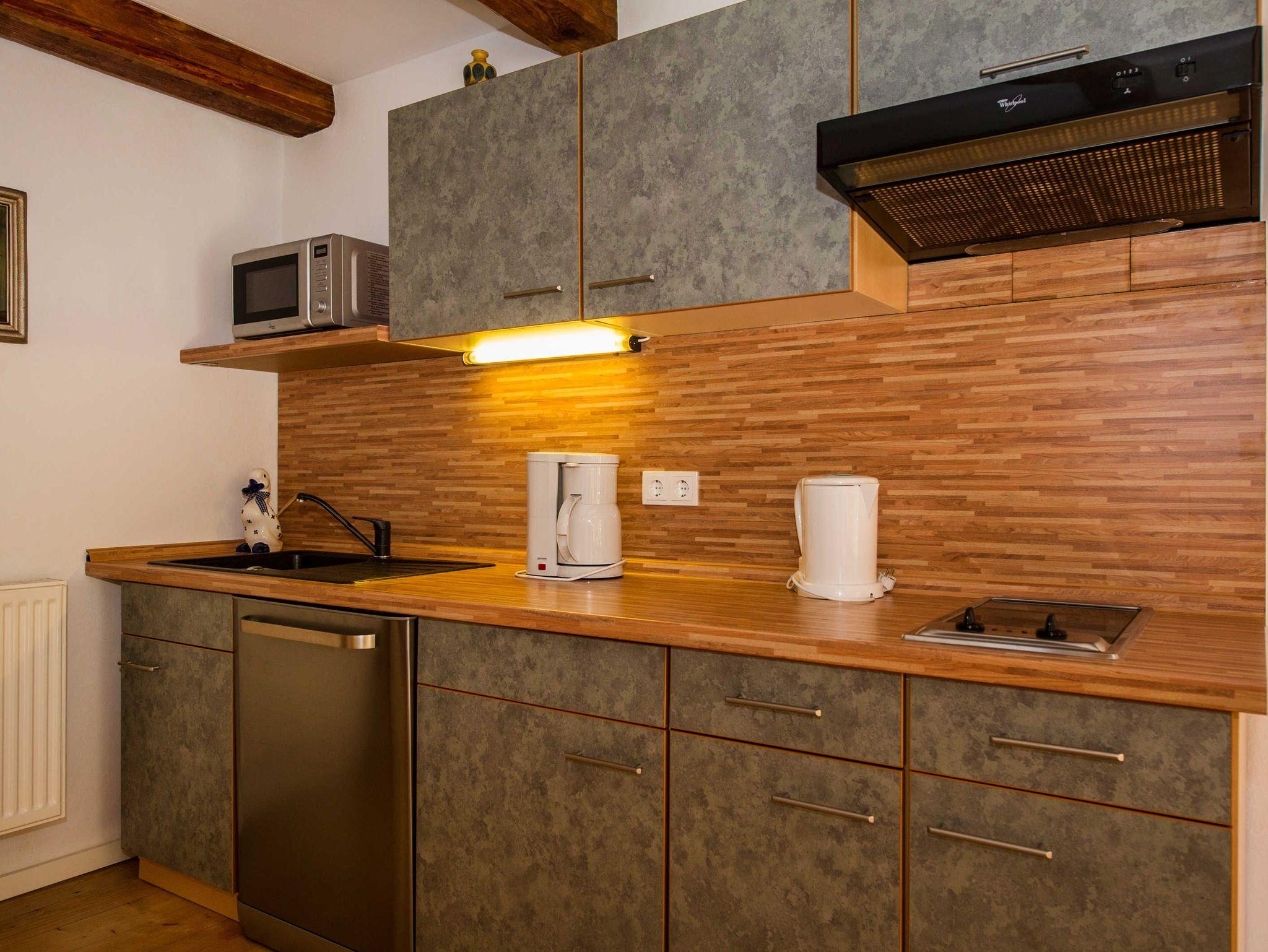Im Erdgeschoss befindet sich ein großer Eingangsflur. Von hier aus gelangt man in den großzügigen Wohnraum. Hier befindet sich eine Sitzcouch mit Tisch und Sessel und ein Flachbild-TV-Gerät sowie die Küchenzeile mit Esstisch und Stühlen. Die Küchenzeile ist mit einem Herd, Abzugshaube, Wasserkocher, Kaffeemaschine, Toaster, Spüle und Kühlschrank ausgestattet.