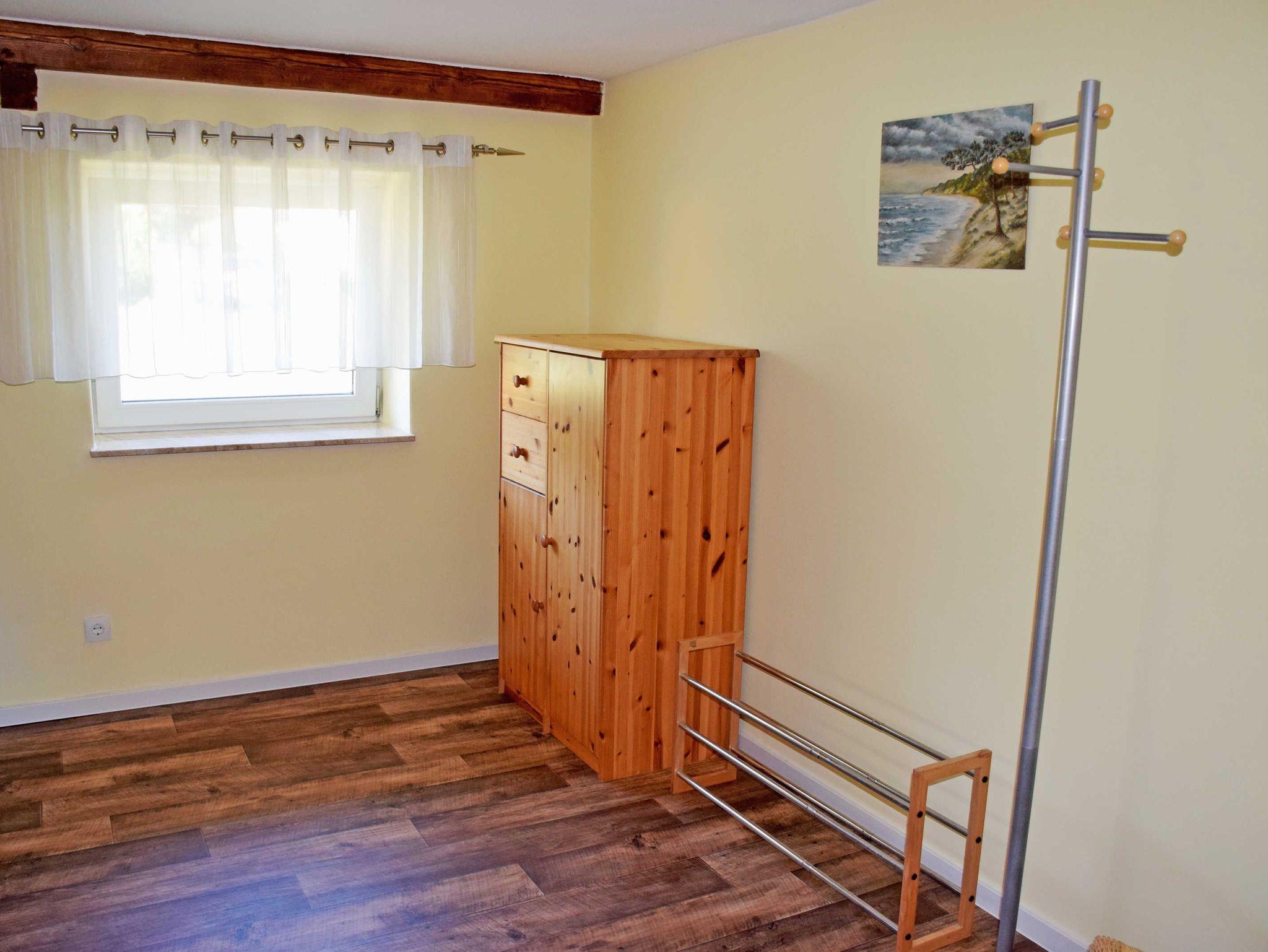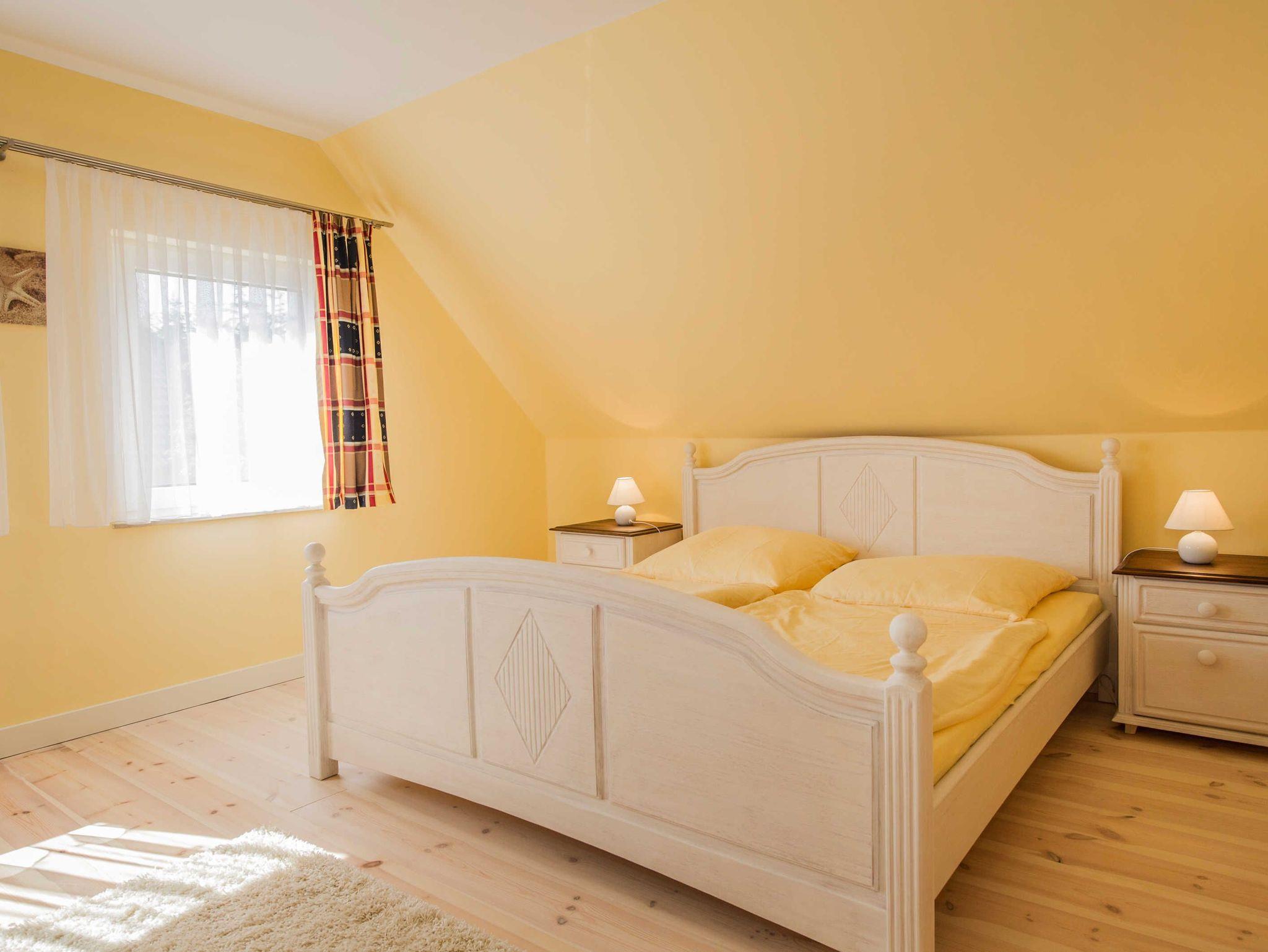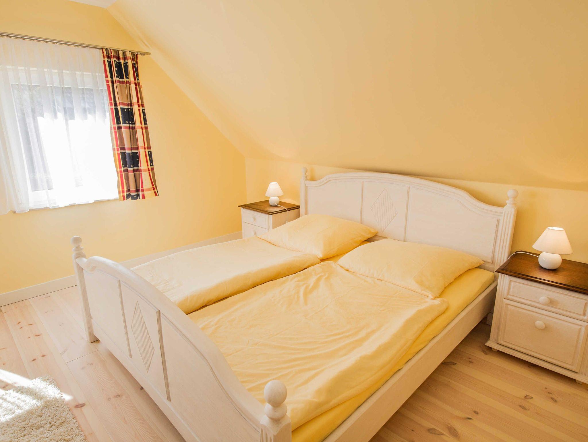Über eine Treppe gelangt man in das Obergeschoss, in dem sich das Schlafzimmer befindet, das ebenfalls mit bequemen Doppelbett mit Nachttischen und Leselampen, einem Einzelbett sowie Kleiderschrank ausgestattet ist.