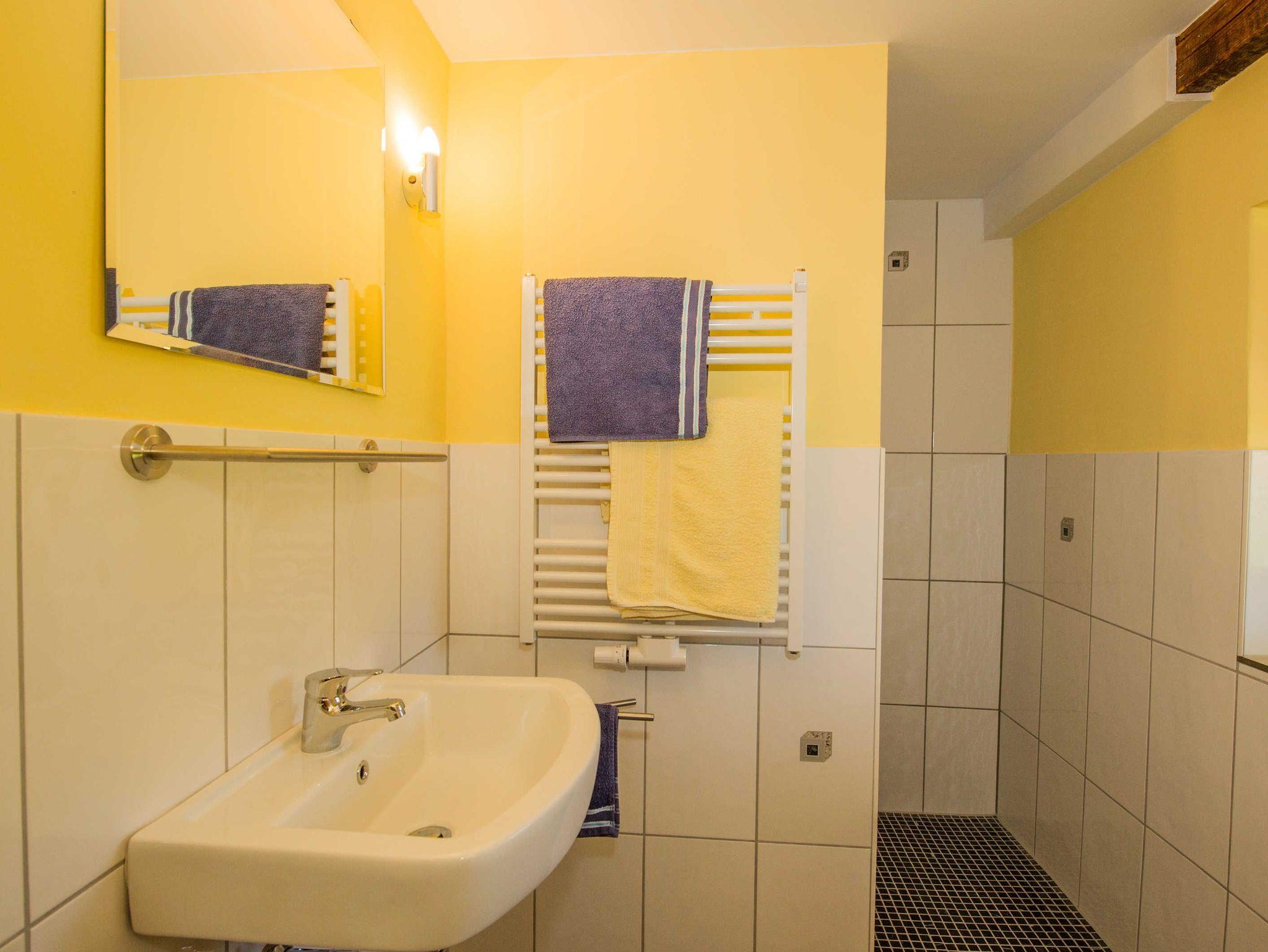 Das Bad ist mit Dusche, WC und Waschbecken ausgestattet.