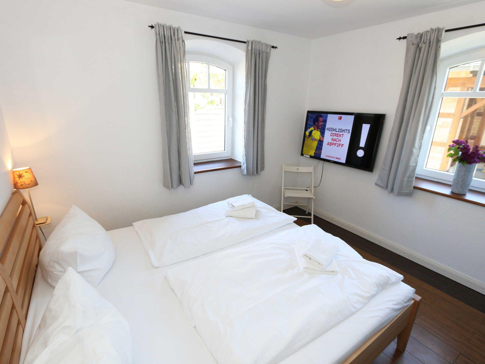Die großzügige Nichtraucherferienwohnung 01 befindet sich im Erdgeschoss des Hauses. Mit Ihren ca. 60 m² bietet Sie ausreichend Platz für max. 4 Erwachsene. Die Raumaufteilung ist in 2 nebeneinander liegenden Schlafräumen, ein großzügiges Badezimmer, Wohnbereich und separater Küche aufgeteilt. Der gemütliche Wohnbereich umfasst eine große Couchecke mit Couchtisch, Leselampe, Sideboard, Flachbild-TV und Mini-Stereo-Anlage. An kühleren Tagen sorgt ein Kamin für zusätzliche Wärme. Auch auf einen Internetanschluss (WLAN) brauchen Sie im Urlaub nicht verzichten. Dieser ist inklusive für Sie. Die separate und vollausgestattete Küche verfügt über einen Geschirrspüler, Backofen mit Ceranfeld und Abzugshaube, Kühlschrank mit Eisfach, Mikrowelle, Kaffeemaschine, Toaster, Wasserkocher und diverse Küchenutensilien. Ein Esstisch rundet diesen Bereich ab. Das größere Schlafzimmer wurde mit einem Doppelbett (1,80 m x 2,00 m), verstellbaren Lattenrosten, einem großen Kleiderschrank und einem Flachbild-TV ausgestattet. Das kleinere Schlafzimmer verfügt über zwei Einzelbetten (je 0,80 m x 2,00 m) und einer Kommode. Das moderne Bad ist mit einer Badewanne, Waschplatz, WC, Fön und ebenerdiger Dusche eine kleine Wellnessoase. Alle Räumlichkeiten sind gefliest und mit einer Fußbodenheizung versehen worden. Die bestuhlte Terrasse (Süd/West) erreichen Sie vom Wohnbereich, wo Sie Ihren Urlaubstag bei einem Glas Wein und einem Grillabend planen und ausklingen lassen können. Mit einem eigenen und mitgebrachten Schlafplatz sind max. 2 Haustiere gegen eine Gebühr gern gesehene Gäste. Ihre mitgebrachten oder auch geliehenen Fahrräder können Sie im Schuppen unterstellen. Im separaten Waschhaus können Sie gegen eine Kasse des Vertrauens eine Waschmaschine und einen Trockner nutzen. Ein PKW-Stellplatz mit Ladestation befindet sich direkt am Haus. Die Erstausstattung eines Wäschepaketes (komplette Bettwäsche, 1 Duschhandtuch, 1 kleines Handtuch) können Sie bis 14 Tage vor Anreise gegen einen Aufpreis dazu buchen oder durch eigene ergänzen. Ab 2 gebuchten Paketen erhalten Sie einmalig 1 Geschirrhandtuch und 1 Duschvorleger hinzu.