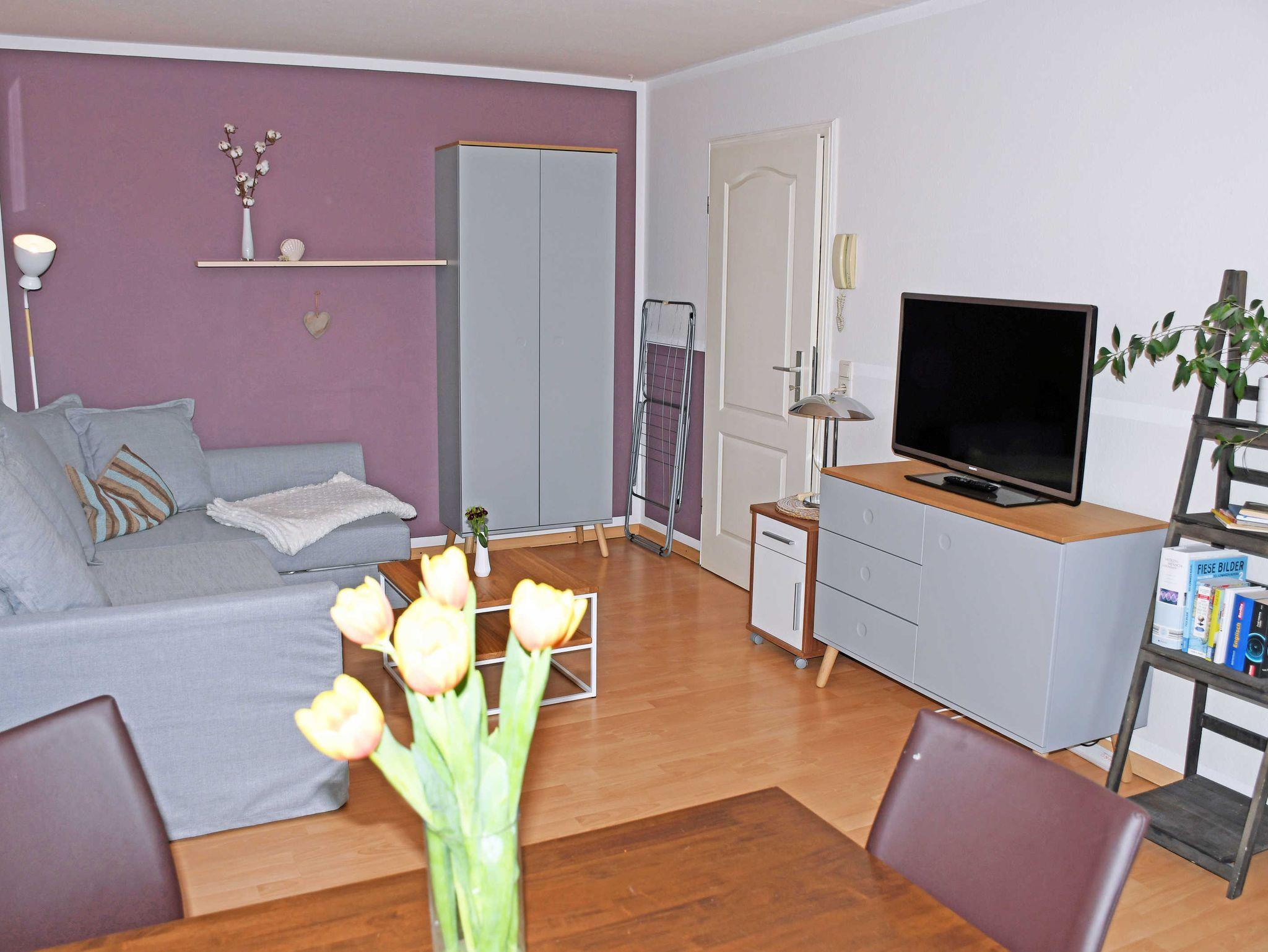 In der hell und freundlich kombinierten, Wohnraum befinden sich eine Schlafcouch, ein TV-Gerät und ein Esstisch mit Stühlen. Vom Wohnzimmer aus gelangt man auf den großen Balkon mit Gartenmöbeln und Sonnenschirm, der einen schönen Ausblick auch auf den Selliner See hat.