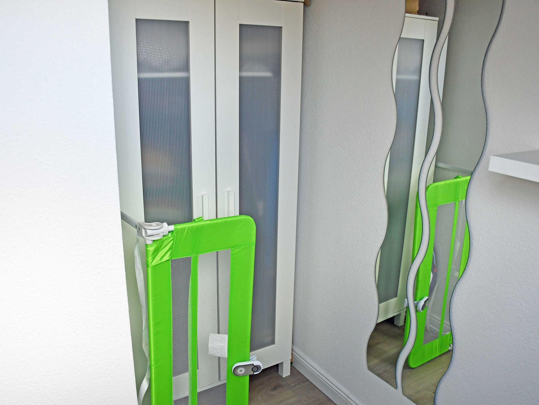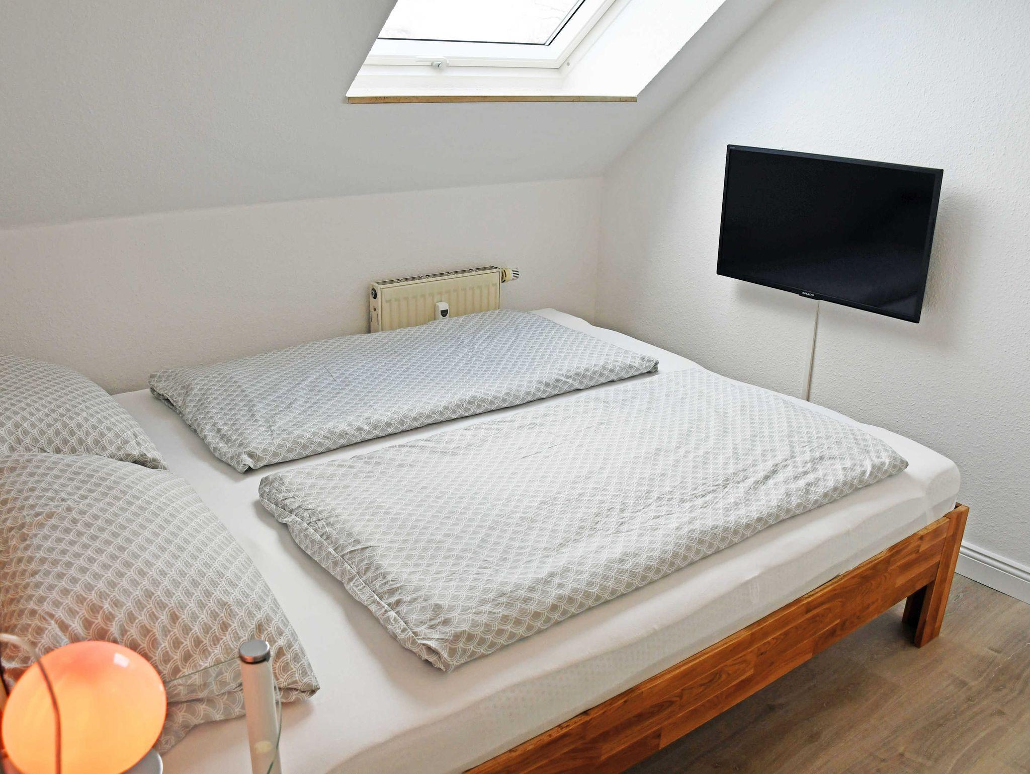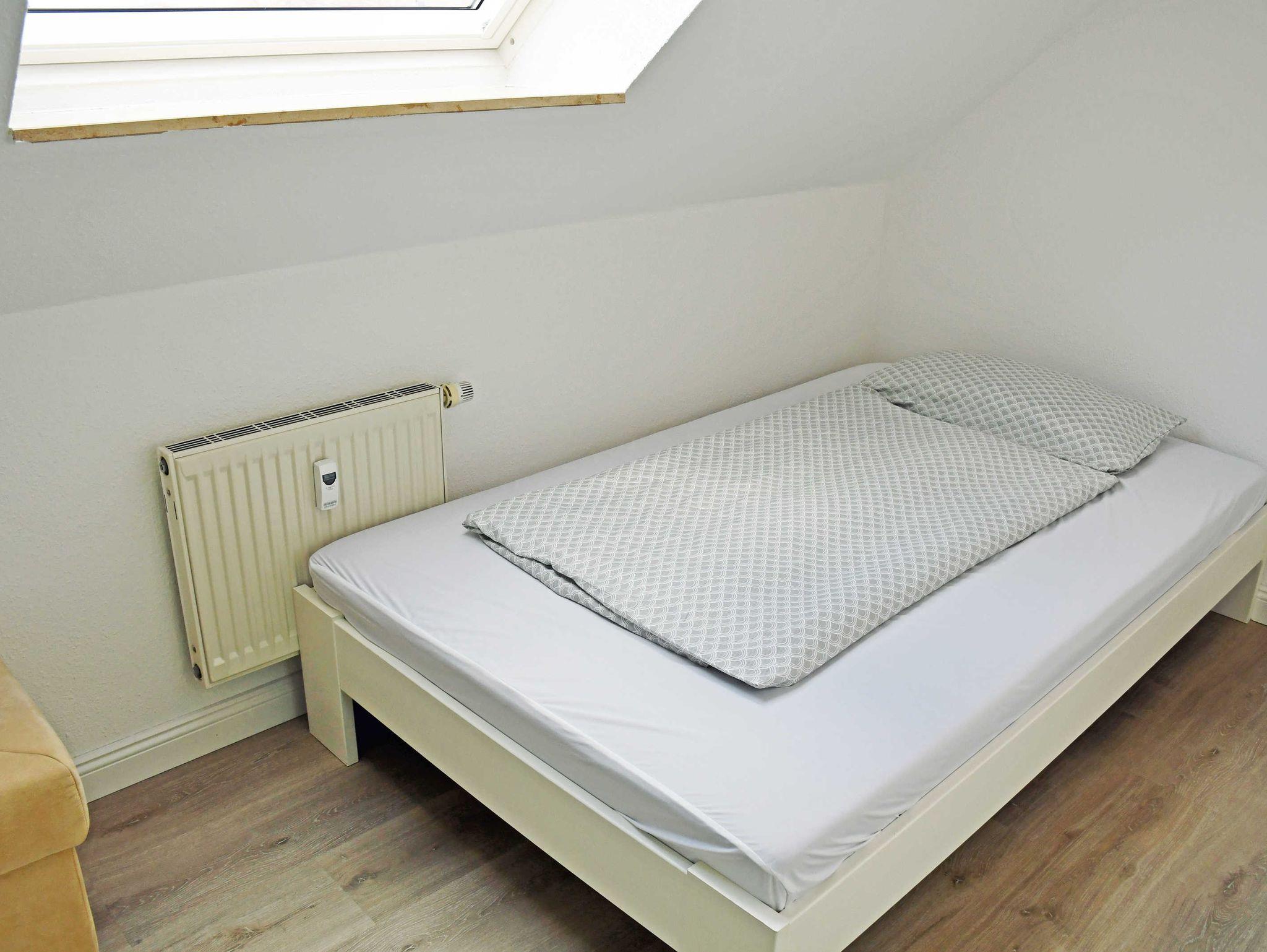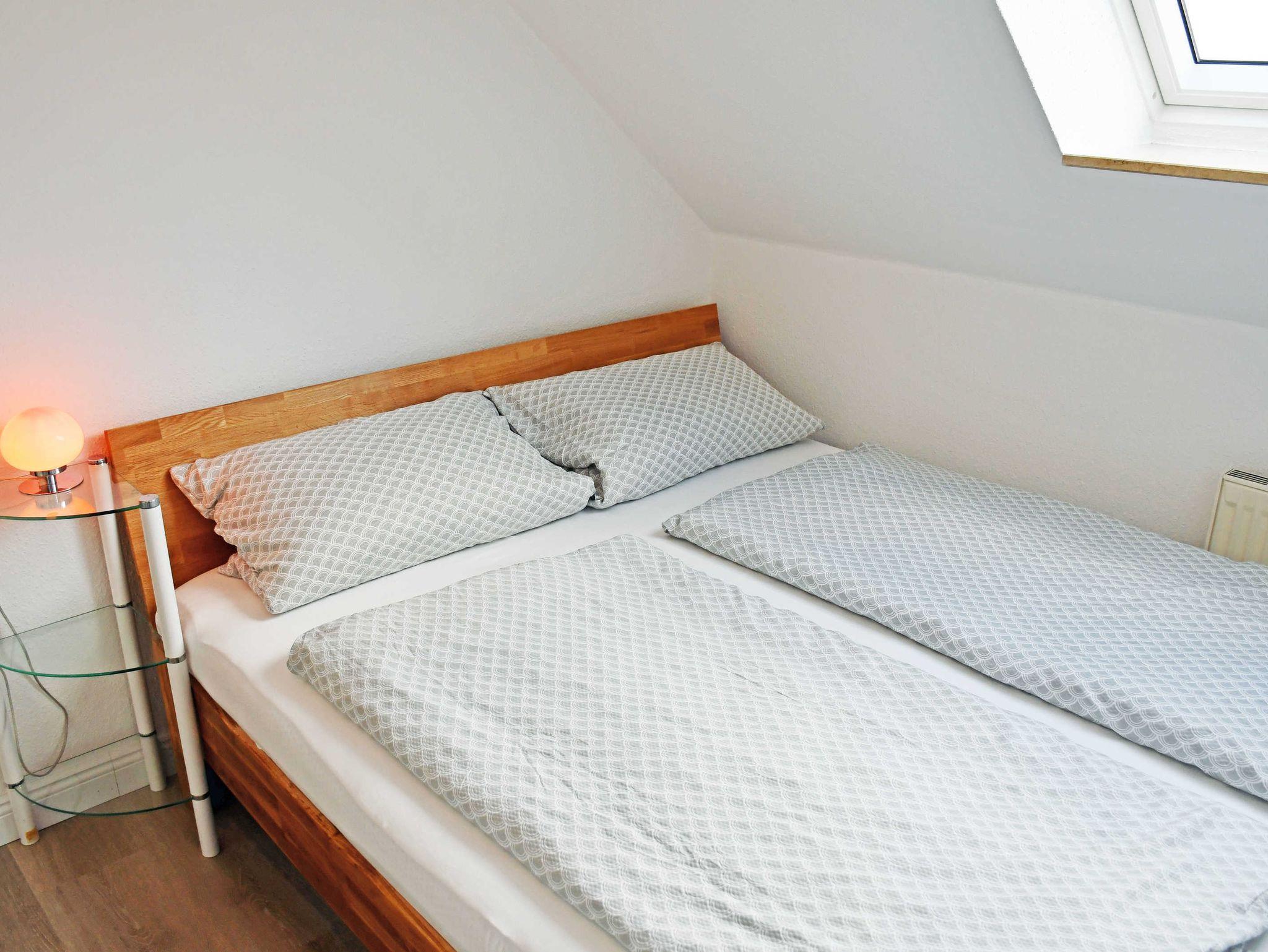 Über eine steile Treppe im Wohnungsflur gelangt man in das Dachgeschoss der Wohnung mit den beiden Schlafzimmern. Im ersten Schlafzimmer befindet sich ein bequemes Doppelbett (1,60m breit) mit einem Nachttisch und Leselampe. Im zweiten Schlafzimmer steht ein Einzelbett mit Nachttisch und Leselampe sowie Kleiderschrank.