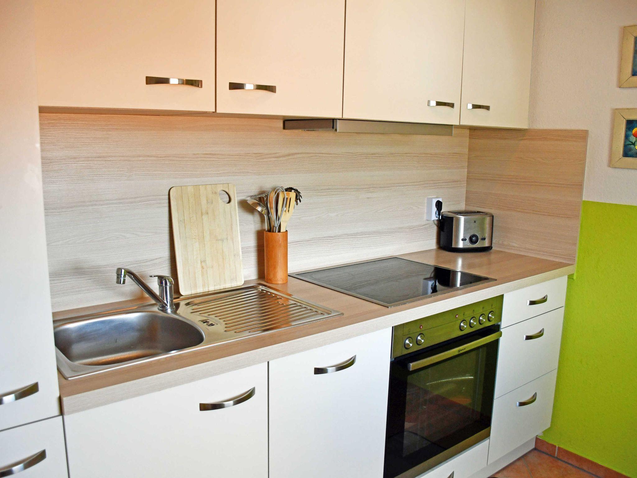 Die moderne Küche ist mit Cerankochfeld, Kühlschrank mit Gefrierfach, Geschirrspüler, Kaffeemaschine, Wasserkocher, Toaster und diversen Küchenutensilien bestens ausgestattet.
