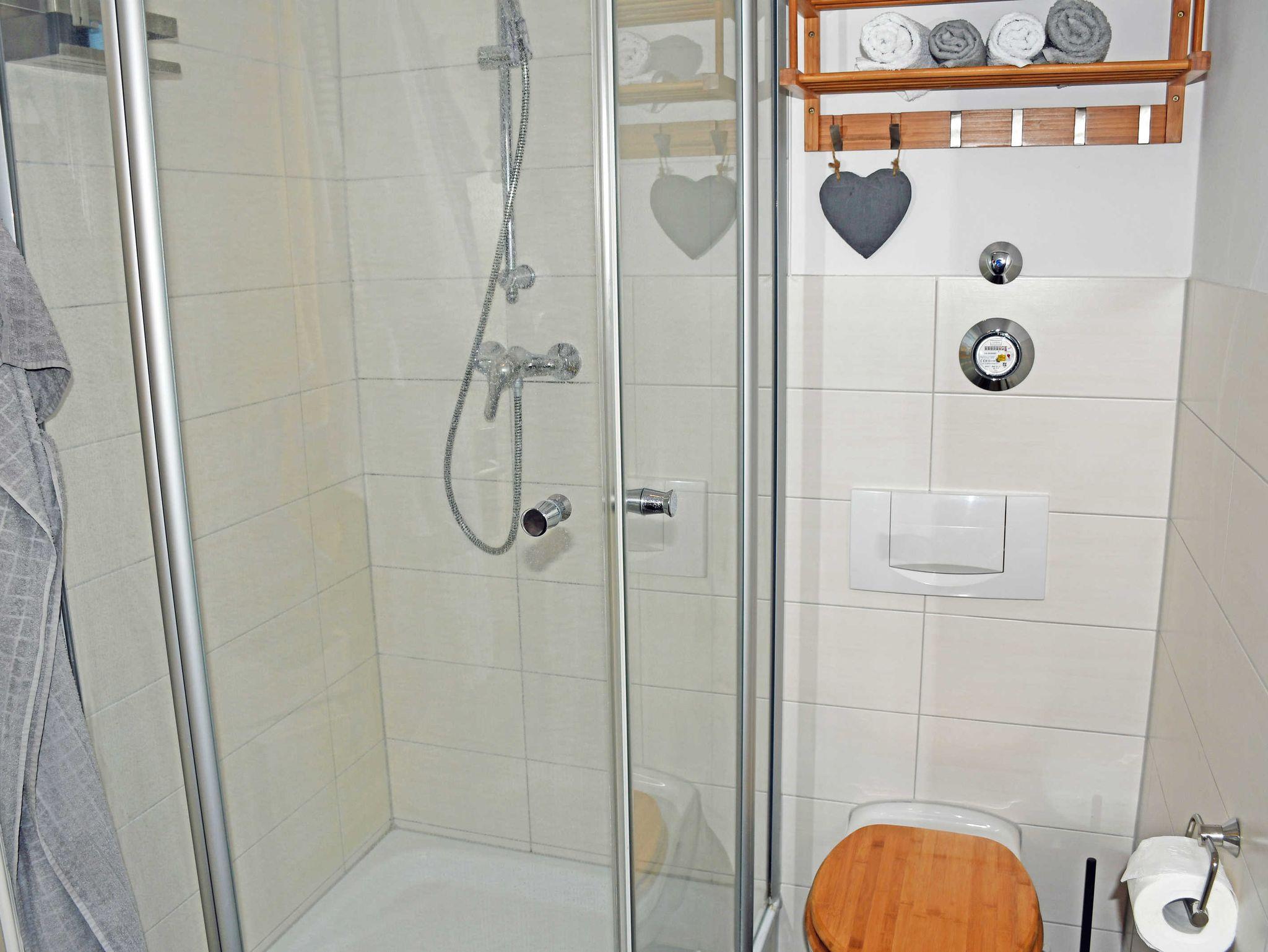 Das moderne Bad ist mit Dusche, WC, Handtuchtrockner und Waschbecken ausgestattet.