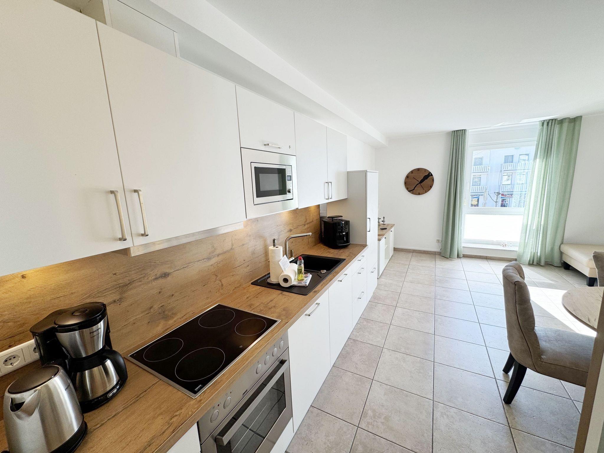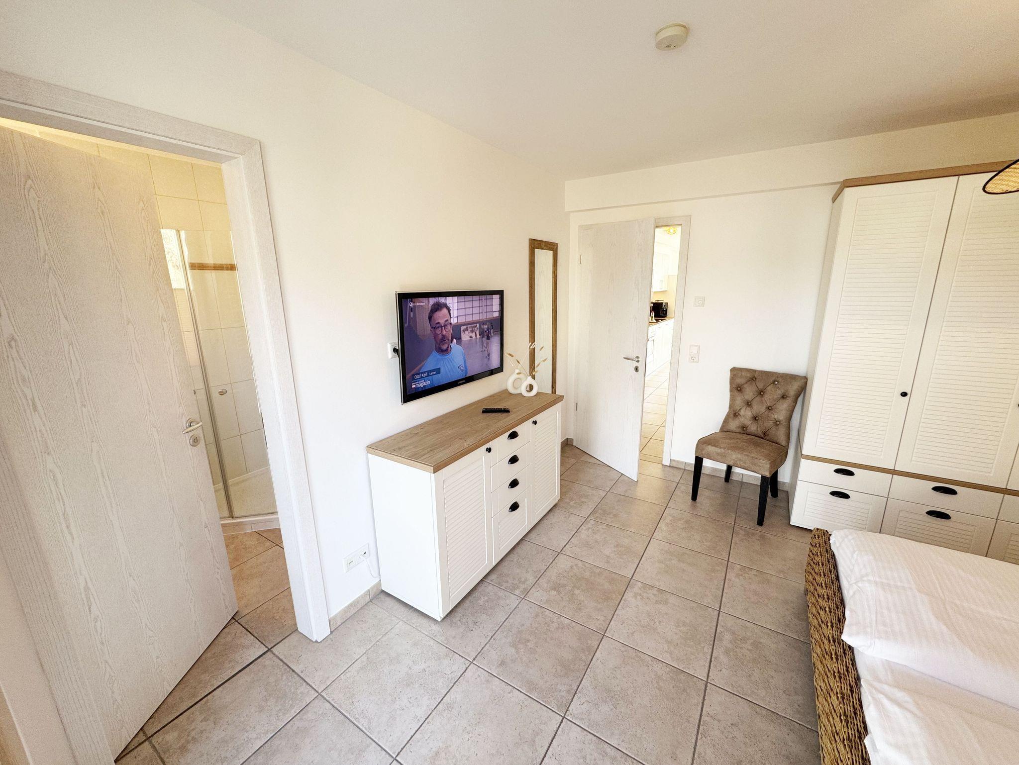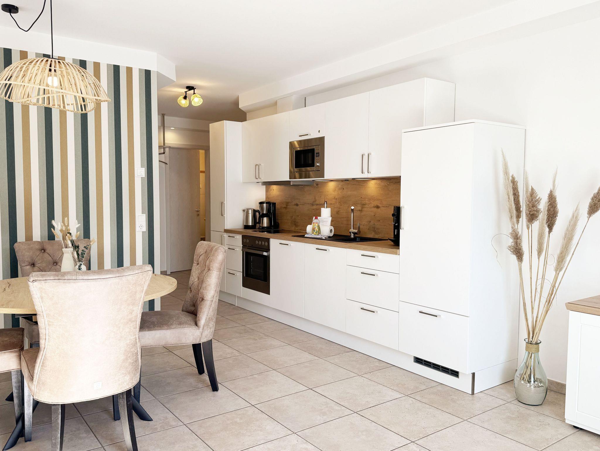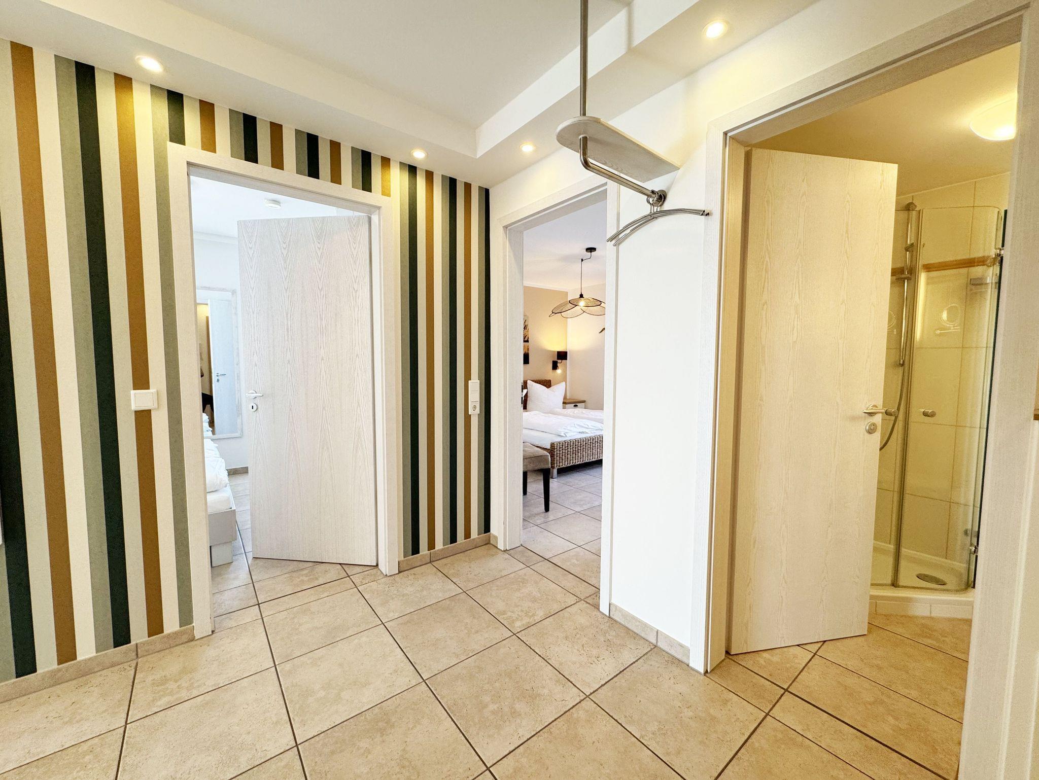 Sie wohnen auf ca. 70 m² in einer 3-Raum-Ferienwohnung für max. 2 bis 4 Personen. Die Nichtraucherferienwohnung befindet sich in der Villa Salus, in der 1. Etage. Der Eingangsbereich ist mit einer Garderobe, einem Ganzkörperspiegel und einer Sitzbank versehen. Von hier gelangen Sie in den Wohn-/Essbereich, der Ihnen mit seinen bodentiefen Fenstern eine helle und lichtdurchflutete Atmosphäre bietet. Der gemütliche Wohnbereich bietet Ihnen eine Couch, einen Couchtisch, beleuchtete Vitrine, ein TV-Board mit Smart-TV sowie ein DAB-CD-Radio und USB-Anschluss. Der technische Bereich wird mit einem inklusiven WLAN-Zugang abgerundet. Von hier gelangen Sie auf Ihren bestuhlten Balkon (West) mit Sonnenschirm. Die angrenzende Küchenzeile ist mit einem Backofen, einem Ceranfeld, einer Mikrowelle, einer Spülmaschine, einem Kühlschrank mit Gefrierfach, einer Kaffeemaschine, einem Wasserkocher, einem Toaster, einem Mixer, einem Pürierstab sowie Küchenhelfern ausgestattet. Abgerundet wird der Bereich mit einem Esstisch. Das erste Schlafzimmer verfügt über ein Doppelbett (1,80m x 2,00m) mit Nachttischablagen, verstellbare Lattenroste, einen Ganzkörperspiegel, einen Kleiderschrank sowie ein Smart-TV. Von hier gelangen Sie direkt in eines der beiden Bäder, welches mit einer Dusche (flacher Einstieg), einem Waschplatz, einem WC, einem Handtuchheizkörper, einem Kosmetikspiegel, einem Fön und Fenster ausgestattet ist. Das zweite Schlafzimmer verfügt über ein Doppelbett (1,80m x 2,00m) mit Nachttischablagen, verstellbare Lattenroste, einen Ganzkörperspiegel, einen Kleiderschrank sowie einen Schreibtisch. Von hier haben Sie auch einen Zugang zu ihrem West-Balkon. In beiden Schlafzimmern sorgen Insektenschutzgitter für einen angenehmen Schlaf. Das 2. innenliegende Badezimmer erreichen Sie vom Flurbereich, welches ebenfalls mit einer Dusche (flacher Einstieg), einem Waschplatz, einem WC und einem Handtuchheizkörper ausgestattet ist. Für eine wohlige Wärme sorgt die in der gesamten Wohnung verlegte Fußbodenheizung. In der gesamten Wohnung können Sie sich über Außenrollläden freuen. Für unsere kleinen Gäste stehen ein Hochstuhl sowie ein Kinderreisebett (inklusive Zusatzmatratze) zur Verfügung. Reinigungsutensilien sowie ein Wäscheständer stehen Ihnen zusätzlich zur Verfügung. Haustiere sind nicht erlaubt. Ihre mitgebrachten oder auch geliehenen Fahrräder können Sie im zugehörigen eigenen Abstellraum im Erdgeschoss unterstellen. Hier können Sie auch eine Waschmaschine, einen Trockner sowie ein Bügelbrett und ein Bügeleisen nutzen. Ihr eigener Stellplatz (Nr. 04) befindet sich direkt hinter dem Haus. Die Erstausstattung eines Wäschepaketes (komplette Bettwäsche, 1 Duschhandtuch, 2 kleine Handtücher) können Sie bis 14 Tage vor Anreise gegen einen Aufpreis dazu buchen oder durch Eigenes ergänzen. Ab 2 gebuchten Paketen erhalten Sie einmalig 1 Geschirrhandtuch und 1 Duschvorleger hinzu.