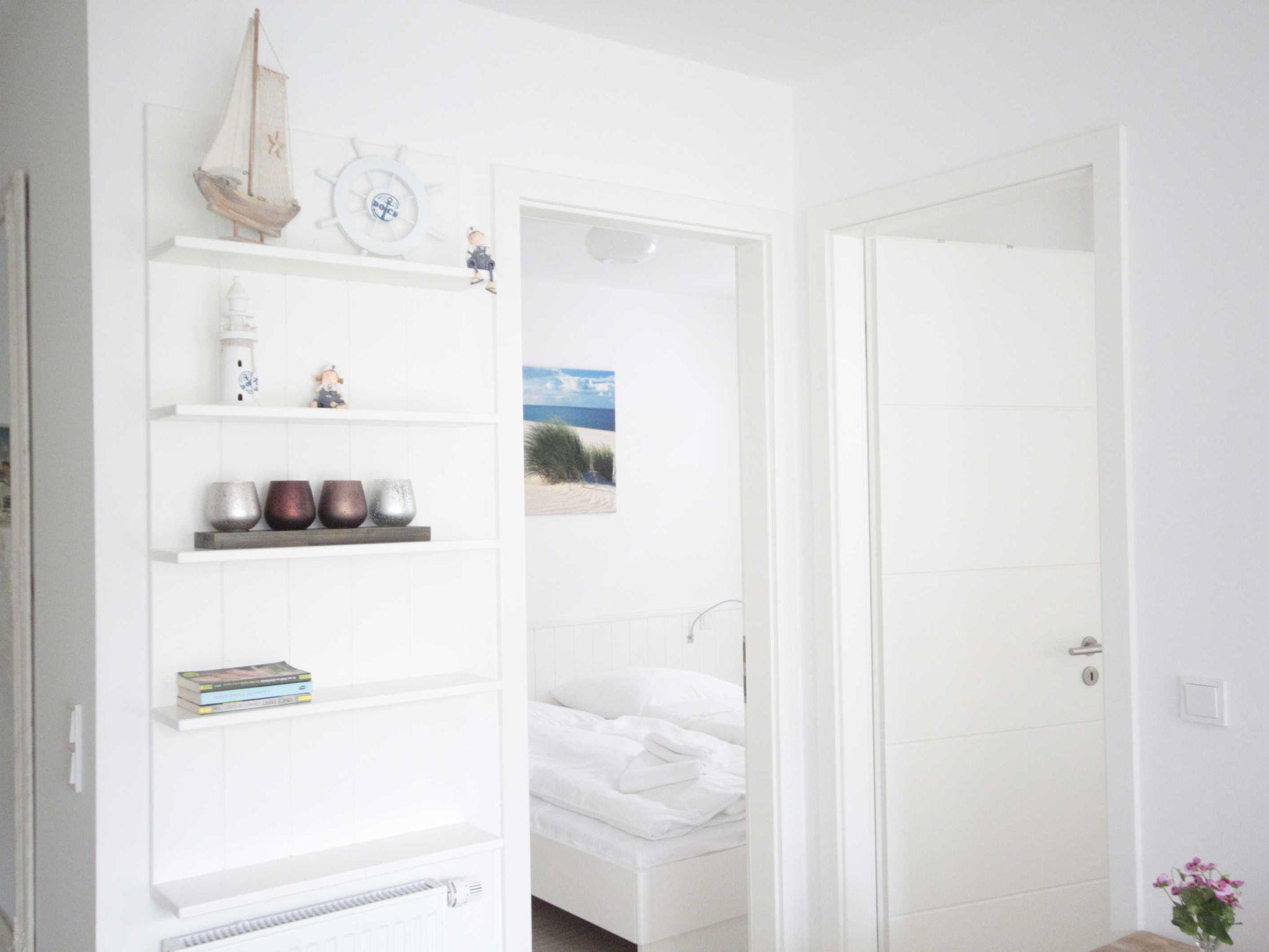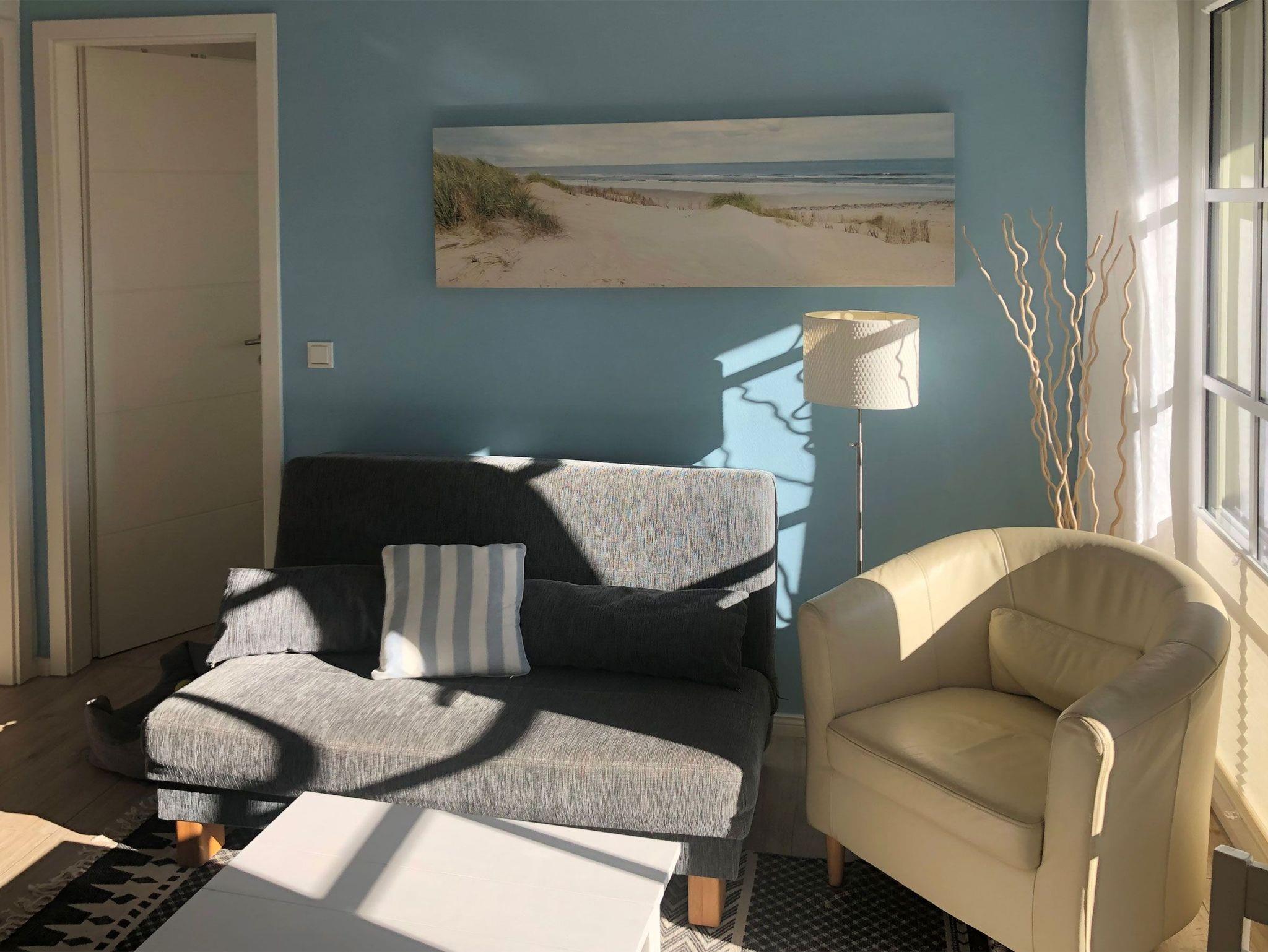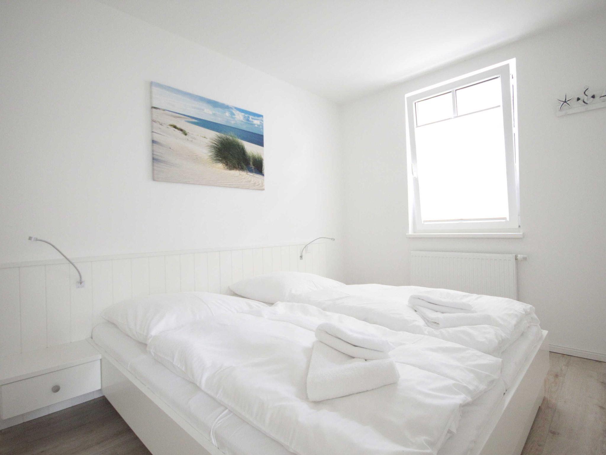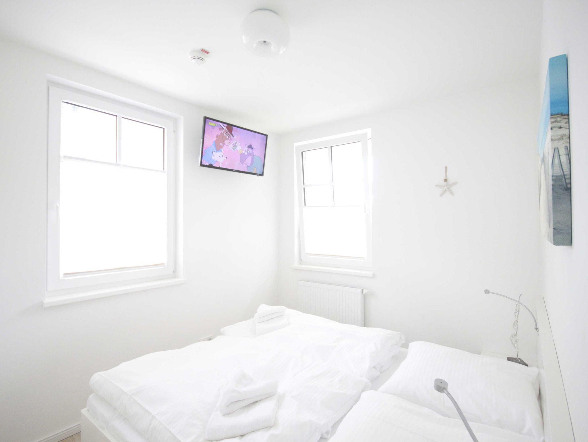 Helle moderne 3 Zimmerwohnung mit 2 Schlafzimmern mit jeweils einem Doppelbett und einem Fernseher. Große Sonnenterrasse mit Strandkorb. Hier kann man morgens aufstehen und direkt zum Strand gehen. Von hier können Sie das Meeresrauschen hören!