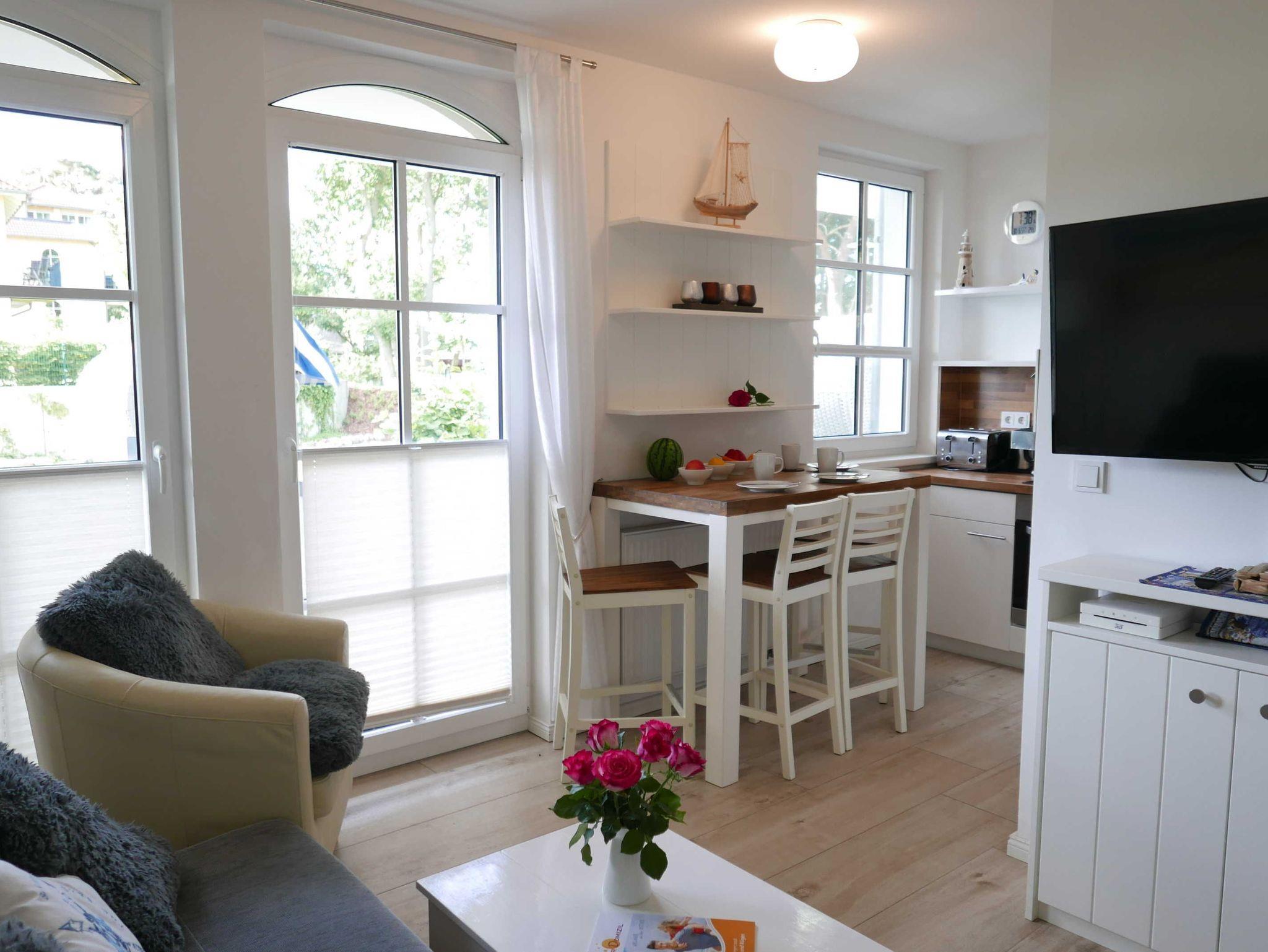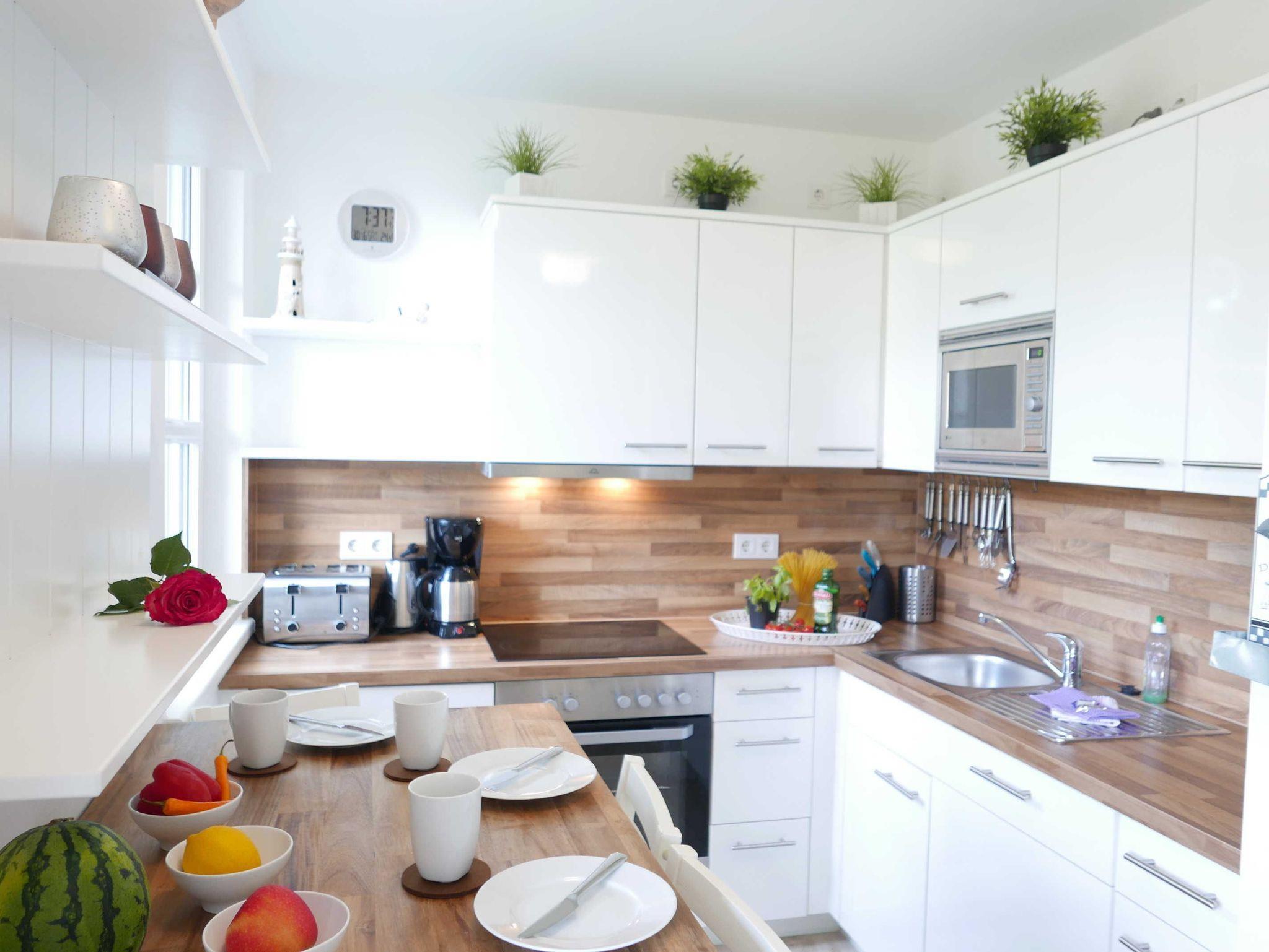 Die Wohnung hat eine offene, modern ausgestatteten Küche (Ceranfeld, Backofen, Mikrowelle, Kaffeautomat, 4-fach Toaster, Wasserkocher, Kühl-Gefrierschrank, Staubsauger) und einen kombinierten Wohn-Eßbereich mit einem Esstisch und 4 Stühlen sowie ausziehbarer Schlafcouch und einem 42 TV mit Radio, CD, DVD und Blu Ray Player.