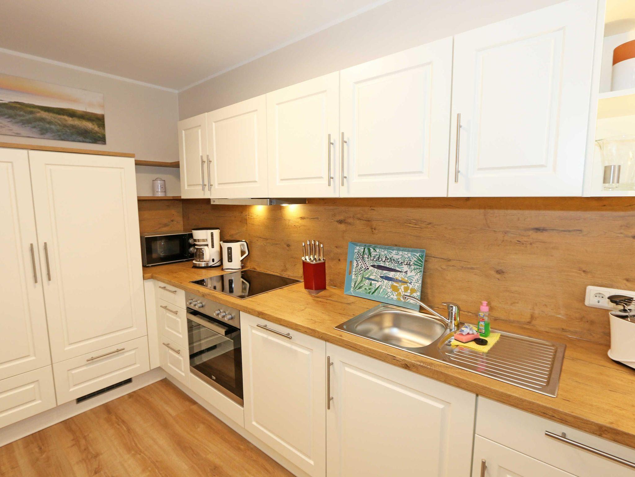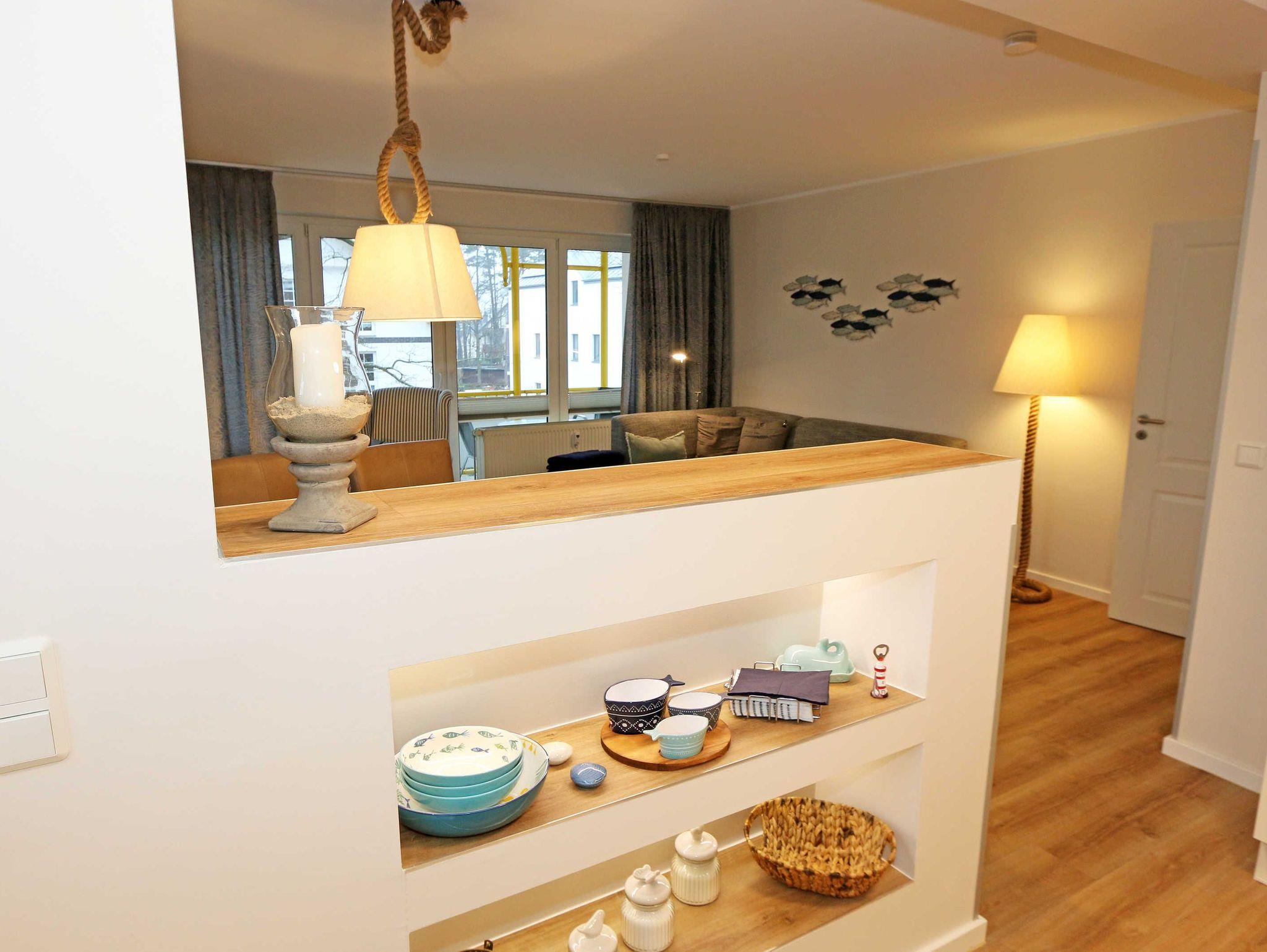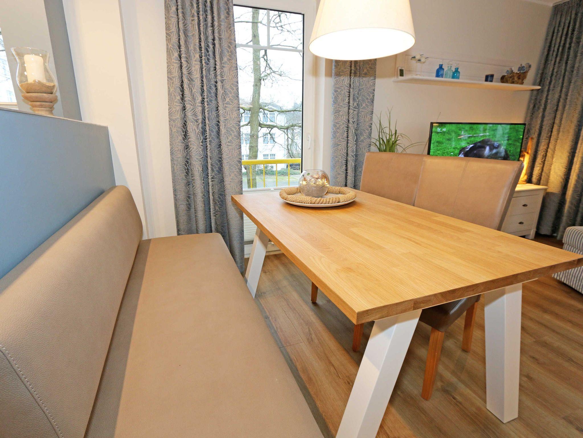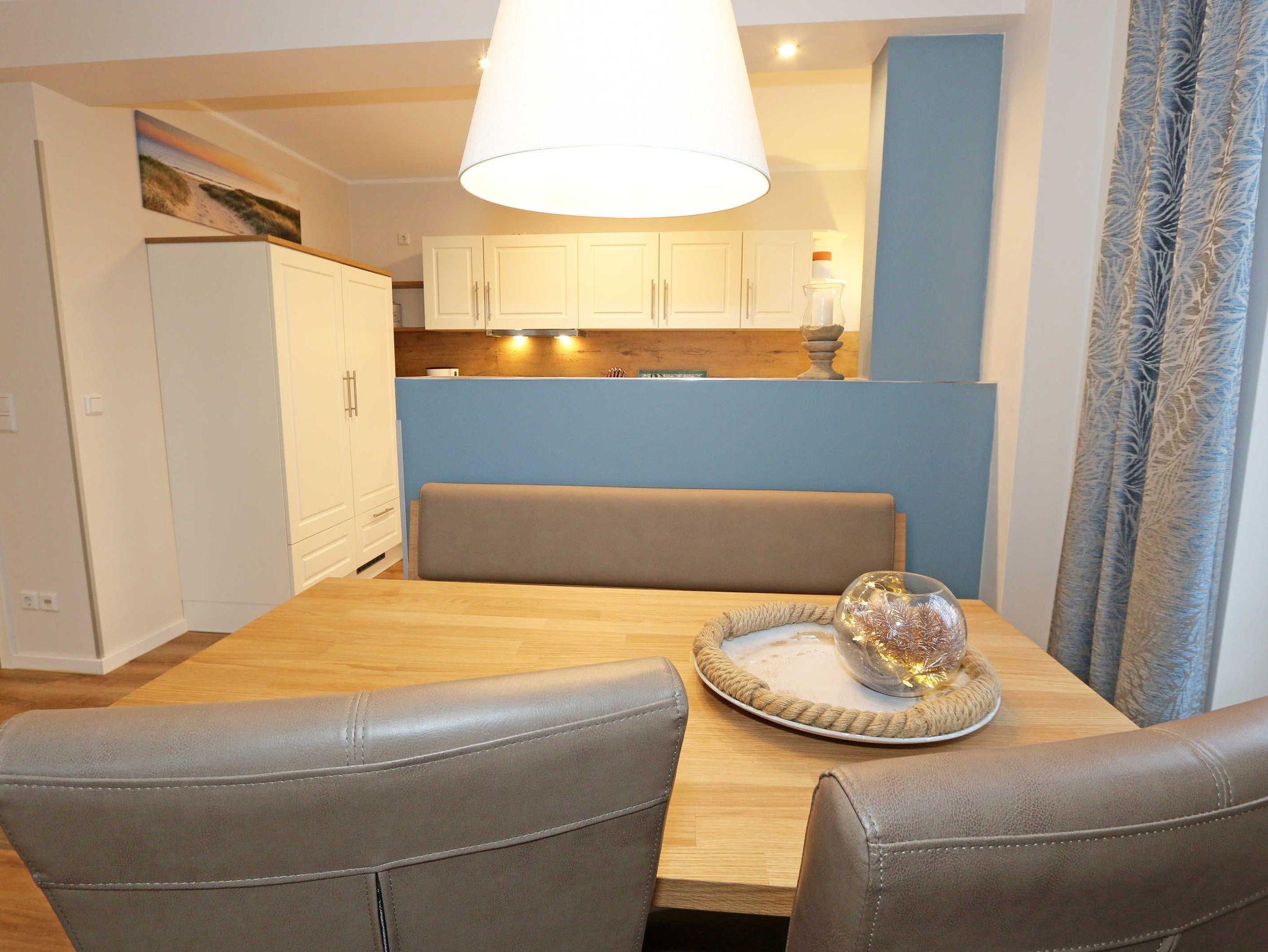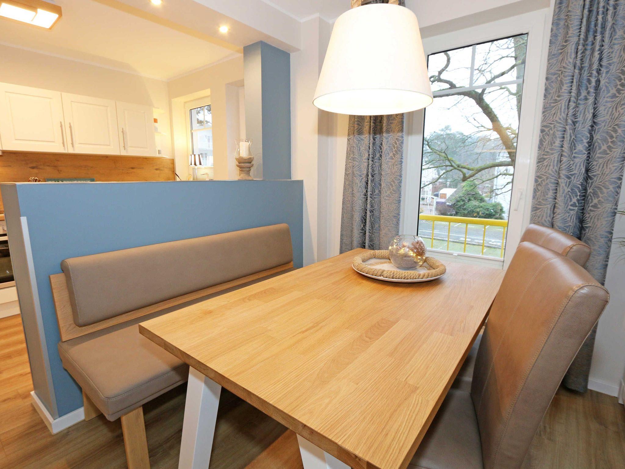 Die 56 qm große Nichtraucherwohnung befindet sich im 1. Obergeschoss in der Villa Störtebeker im Herzen von Baabe. Die Ferienwohnung bietet Ihnen Platz für max. 2 bis 4 Personen. Wenn Sie die Wohnung betreten, begrüßt Sie ein großzügiger Eingangsbereich mit Sitzgelegenheit und einer Garderobe. Der offene Wohn- Essbereich ist mit einer gemütlichen Couch, welche sich in wenigen Handgriffen in ein Bett verwandelt werden kann (Liegefläche 1,60m x 2,00m), einen Couchtisch, einen gemütlichen Ohrensessel, eine Leselampe, ein Lowboard mit Smart-TV, Blu-Ray-Player sowie ein DAB-Radio mit USB-Anschluss und Bluetooth Möglichkeit. Eine kleine Sammlung an Büchern, Gesellschaftsspielen und ein Internetzugang (WLAN) runden den Bereich ab. Im angrenzenden Essbereich befindet sich für das gemütliche Beisammensein ein Esstisch mit Stühlen und einer Sitzbank. Die offene Eck- Küchenzeile mit einem Kühlschrank und Gefrierfach, einem Geschirrspüler, ein 4 Zonen Ceranfeld mit Backofen, eine Mikrowelle, eine Kaffeemaschine, Nespresso Maschine, ein Toaster, ein Wasserkocher sowie diversen Küchenutensilien bietet Ihnen alles, was Sie zu Kochen benötigen. Vom Wohnbereich gelangen Sie direkt auf den großen bestuhlten (Süd/West) Balkon mit Sonnenschirm, wo Sie einen wunderbaren Ostseetag ausklingen lassen können. Das moderne und neu renovierte Bad verfügt über eine Glasdusche mit niedrigem Einstieg, einen Waschplatz, ein WC, ein Kosmetikspiegel, ein Fön sowie ein Handtuchtrockner. Neben dem Bad befindet sich das Schlafzimmer mit einem Doppelbett (1,80m x 2,00m), Nachttischablagen, Kleiderablage und einem 3- türigen Kleiderschrank. Für einen ruhigen Schlaf dienen die Verdunklungsplissee´ s. Haustiere sind nicht erlaubt. Ein PKW-Stellplatz (Nr.17) befindet sich direkt vor dem Haus. Ihre mitgebrachten Fahrräder können Sie sicher in dem zur Wohnung gehörenden Abstellraum unterbringen. Die Erstausstattung eines Wäschepaketes (komplette Bettwäsche, 1 Duschhandtuch, 1 kleines Handtuch) können Sie bis 14 Tage vor Anreise gegen Aufpreis dazu buchen oder durch eigene ergänzen. Ab 2 gebuchten Paketen erhalten Sie einmalig 1 Geschirrhandtuch und 1 Duschvorleger dazu. Wir wünschen Ihnen einen traumhaften Urlaub an der Ostsee, erholen Sie sich gut und genießen Sie die Zeit.