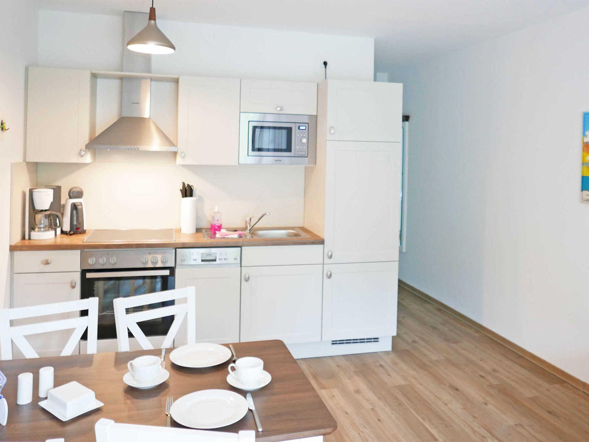 Die offene Küche ist ausgestattet mit 4-Plattenherd, Kühlschrank mit Gefrierfach, Mikrowelle sowie Geschirrspülmaschine.