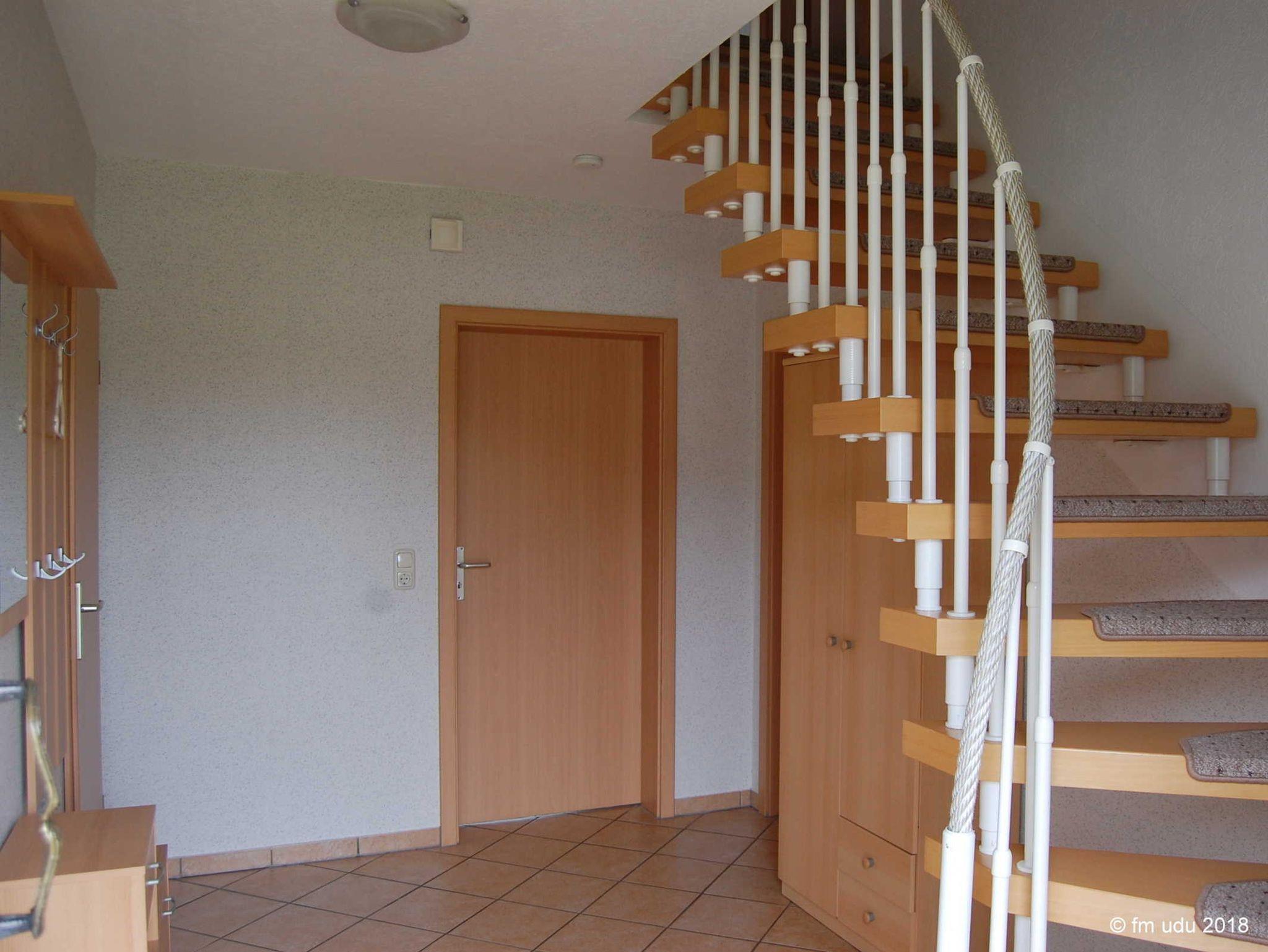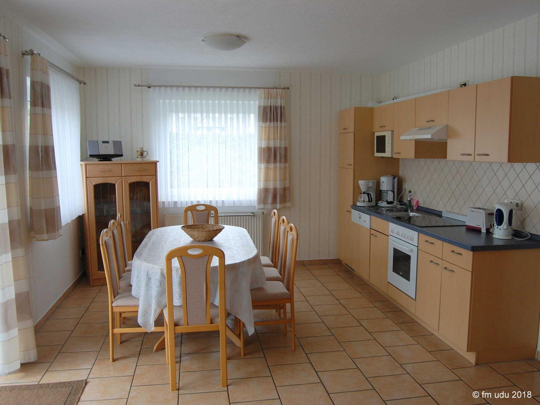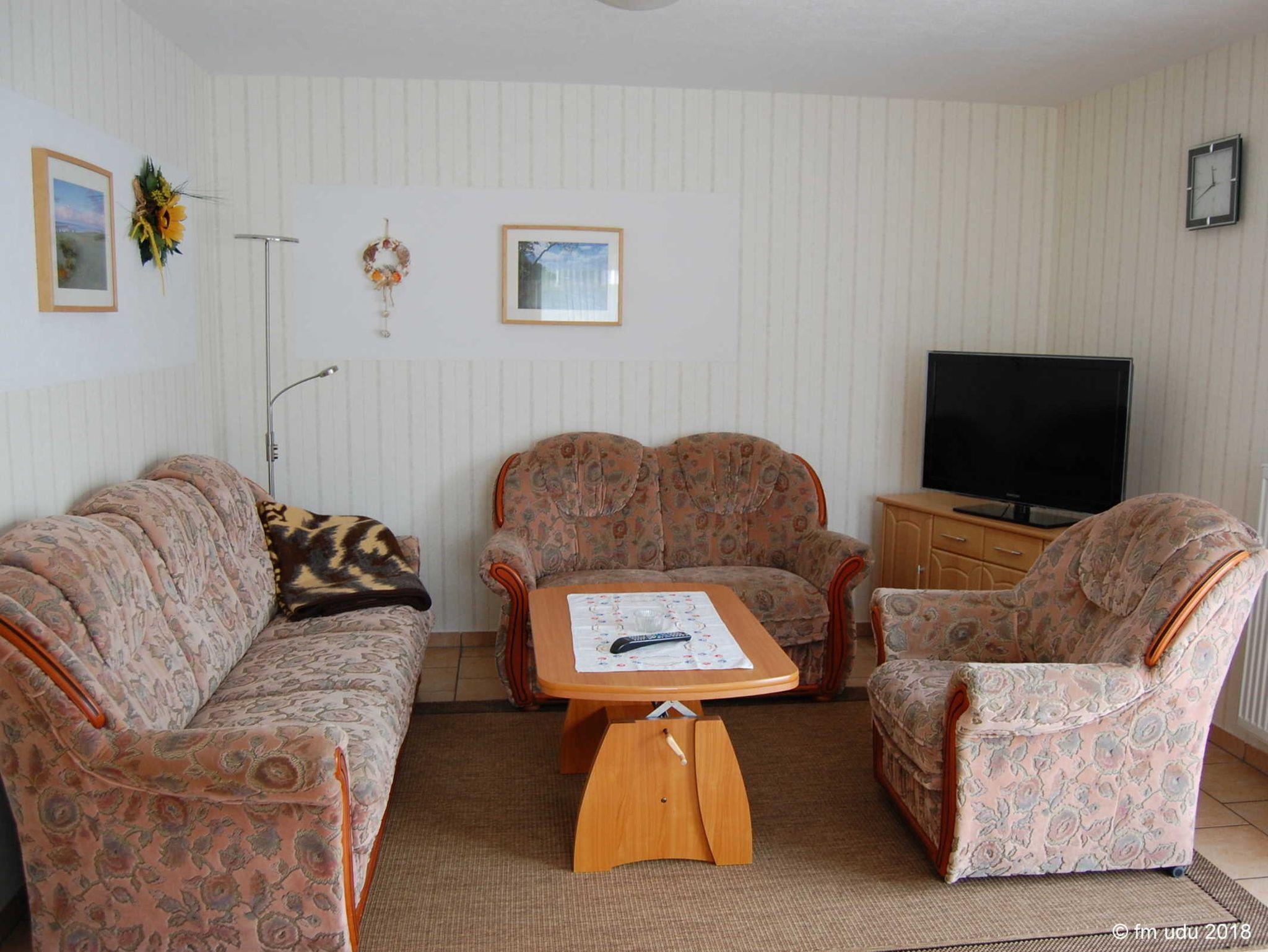 Die Wohnfläche des Ferienhauses beträgt ca. 105 m². Ebenerdig befinden sich der Flur, ein Wohnraum mit Sitzmöbeln, Flachbildschirm-TV, Radio, eine offene Küchenzeile, komplett ausgestattet mit zum Beispiel E-Herd, Backofen, Mikrowelle und Geschirrspüler, ein Schlafzimmer mit Doppelbett und ein kleines Bad mit Dusche und WC.