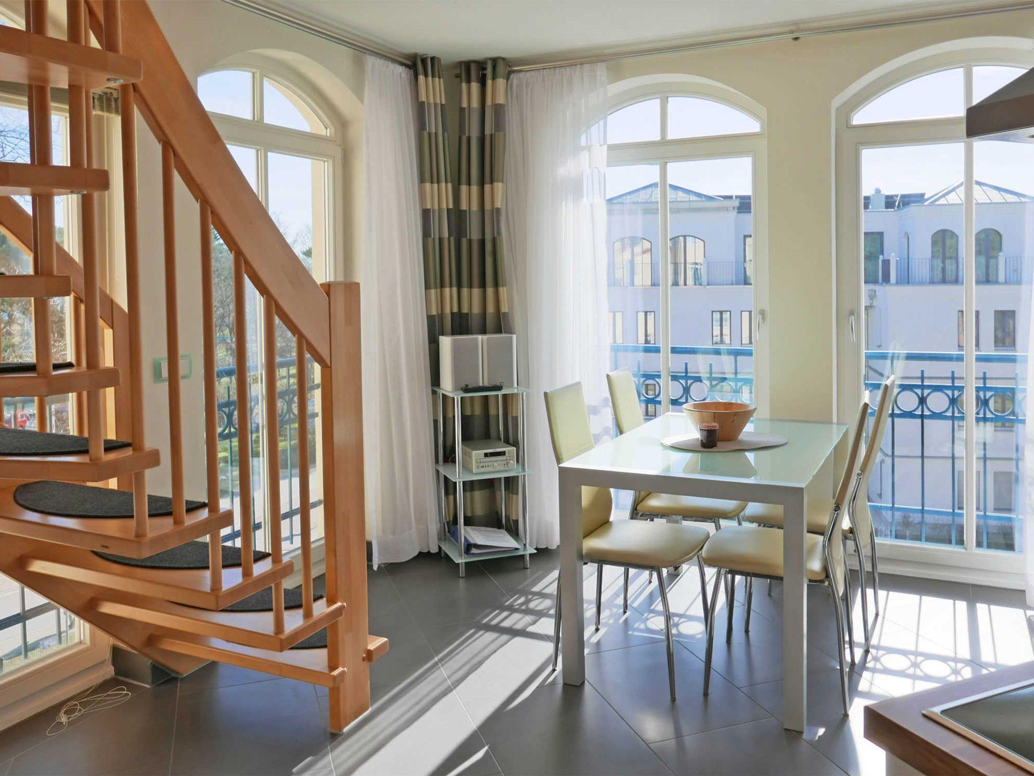 In dieser exklusiv-modernen 3-Zimmerferienwohnung für 4 Personen bleiben keine Wünsche offen. Auf 70 qm und 2 Ebenen befinden sich zwei Schlafzimmer mit jeweils einem Doppelbett (2x0,90m x 2,00 m und 1,40m x 2,00 m), ein Wohnzimmer, ein Esszimmer mit Küche, ein Duschbad sowie ein Gäste-WC. Auf der Dachterrasse können Sie die herrliche Aussicht auf die Ostsee genießen. Ein zusätzlicher Balkon mit Meerblick ist ebenfalls vorhanden, diesen erreichen Sie über eines der Schlafzimmer. In der Küche sind selbstverständlich alle Annehmlichkeiten vorhanden inklusive 4-Zonen-Ceranfeld, Backofen, Mikrowelle, Geschirrspüler, Kühlschrank und Abzugshaube. Besonders schön ist das Wohnzimmer im Turm, von hier aus haben Sie einen grandiosen Rundumblick.