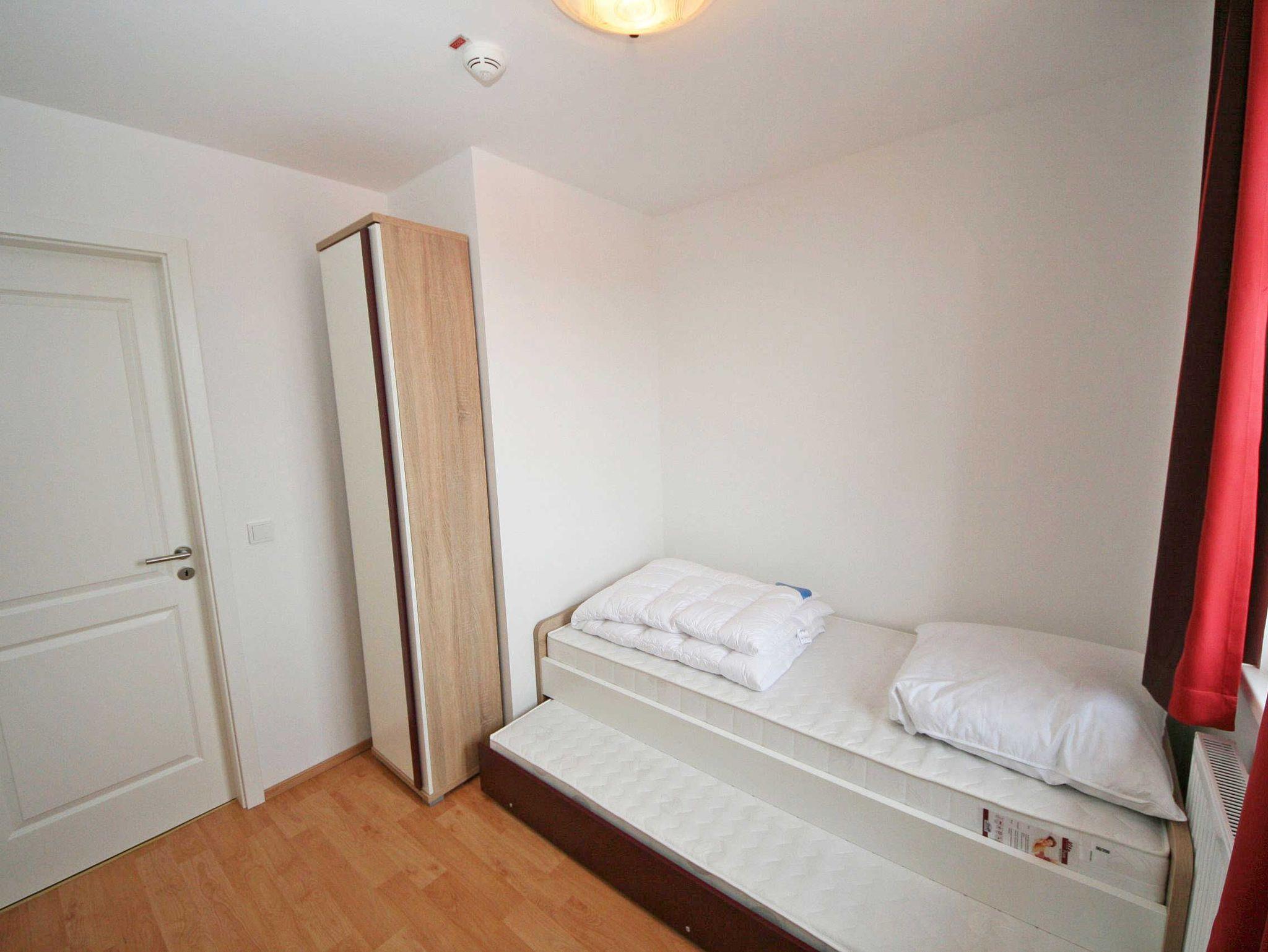 Sie wohnen in der Dreizimmerwohnung Strandkorb (Nichtraucher) mit ca. 54 Quadratmetern im obersten Stockwerk, welche exklusiv für drei Personen ausgestattet ist. Neben einer hochwertigen Küchenzeile mit Keramikkocheld, Backofen mit integrierter Mikrowelle/Grill, Geschirrspüler, Kühlschrank und anderen praktischen Helfern erwartet Sie ein Essplatz mit 3 Stühlen. Der Wohnbereich ist liebevoll eingerichtet und verfügt über ein Sofa sowie einen Flachbild-TV. Ein Internetanschluss (WLAN) ist für Sie vorhanden. Dieser ist inklusive! Im ersten separaten Schlafzimmer mit Kleiderschrank und einem komfortablen Doppelbett (1,80 m x 2,00 m) können Sie entspannt träumen. Das zweite Schlafzimmer verfügt über ein Einzelbett für ein Kind oder eine erwachsene Person. Ein Flachbild-TV rundet das 2. Schlafzimmer ab. Im modernen Badezimmer finden Sie unter anderem eine ebenerdige Echtglasdusche, WC, einen Handtuchtrockner sowie moderne Badmöbel. Der möblierte Balkon ist vom Wohnbereich aus begehbar. Von der Tiefgarage (Nr. 107, Einfahrtshöhe 2,00m) gelangen Sie mit dem Aufzug bequem in das dritte Obergeschoss. Nun trennt Sie nur noch eine Treppe von der Endetage, in der Sie die mit Liebe zum Detail eingerichtete Wohnung erwartet. Platz für Ihr Reisegepäck finden Sie im separaten Abstellraum. In Ihrer Wohnung sind Tiere nicht erlaubt, daher ist sie insbesondere auch für Allergiker geeignet. Im Keller des Hauses haben Sie die Möglichkeit eine Waschmaschine/Trockner gegen Gebühr zu nutzen. Mit dem Fahrstuhl des Hauses A gelangen sie in das Untergeschoss der Meeresblickanlage, wo Sie ein großzügiger und heller Wellnessbereich erwartet. Hier können sie in einem Pool kleine Bahnen schwimmen, in 2 Saunen Ihren Kreislauf in Schwung bringen, in einem dazugehörigen Ruheraum Ihren Körper wieder beruhigen, in einer Schneckendusche sowie weiteren Duschen das kühle Nass genießen und auf einer Außenterrasse mit Außendusche die frische Luft einatmen. Die Erstausstattung eines Wäschepaketes (komplette Bettwäsche, 1 Duschhandtuch, 2 kleine Handtücher) können Sie bis 14 Tage vor Anreise gegen einen Aufpreis dazu buchen oder durch eigene ergänzen. Ab 2 gebuchten Paketen erhalten Sie einmalig 1 Geschirrhandtuch und 1 Duschvorleger hinzu.