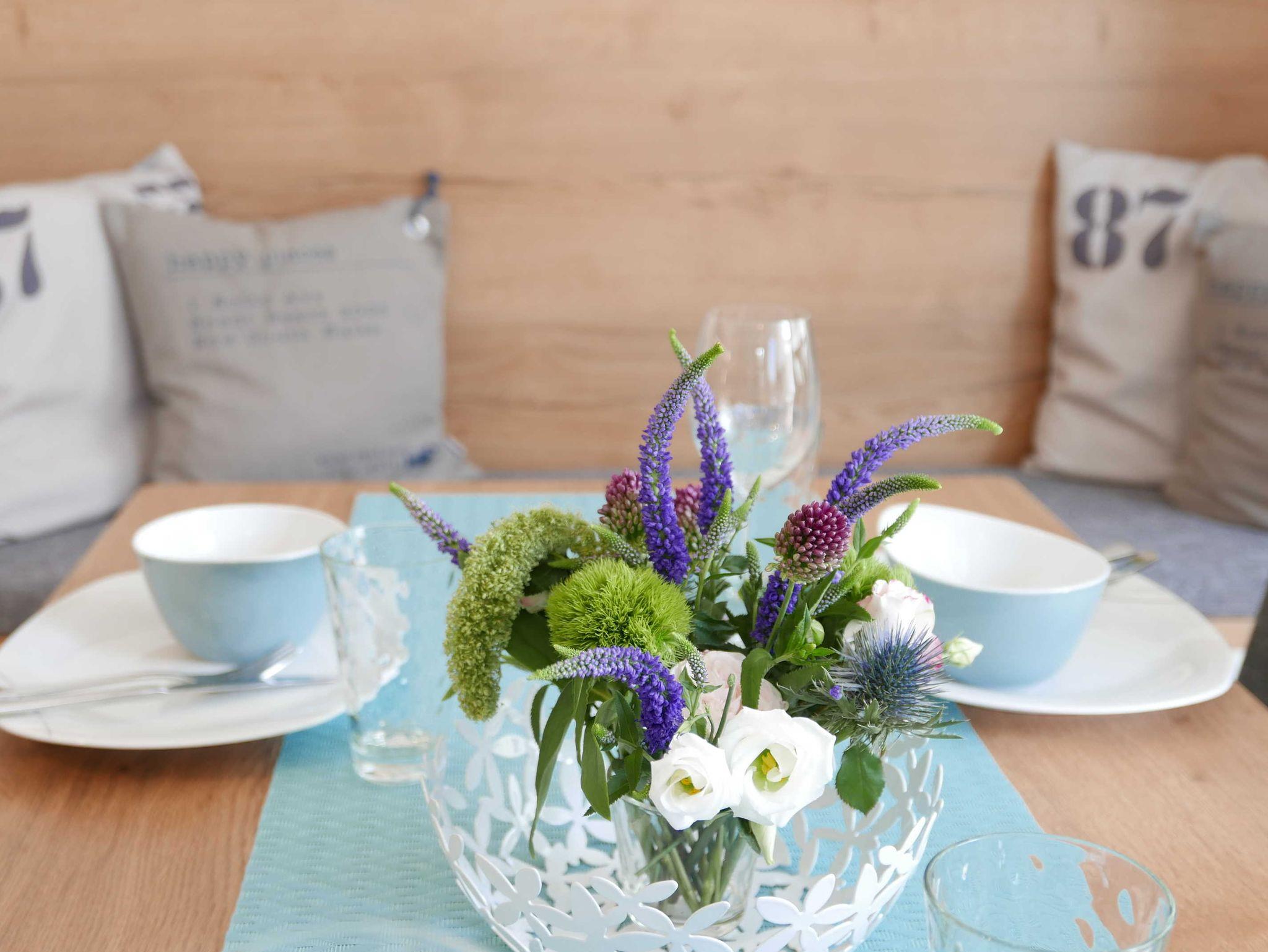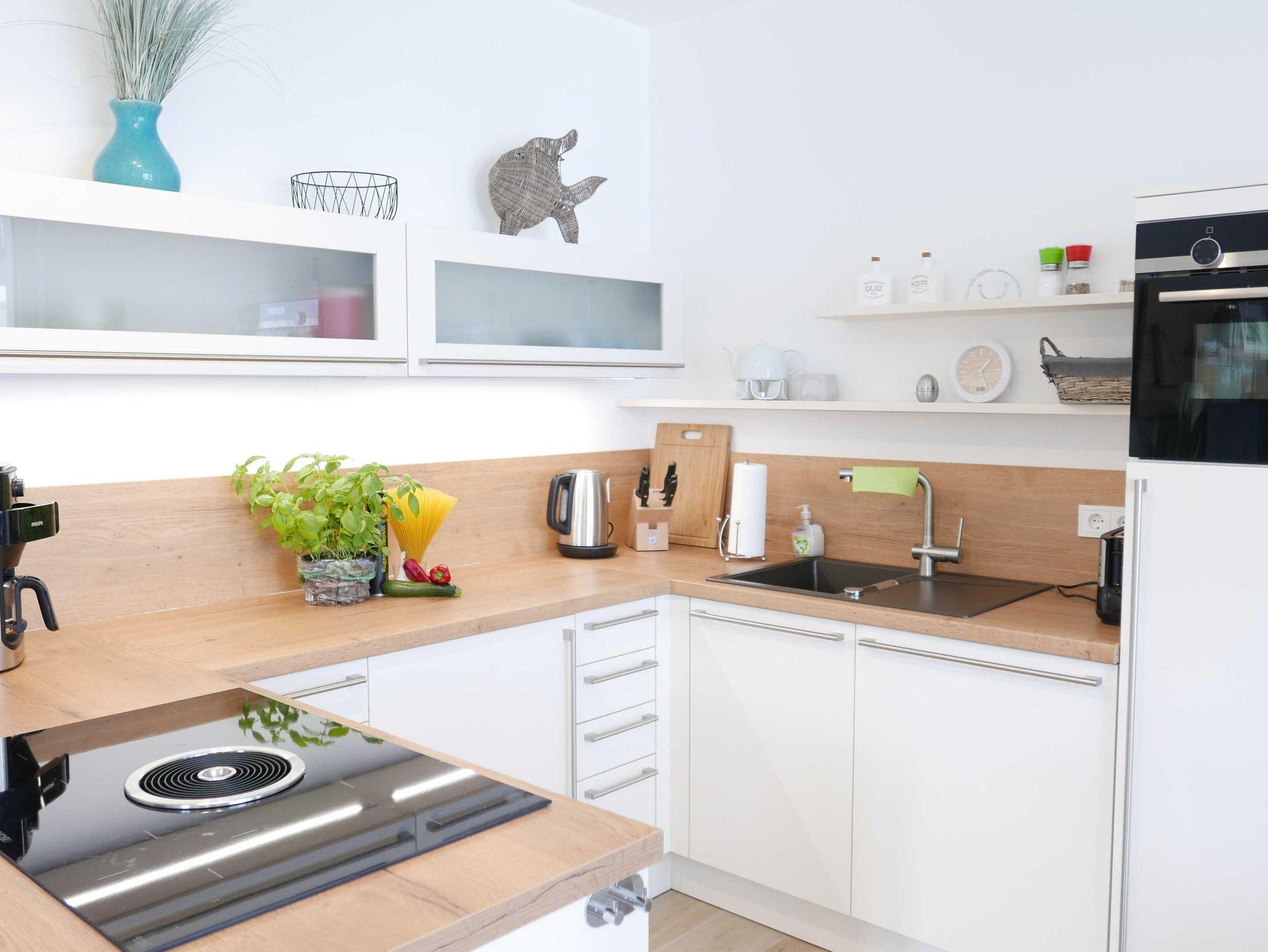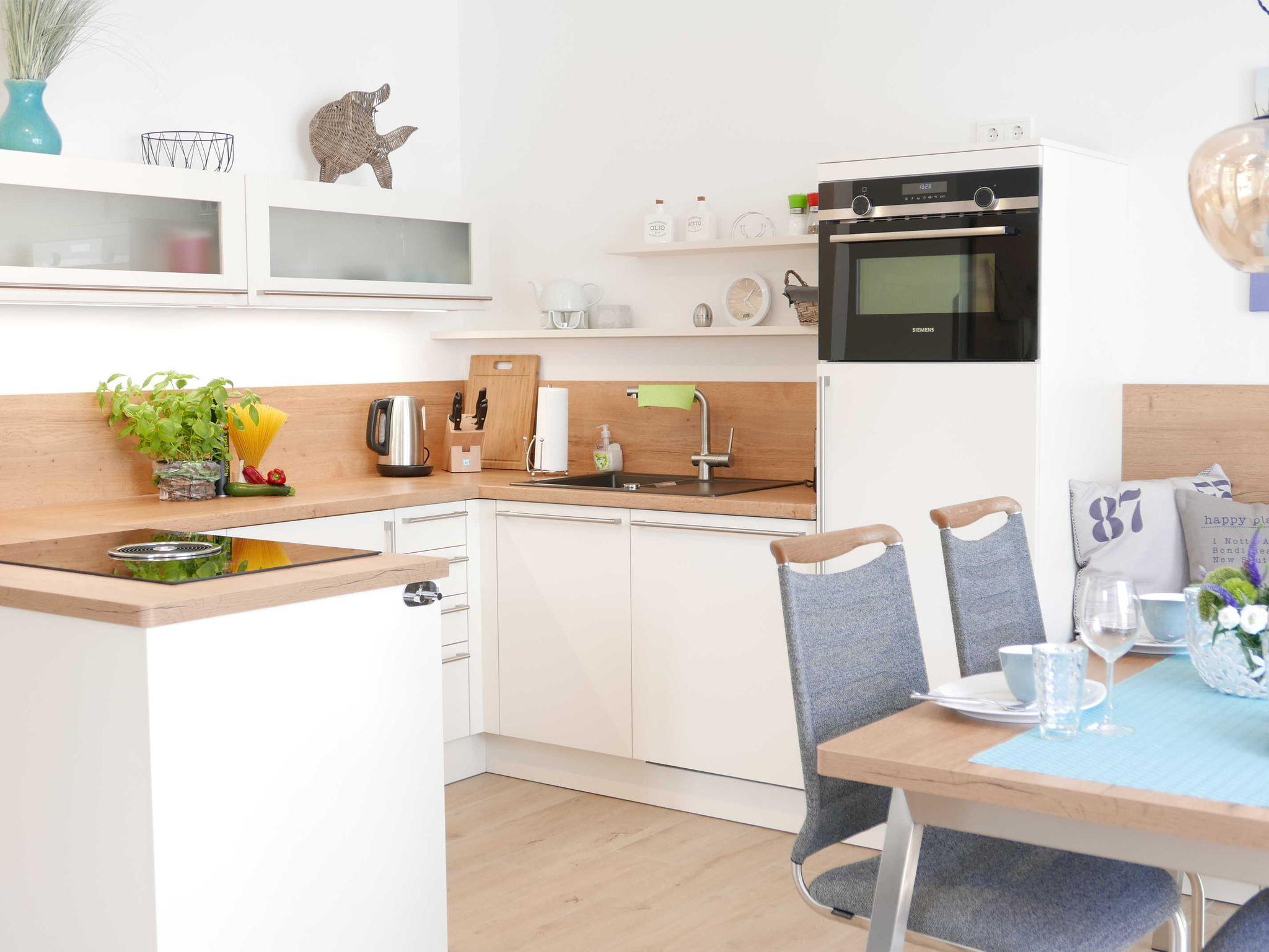 Die offene Küche und der Essbereich sind hochwertig und gemütlich eingerichtet, Spülmaschine, Induktionsherd und Backofen sind selbstverständlich. Auch eine Waschmaschine ist vorhanden sowie WLAN.