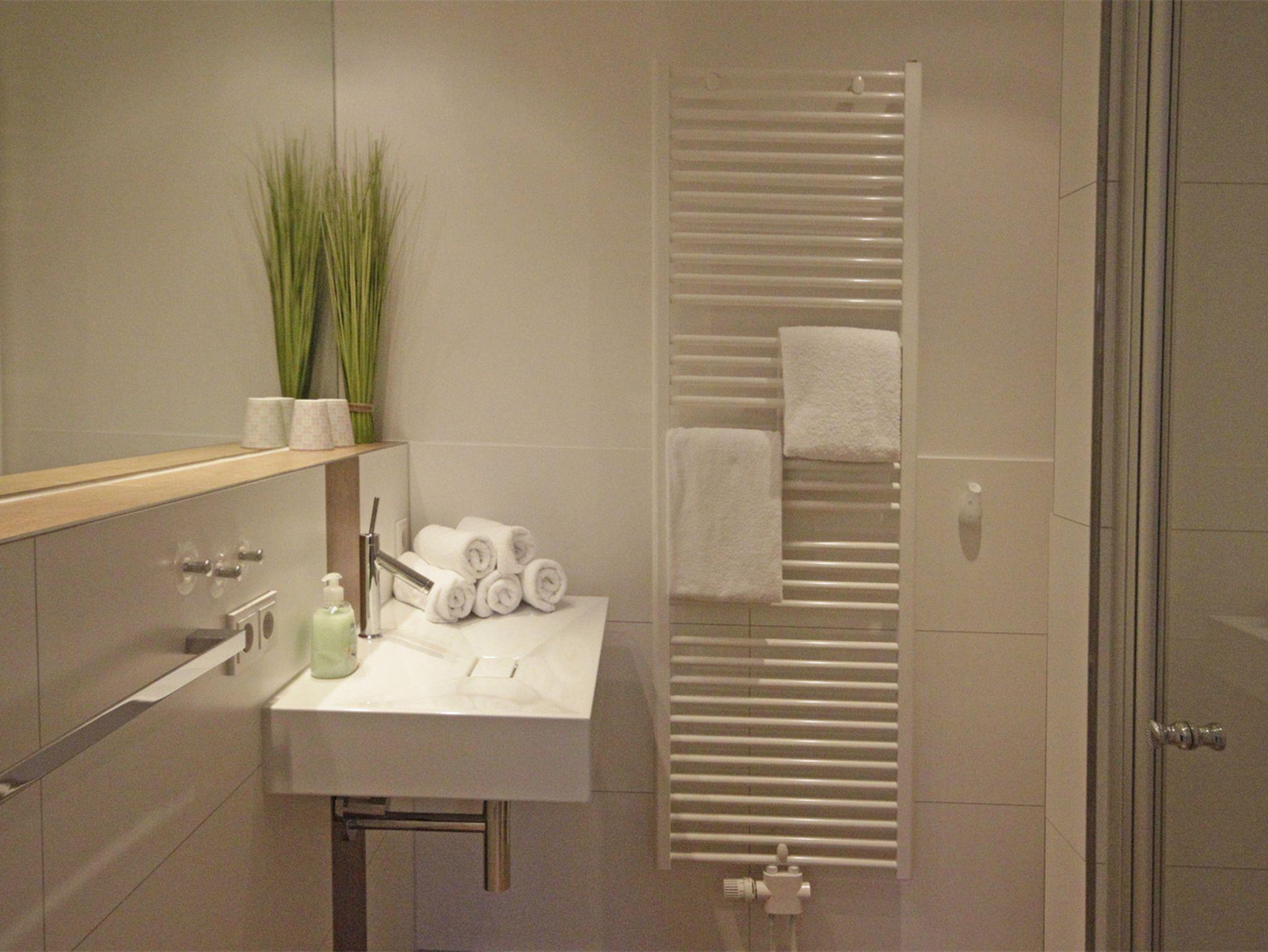 Im Bad mit begehbarer Dusche steht eine Waschmaschine für Sie bereit. Zusätzlich verfügt die Wohnung über ein Gäste-WC.
