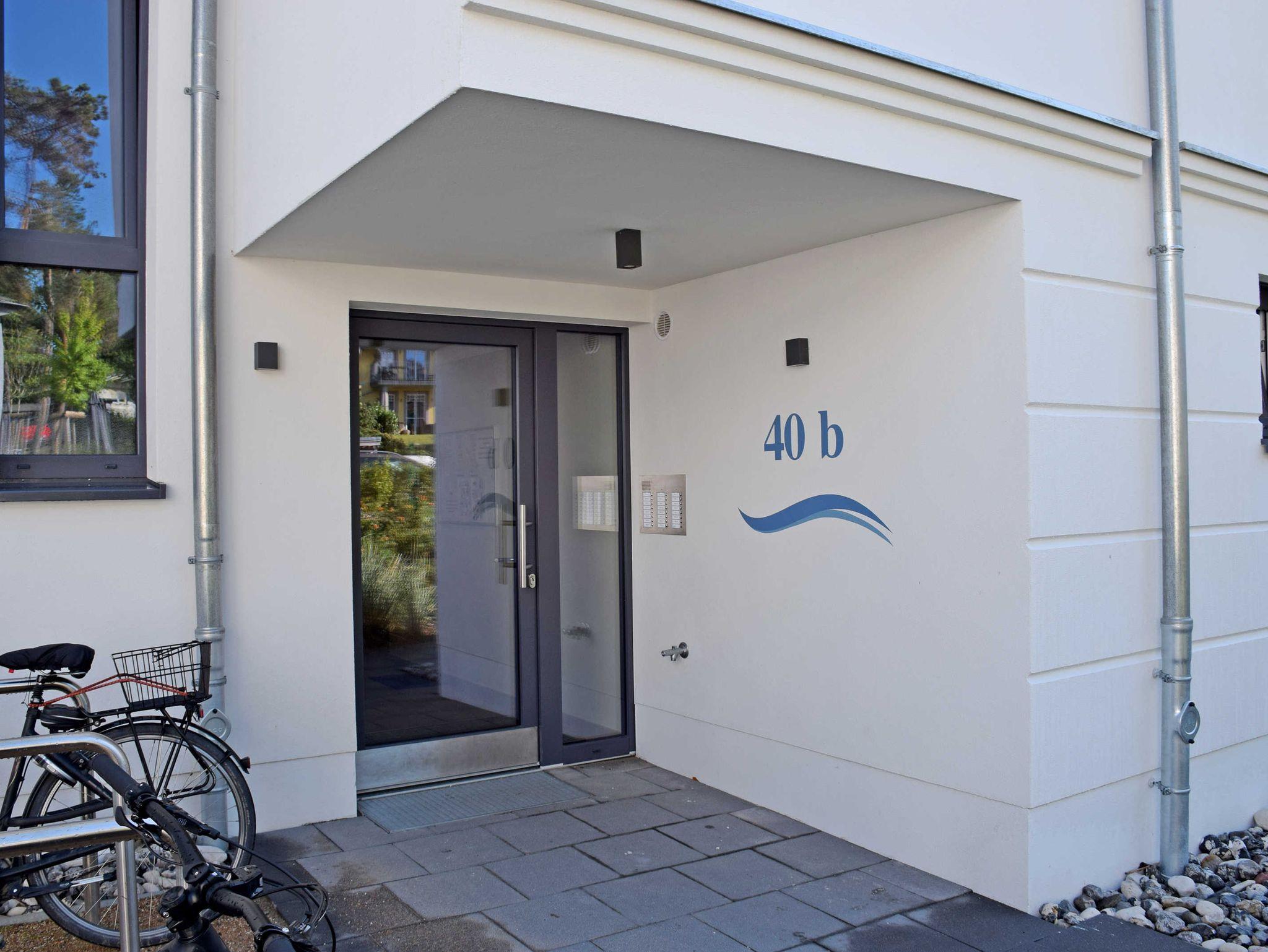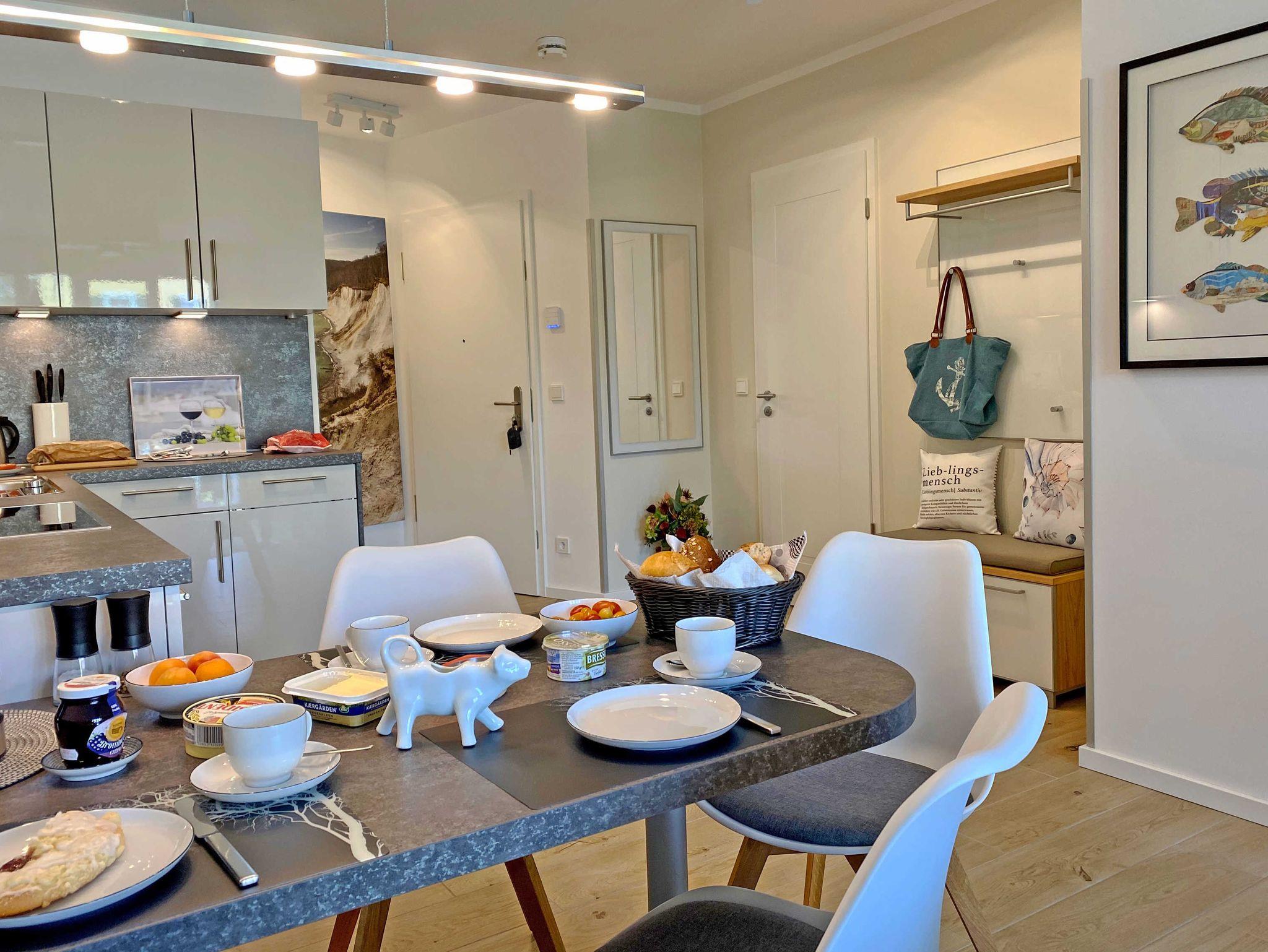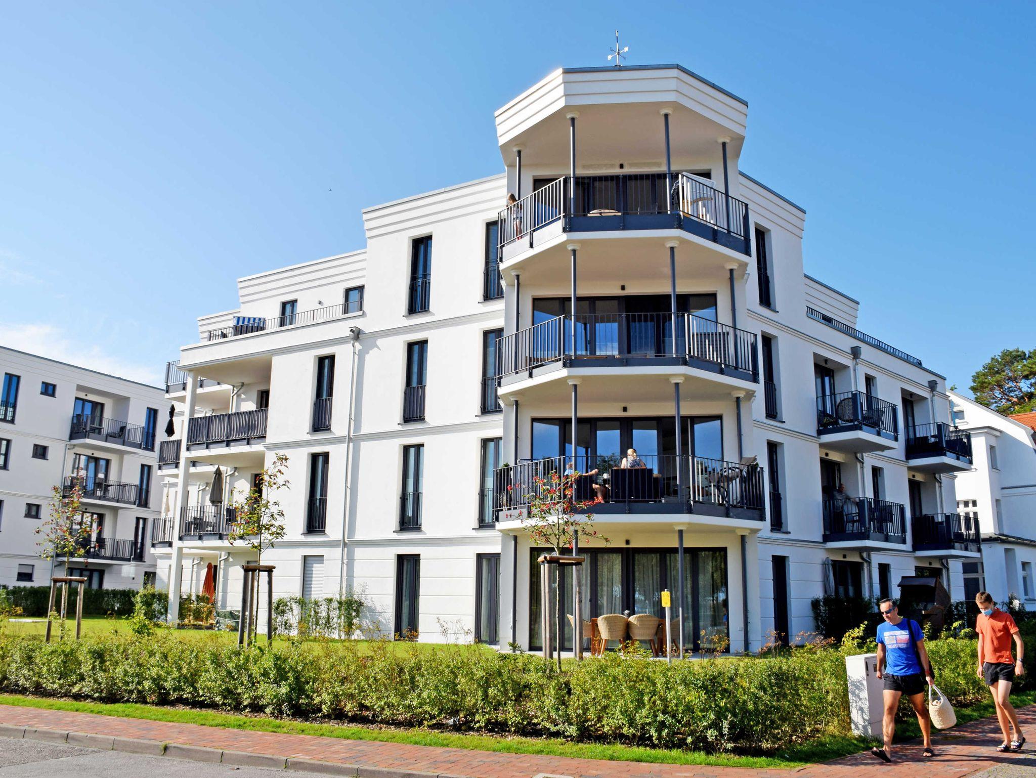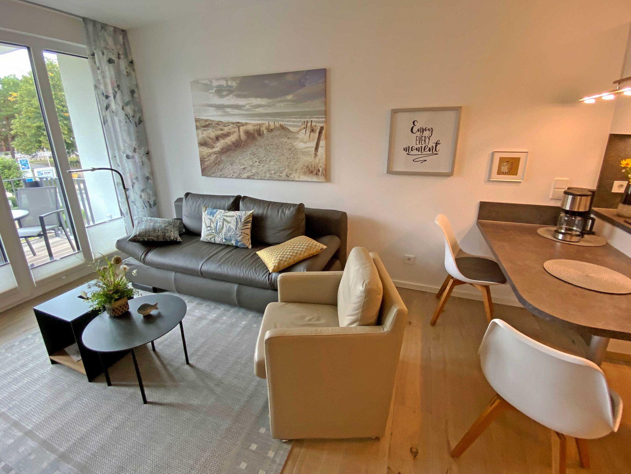 Unsere modern und sehr gut ausgestattete Ferienwohnung mit Meerblick und überdachtem Balkon (50 qm, max. 2 Gäste, Wohnzimmer, Schlafzimmer, Bad/Dusche, Küchenzeile, Lift, WLAN) liegt in der ersten Etage eines neu errichteten Appartementhauses, nur etwa 100 m vom feinsandigen Badestrand an der Ostsee.