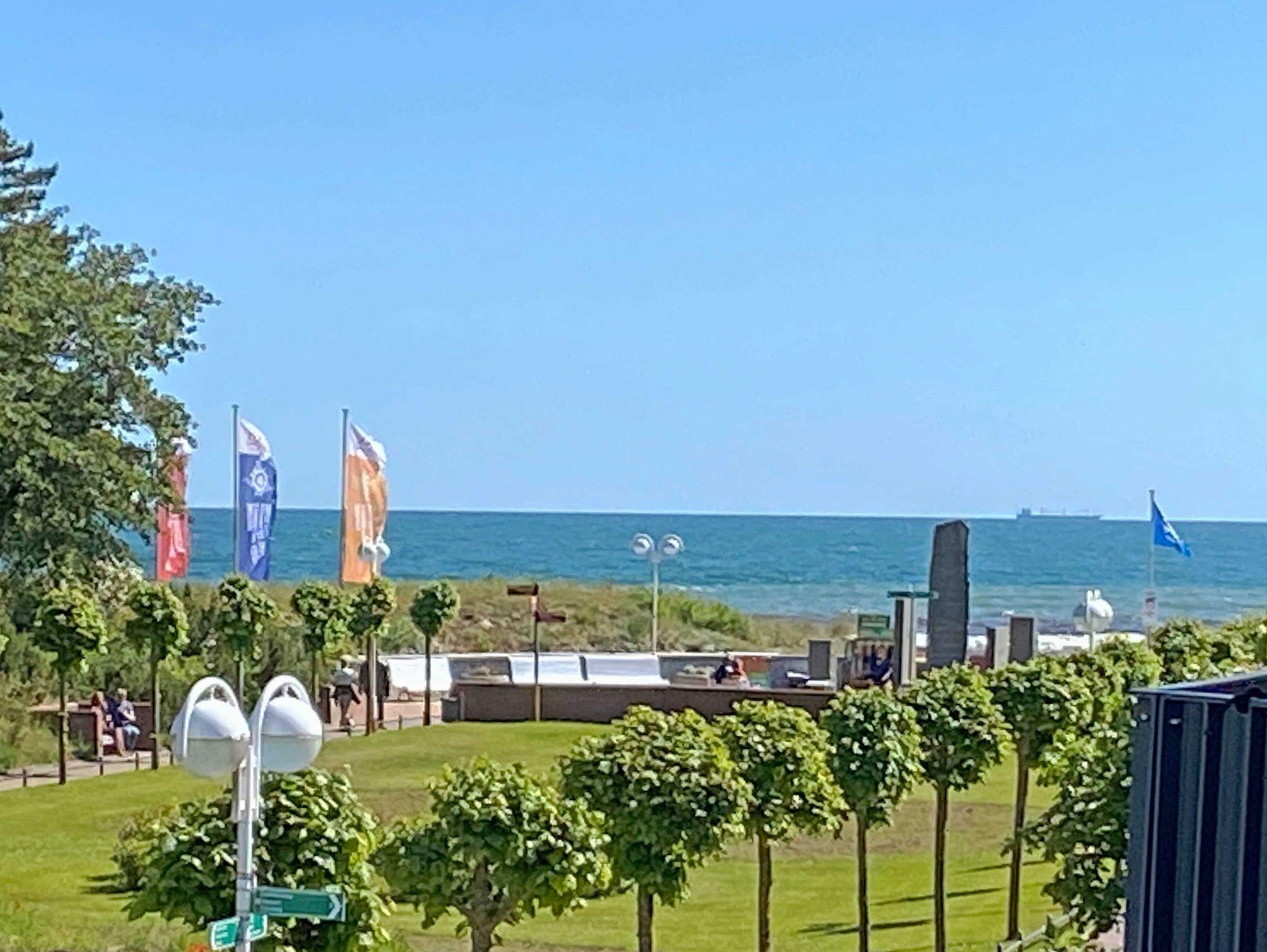 Betritt man den Balkon erscheint auf der einen Seite ein wunderschöner idyllischer Blick auf das Meer und den zu jeder Jahreszeit attraktiven Kurpark.