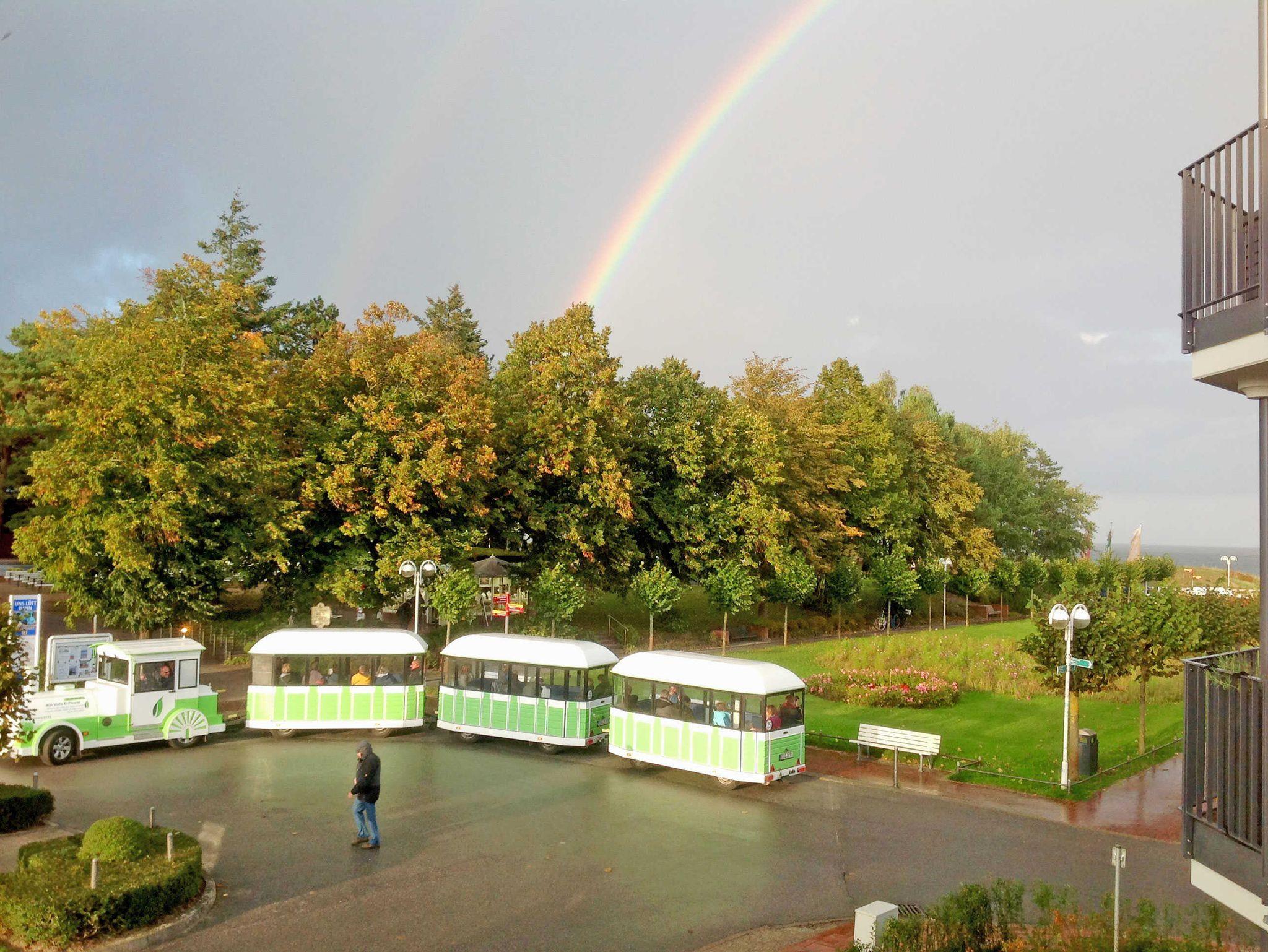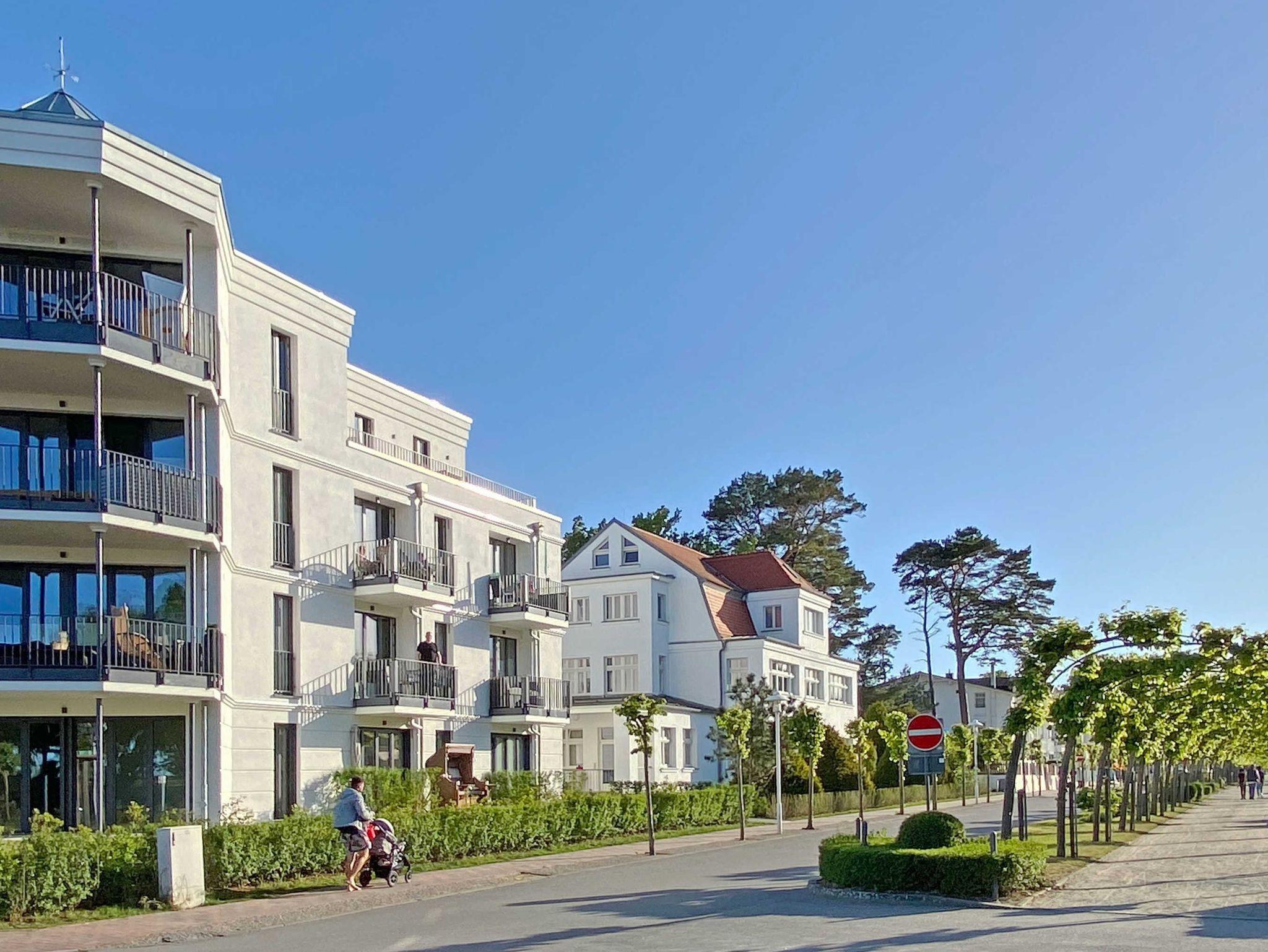 In der anderen Richtung schaut man die Strandstraße entlang, die mit ihren kleinen Geschäften, gemütlichen Cafés und Restaurants zum Bummeln einlädt. Am Ende kreuzt die historische Rügensche Bäderbahn „Rasender Roland“ den Weg.