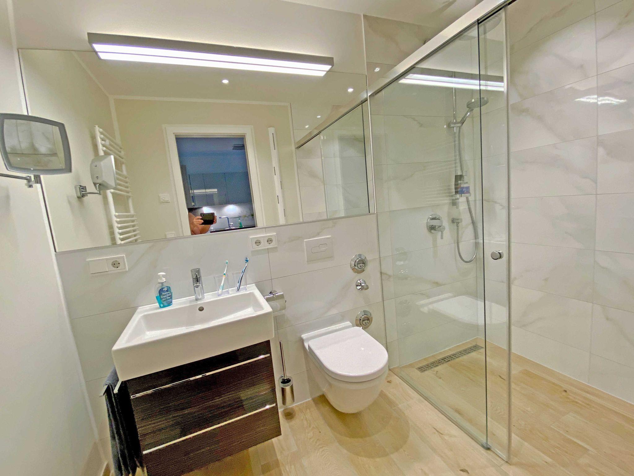 Das elegante Bad vereint höchste Funktionalität mit einem edlen Ambiente. Der Fliesenspiegel in Marmoroptik unterstreicht den luxuriösen Charakter der Ferienwohnung. Die ebenerdige 1,00 x 1,50 m große Dusche mit einer Glasschiebetür garantiert höchsten Komfort und mit der Raindance Dusche erleben Sie auf dem ganzen Körper einen angenehmen Wohlfühleffekt.