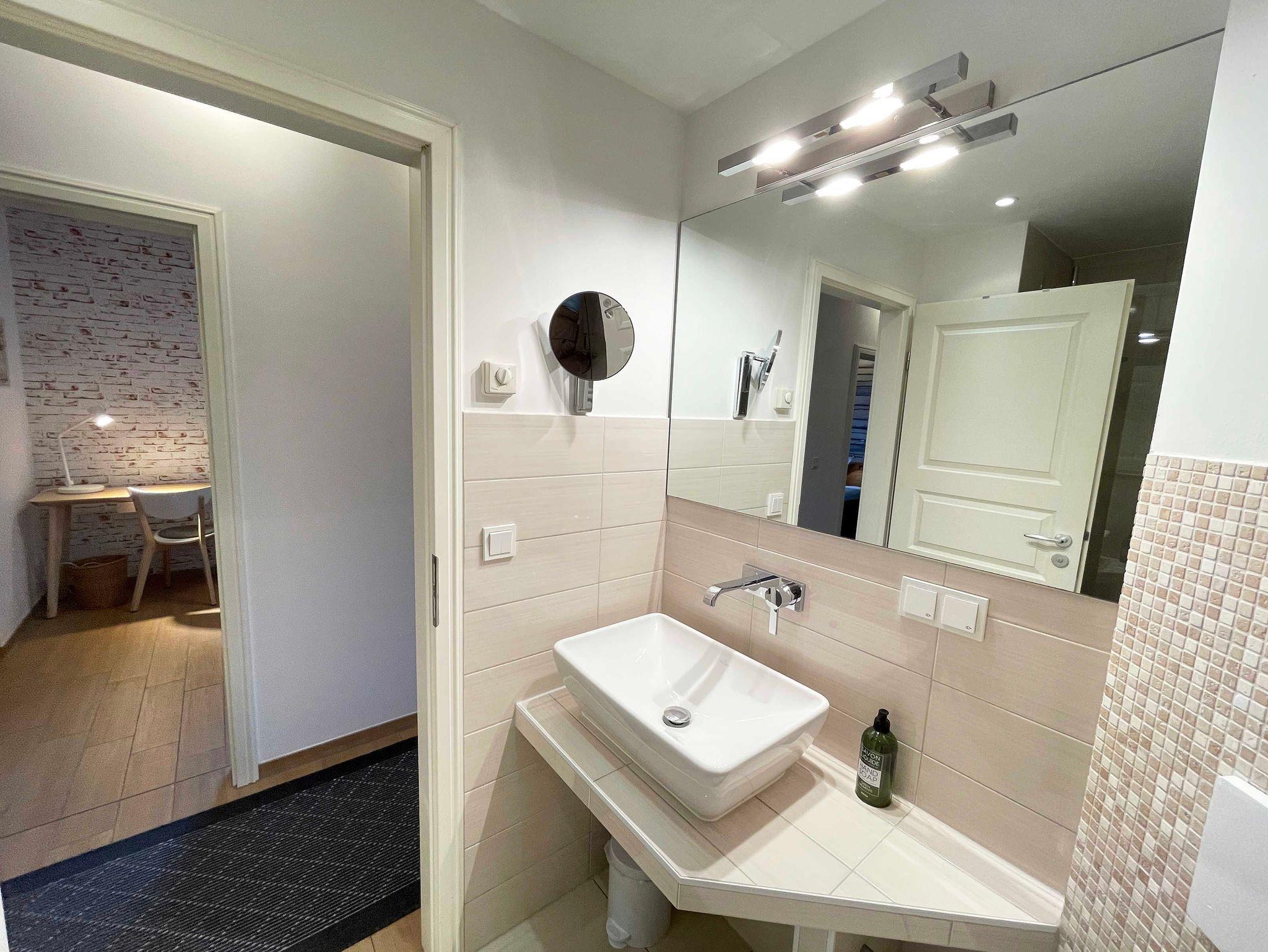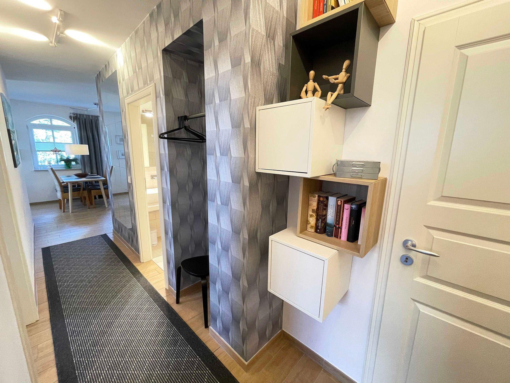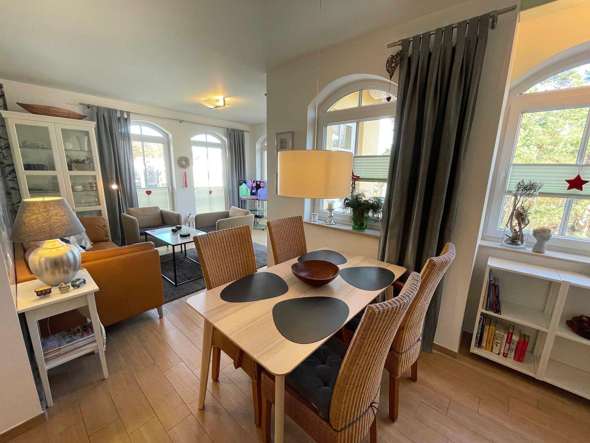 Die ca. 63 m² große Nichtraucherwohnung bietet für 2 bis 4 Personen ein behagliches und gemütliches Ambiente. Die Wohnung befindet sich in der 2. Etage und ist mit einem Aufzug bequem zu erreichen. Großzügige Fensterfronten lassen die geräumige Wohnung noch heller erscheinen. Von dem Wohnzimmer aus gelangen Sie auf den bestuhlten Balkon, von wo aus Sie teilweise Blick durch die Kiefern auf die Ostsee haben. Bei Wellengang können Sie das Meer nicht nur sehen, sondern auch hören. Das Wohnzimmer verfügt über eine gemütliche Sitzecke, einen Couchtisch, 2 Sessel, eine Vitrine, eine Leselampe, ein TV-Tisch mit Smart-TV, einen DVD-Player sowie ein Telefon. Ein WLAN-Anschluss rundet den technischen Bereich ab. Angrenzend an das Wohnzimmer finden Sie den Küchenbereich mit einer modernen Küchenzeile, welche mit einem Kühlschrank, einen Gefrierschrank, ein Induktionsfeld, ein Backofen mit Mikrowelle, einen Geschirrspüler, eine Kaffeemaschine, einen Toaster, einen Wasserkocher, einen Mixer, diverse Küchenutensilien sowie einer Sitzmöglichkeit für 4 Personen ausgestattet ist. Das größere Schlafzimmer verfügt über ein Boxspringbett (1,80m x 2,00m) mit Nachtischablagen und Beleuchtung, einen Schreibtisch, einen Kleiderschrank sowie Insektenschutzgitter. Im kleineren Schlafzimmer befindet sich ein Doppelbett (1,40m x 2,00m) mit Nachtischablagen mit Beleuchtung, einen Kleiderschrank sowie Insektenschutzgitter. Das Vollbad verfügt über eine ebenerdige Dusche, einen Waschplatz, ein WC,ein Kosmetikspiegel, ein Fön und ein Handtuchtrockner. Ein separates Gäste-WC rundet den Sanitärbereich ab. Im kleinen Abstellraum befinden sich ein Bügelbrett, ein Bügeleisen, ein Staubsauger sowie weitere Reinigungsutensilien. Das Rauchen ist nicht erlaubt, ebenso keine Haustiere. Zu der Wohnung gehört in der Tiefgarage (Höhe 1,95 m) der Stellplatz Nr. 15. Im Keller können Sie gegen eine Extragebühr eine Waschmaschine und einen Trockner nutzen. Die Erstausstattung eines Wäschepaketes (komplette Bettwäsche, 1 Duschhandtuch, 1 kleines Handtuch) können Sie gegen einen Aufpreis dazu buchen oder durch eigene ergänzen. Ab 2 gebuchten Paketen erhalten Sie einmalig 1 Geschirrhandtuch und 1 Duschvorleger dazu.