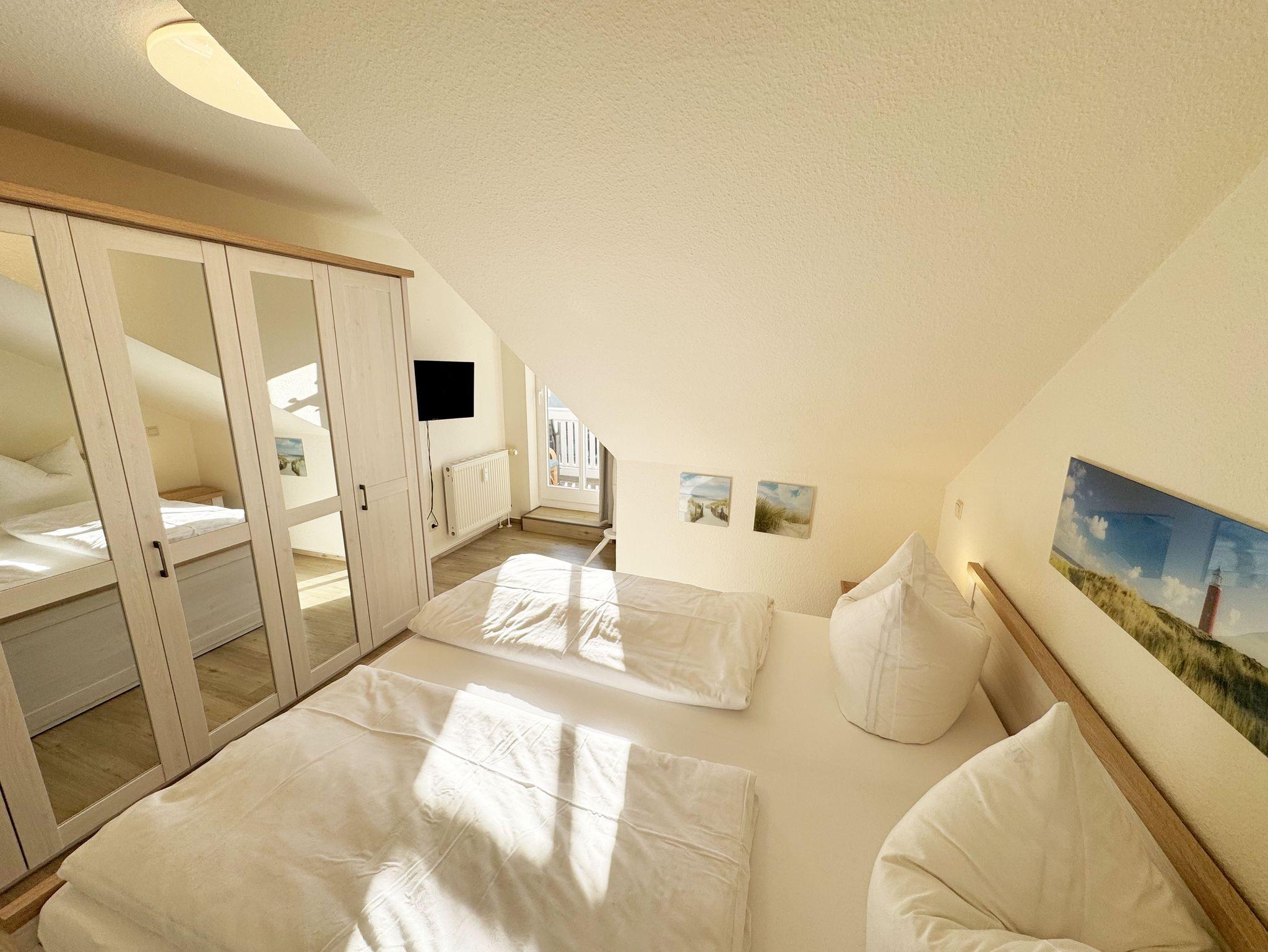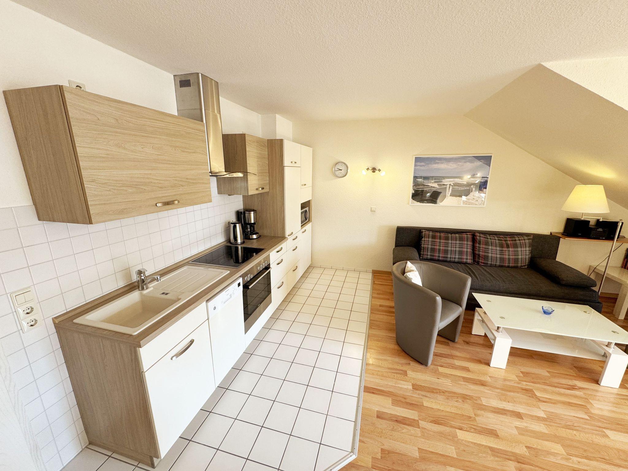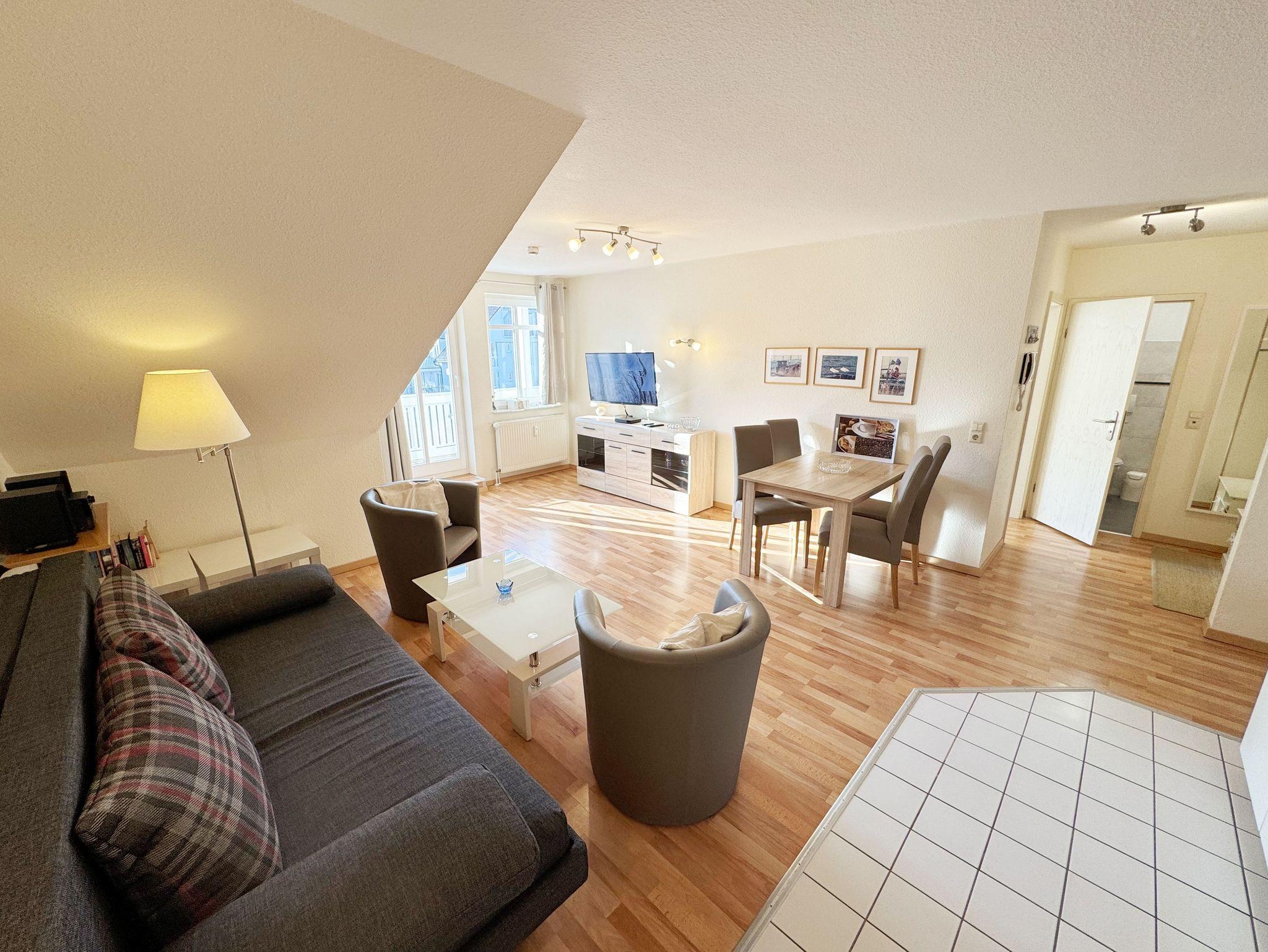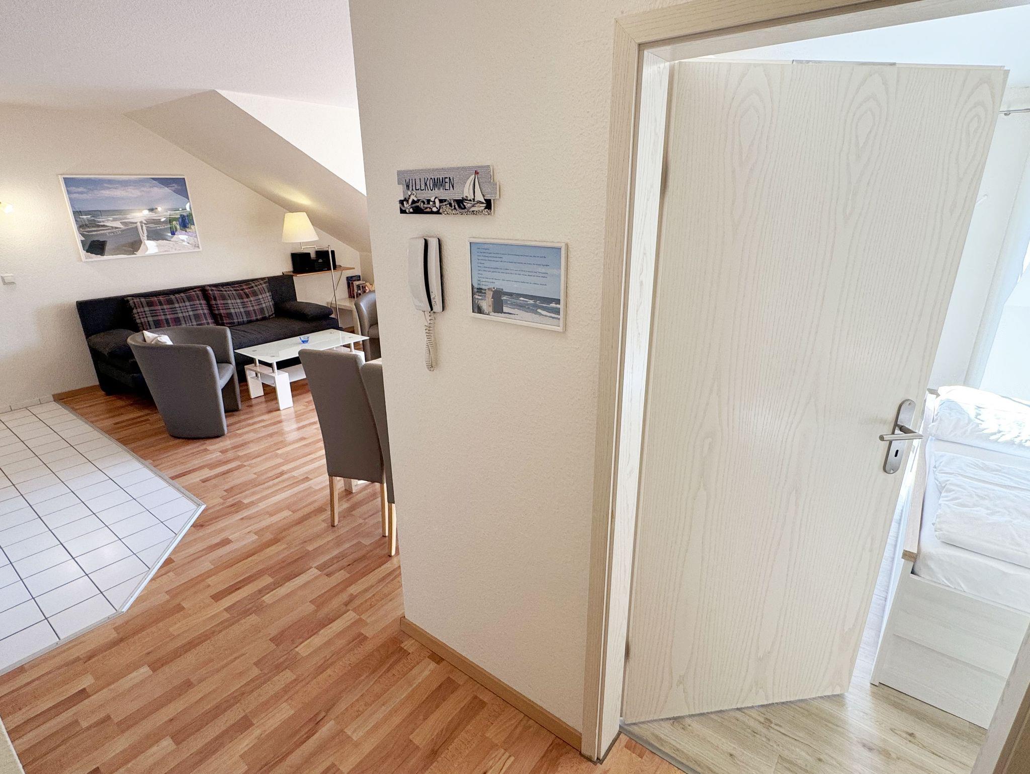Die ca. 50 m² große gemütliche Ferienwohnung befindet sich im Dachgeschoss. Es ist eine komfortable Nichtraucherwohnung für 2 bis 3 Personen. Die Wohnung hat einen kombinierten Wohn-, Küchen- und Essbereich, einen Flur, ein Schlafzimmer und ein Bad. Die moderne Küchenzeile verfügt über ein Cerankochfeld mit Backofen und Abzugshaube, Kühlschrank mit Gefrierfach, Geschirrspüler, Mikrowelle, Kaffeemaschine, Senseo Padmaschine, Wasserkocher, Eierkocher, Toaster und weitere Küchenutensilien. Im Wohnbereich steht eine Couch mit Schlaffunktion und einer Liegefläche von 2,00 m x 1,60 m, die komplett mit Lattenrost und Federkern ausgestattet ist. Auf dem beleuchteten Sideboard stehen ein Smart-TV, ein DVD-Player und eine kleine Stereoanlage mit CD-Spieler und DAB-Radio. Zum Essbereich zählt ein Tisch mit 4 komfortabel und gepolsterten Stühlen. Der nach Süden ausgerichtete Balkon ist vom Wohn- sowie vom Schlafbereich aus begehbar und verfügt über Balkonmöbel sowie einen Wäscheständer. Dort kann der Tag mit dem Blick über die Promenade der Strandstraße beim Frühstück beginnen oder bei einem Glas Wein ausklingen. Im Schlafbereich stehen ein Doppelbett mit 2 Matratzen je (0,90m x 2,00m) mit Nachttischkonsolen, TV sowie ein großer Kleiderschrank. Der Sanitärbereich wird durch eine Dusche, WC, Waschtisch und Haartrockner abgerundet Auch in Ihrem Urlaub brauchen Sie auf einen Internetzugang (WLAN) nicht verzichten, dieser ist vorhanden und inklusive. Der zur Wohnung gehörende PKW-Stellplatz Nr.06 befindet sich hinter dem Haus. Haustiere sind nicht erlaubt. Die Erstausstattung eines Wäschepaketes (komplette Bettwäsche, 1 Duschhandtuch, 1 kleines Handtuch) können Sie bis 14 Tage vor Anreise gegen einen Aufpreis dazu buchen oder durch eigene ergänzen. Ab 2 gebuchten Paketen erhalten Sie einmalig 1 Geschirrhandtuch und 1 Duschvorleger hinzu.