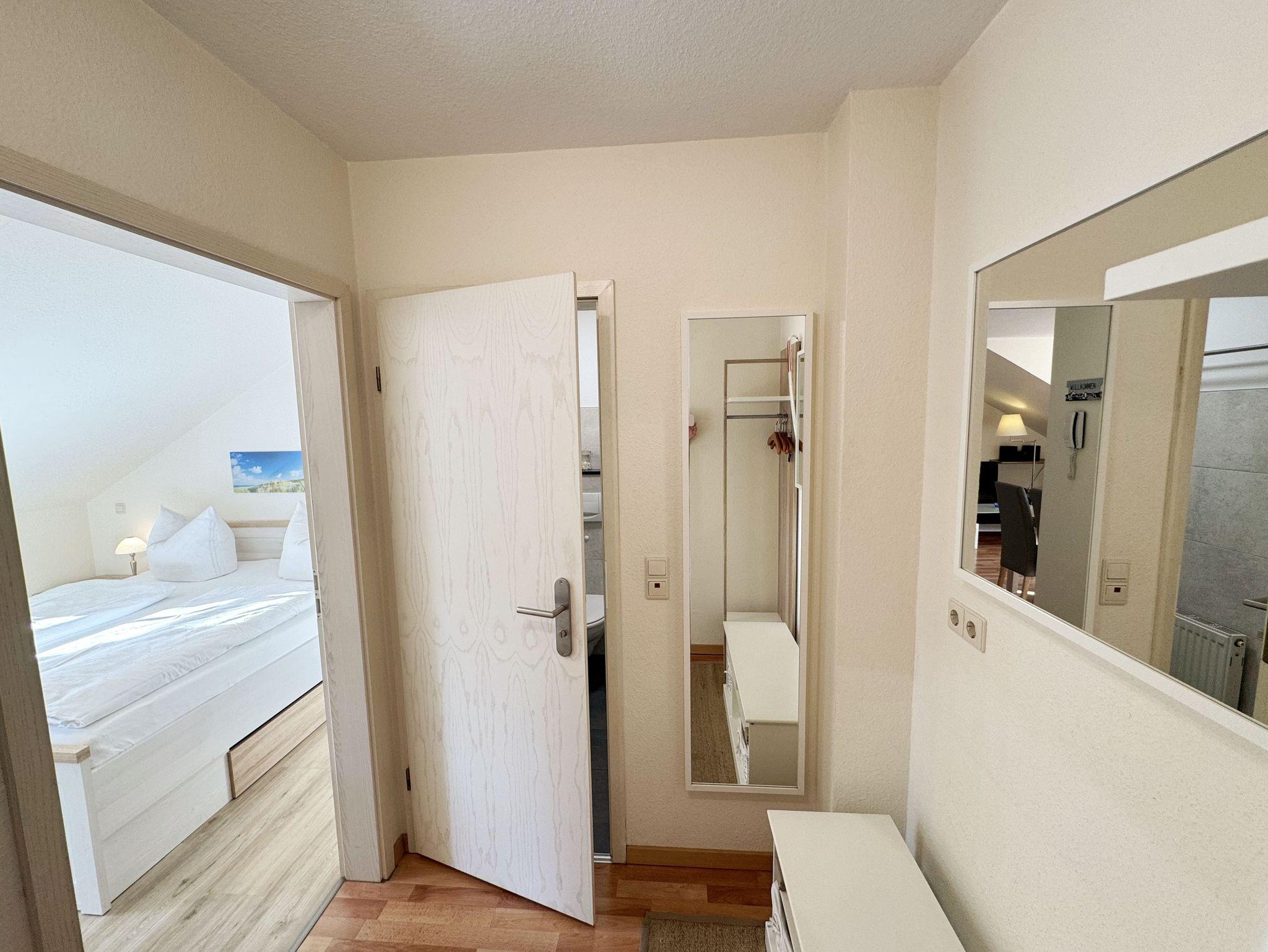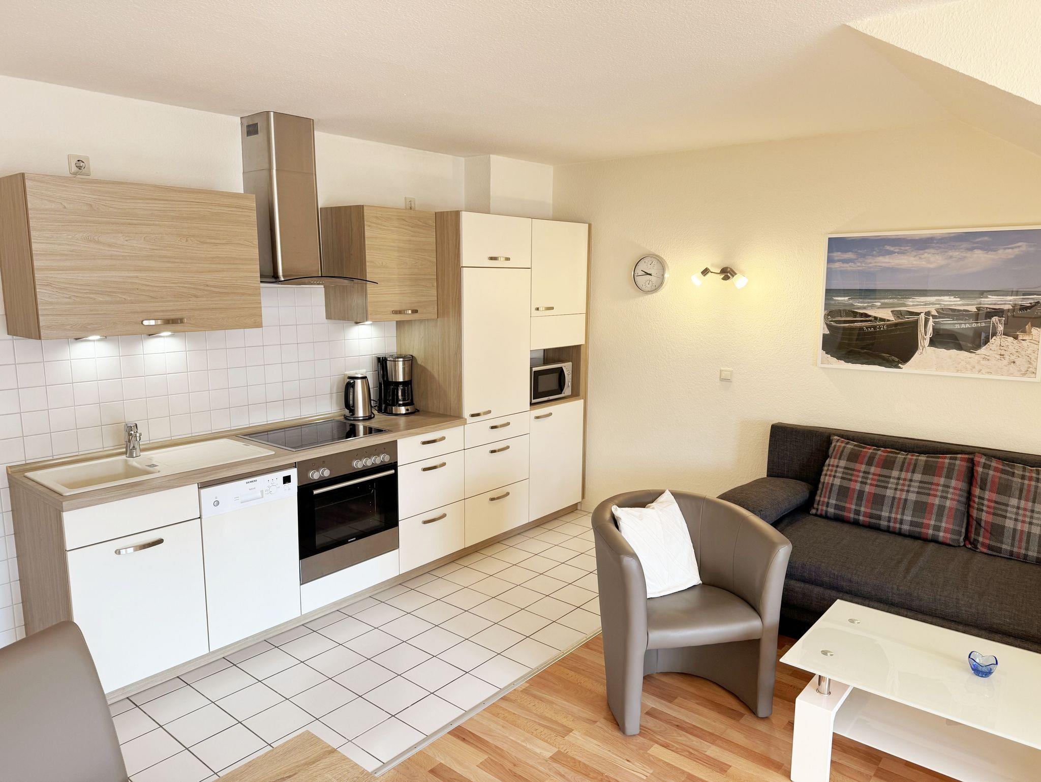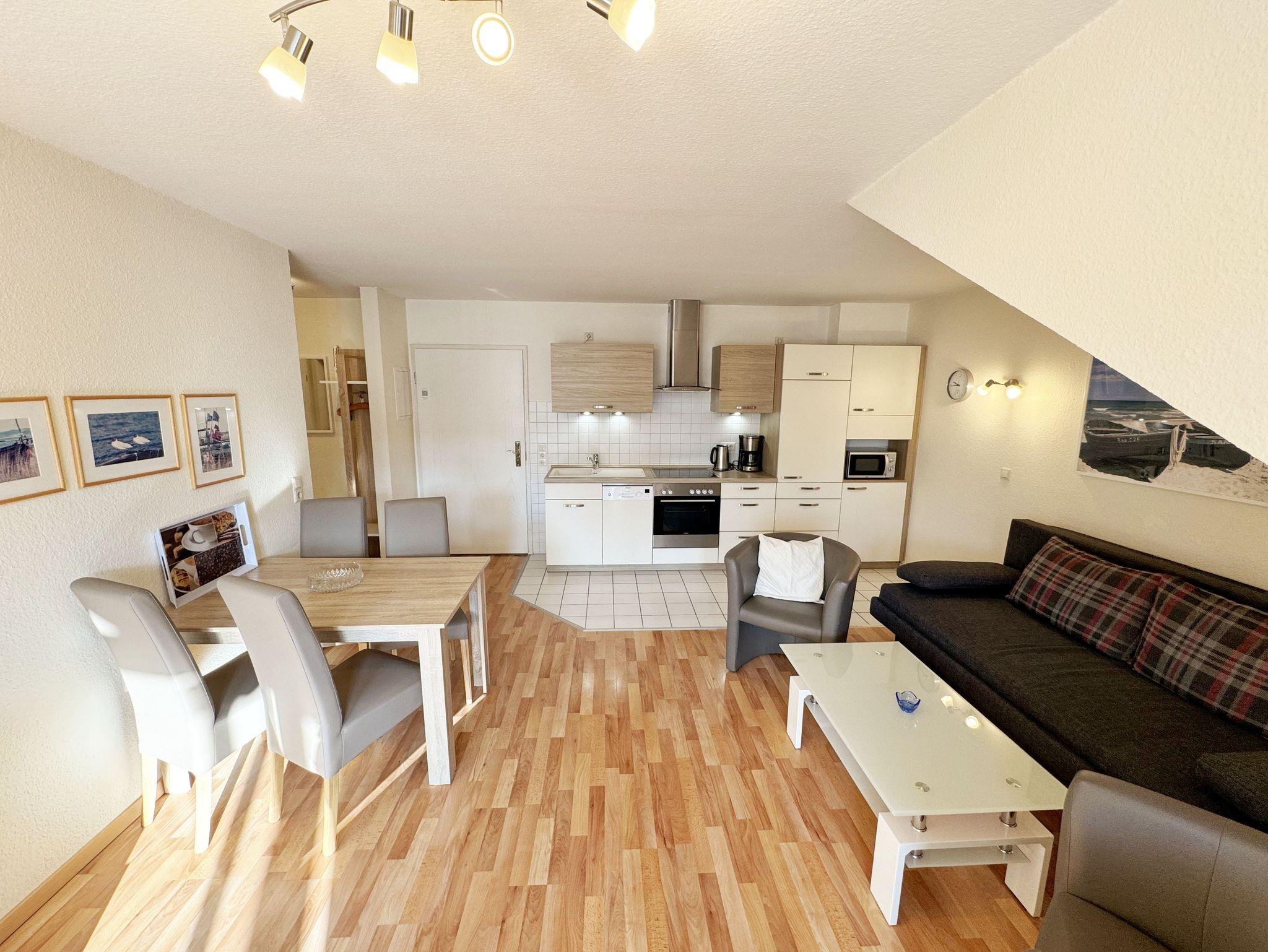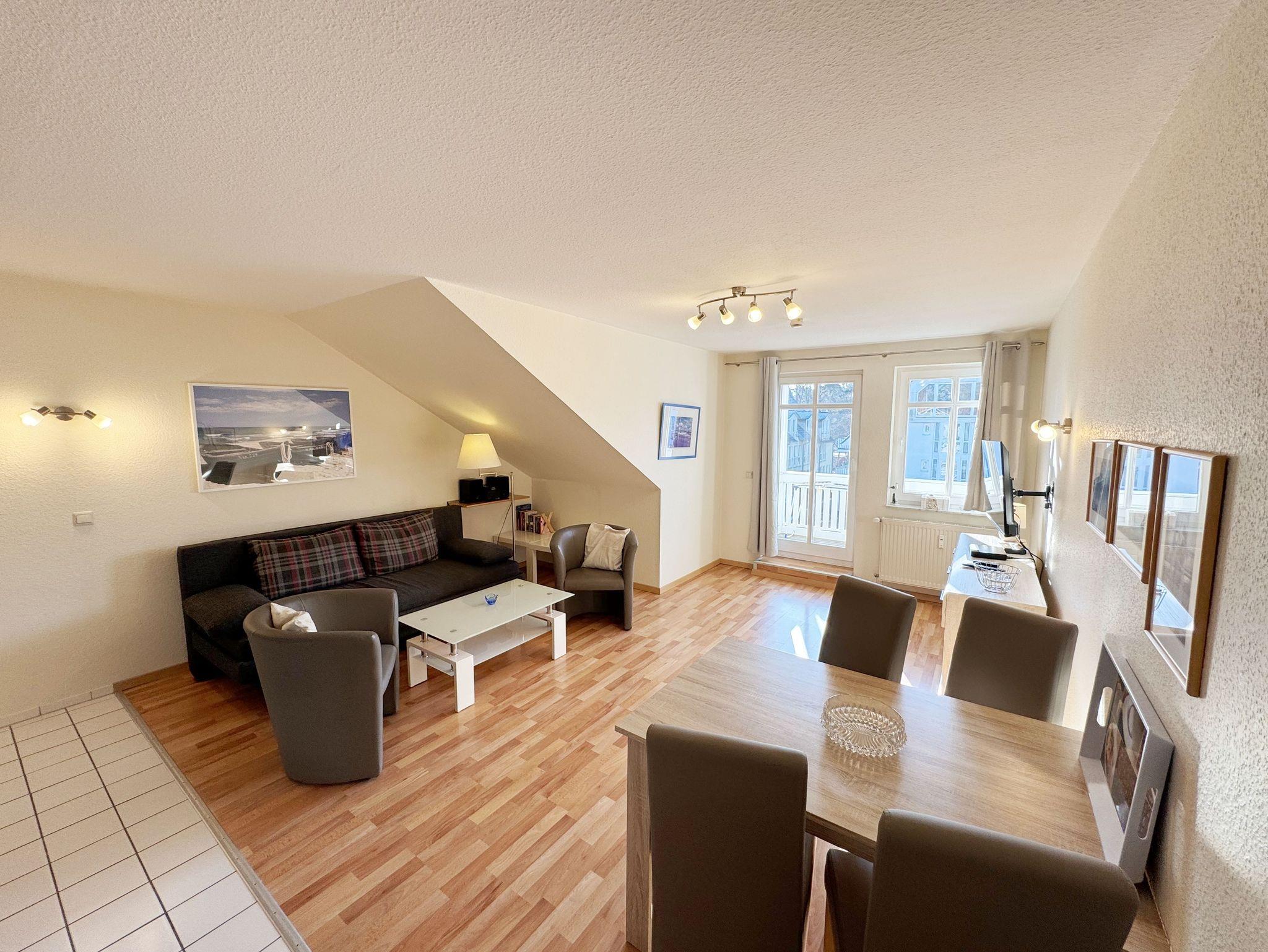 Die ca. 50 m² große gemütliche Ferienwohnung befindet sich im Dachgeschoss. Es ist eine komfortable Nichtraucherwohnung für 2 bis 3 Personen. Die Wohnung hat einen kombinierten Wohn-, Küchen- und Essbereich, einen Flur, ein Schlafzimmer und ein Bad. Die moderne Küchenzeile verfügt über ein Cerankochfeld mit Backofen und Abzugshaube, Kühlschrank mit Gefrierfach, Geschirrspüler, Mikrowelle, Kaffeemaschine, Senseo Padmaschine, Wasserkocher, Eierkocher, Toaster und weitere Küchenutensilien. Im Wohnbereich steht eine Couch mit Schlaffunktion und einer Liegefläche von 2,00 m x 1,60 m, die komplett mit Lattenrost und Federkern ausgestattet ist. Auf dem beleuchteten Sideboard stehen ein Smart-TV, ein DVD-Player und eine kleine Stereoanlage mit CD-Spieler und DAB-Radio. Zum Essbereich zählt ein Tisch mit 4 komfortabel und gepolsterten Stühlen. Der nach Süden ausgerichtete Balkon ist vom Wohn- sowie vom Schlafbereich aus begehbar und verfügt über Balkonmöbel sowie einen Wäscheständer. Dort kann der Tag mit dem Blick über die Promenade der Strandstraße beim Frühstück beginnen oder bei einem Glas Wein ausklingen. Im Schlafbereich stehen ein Doppelbett mit 2 Matratzen je (0,90m x 2,00m) mit Nachttischkonsolen, TV sowie ein großer Kleiderschrank. Der Sanitärbereich wird durch eine Dusche, WC, Waschtisch und Haartrockner abgerundet Auch in Ihrem Urlaub brauchen Sie auf einen Internetzugang (WLAN) nicht verzichten, dieser ist vorhanden und inklusive. Der zur Wohnung gehörende PKW-Stellplatz Nr.06 befindet sich hinter dem Haus. Haustiere sind nicht erlaubt. Die Erstausstattung eines Wäschepaketes (komplette Bettwäsche, 1 Duschhandtuch, 1 kleines Handtuch) können Sie bis 14 Tage vor Anreise gegen einen Aufpreis dazu buchen oder durch eigene ergänzen. Ab 2 gebuchten Paketen erhalten Sie einmalig 1 Geschirrhandtuch und 1 Duschvorleger hinzu.