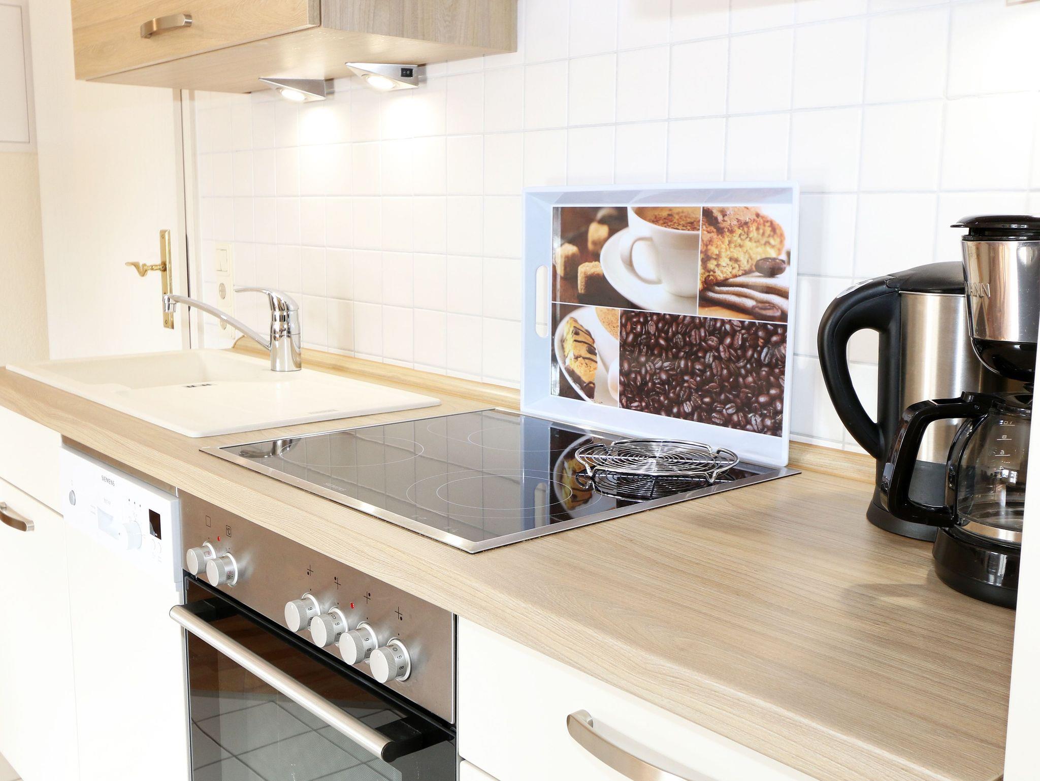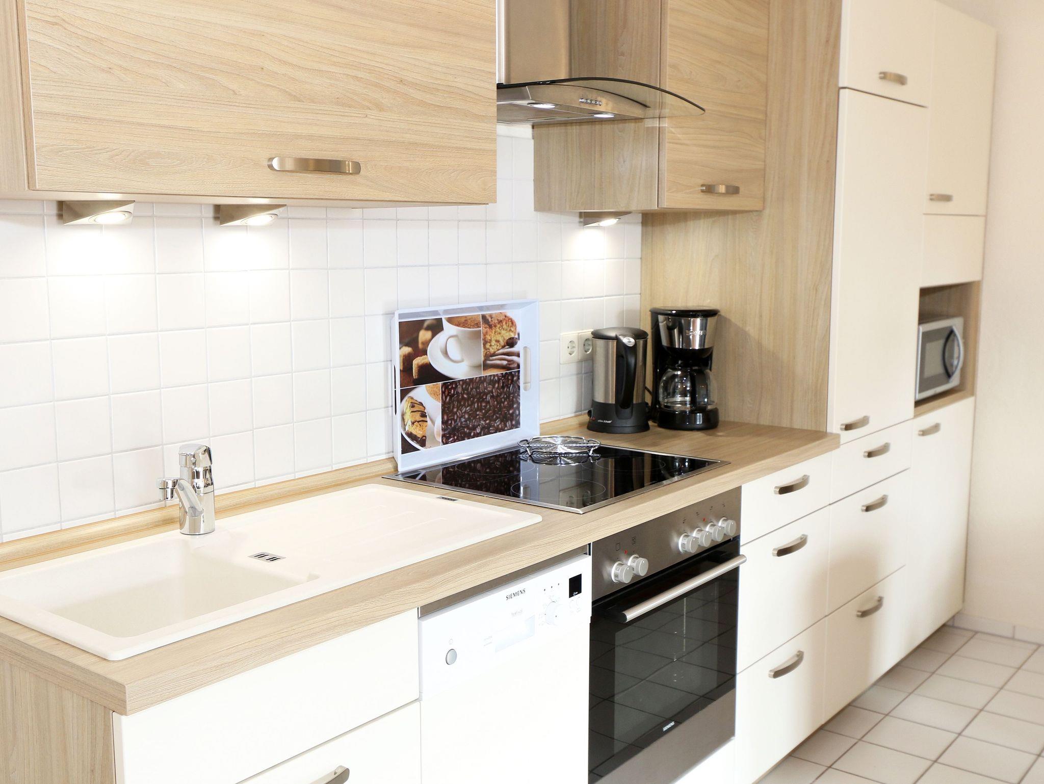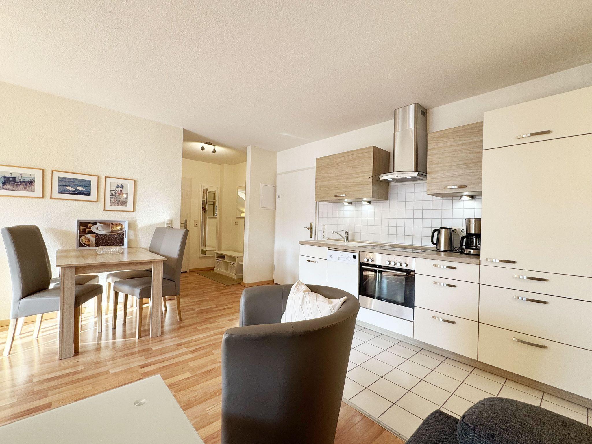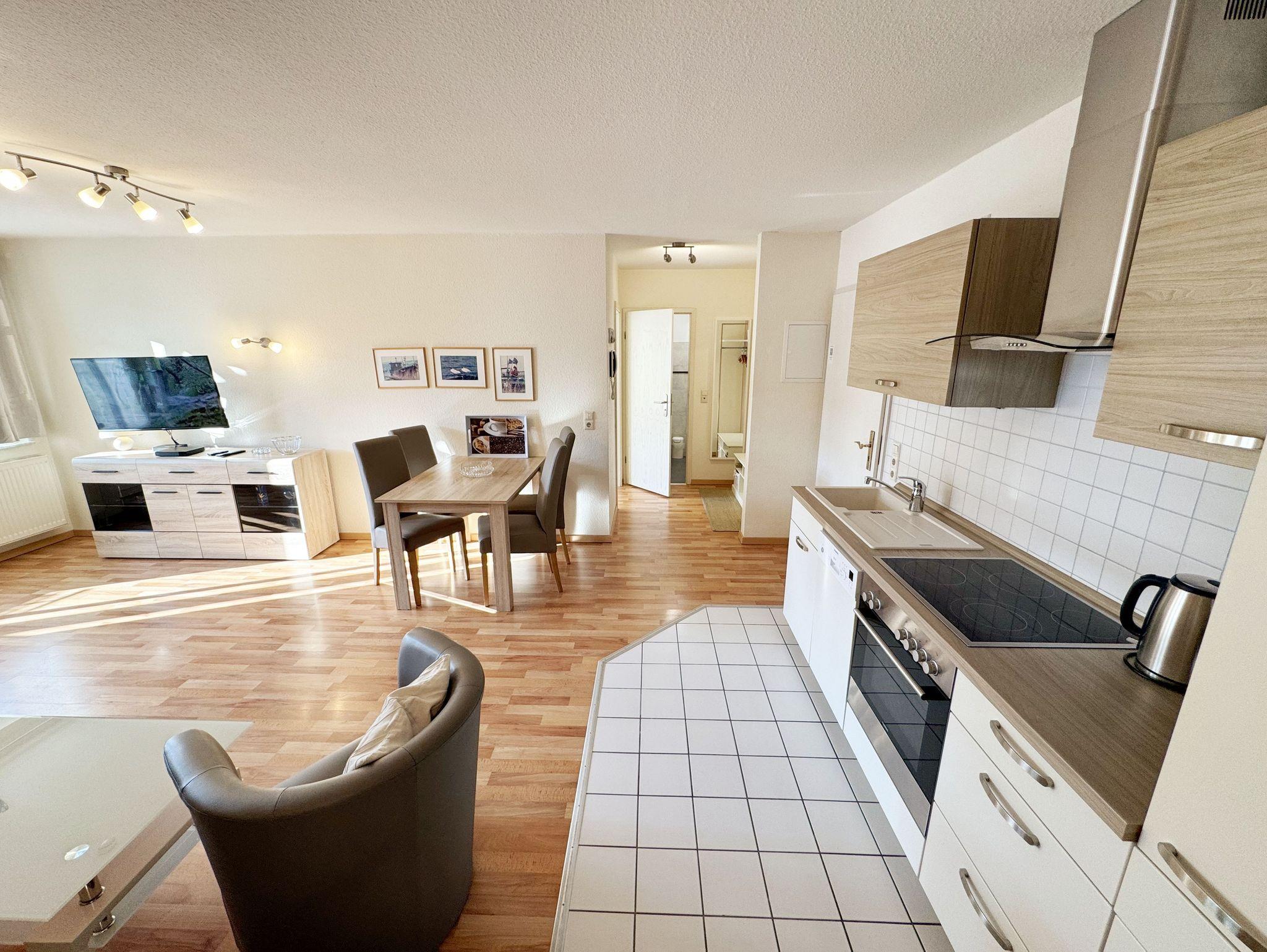 Die ca. 50 m² große gemütliche Ferienwohnung befindet sich im Dachgeschoss. Es ist eine komfortable Nichtraucherwohnung für 2 bis 3 Personen. Die Wohnung hat einen kombinierten Wohn-, Küchen- und Essbereich, einen Flur, ein Schlafzimmer und ein Bad. Die moderne Küchenzeile verfügt über ein Cerankochfeld mit Backofen und Abzugshaube, Kühlschrank mit Gefrierfach, Geschirrspüler, Mikrowelle, Kaffeemaschine, Senseo Padmaschine, Wasserkocher, Eierkocher, Toaster und weitere Küchenutensilien. Im Wohnbereich steht eine Couch mit Schlaffunktion und einer Liegefläche von 2,00 m x 1,60 m, die komplett mit Lattenrost und Federkern ausgestattet ist. Auf dem beleuchteten Sideboard stehen ein Smart-TV, ein DVD-Player und eine kleine Stereoanlage mit CD-Spieler und DAB-Radio. Zum Essbereich zählt ein Tisch mit 4 komfortabel und gepolsterten Stühlen. Der nach Süden ausgerichtete Balkon ist vom Wohn- sowie vom Schlafbereich aus begehbar und verfügt über Balkonmöbel sowie einen Wäscheständer. Dort kann der Tag mit dem Blick über die Promenade der Strandstraße beim Frühstück beginnen oder bei einem Glas Wein ausklingen. Im Schlafbereich stehen ein Doppelbett mit 2 Matratzen je (0,90m x 2,00m) mit Nachttischkonsolen, TV sowie ein großer Kleiderschrank. Der Sanitärbereich wird durch eine Dusche, WC, Waschtisch und Haartrockner abgerundet Auch in Ihrem Urlaub brauchen Sie auf einen Internetzugang (WLAN) nicht verzichten, dieser ist vorhanden und inklusive. Der zur Wohnung gehörende PKW-Stellplatz Nr.06 befindet sich hinter dem Haus. Haustiere sind nicht erlaubt. Die Erstausstattung eines Wäschepaketes (komplette Bettwäsche, 1 Duschhandtuch, 1 kleines Handtuch) können Sie bis 14 Tage vor Anreise gegen einen Aufpreis dazu buchen oder durch eigene ergänzen. Ab 2 gebuchten Paketen erhalten Sie einmalig 1 Geschirrhandtuch und 1 Duschvorleger hinzu.