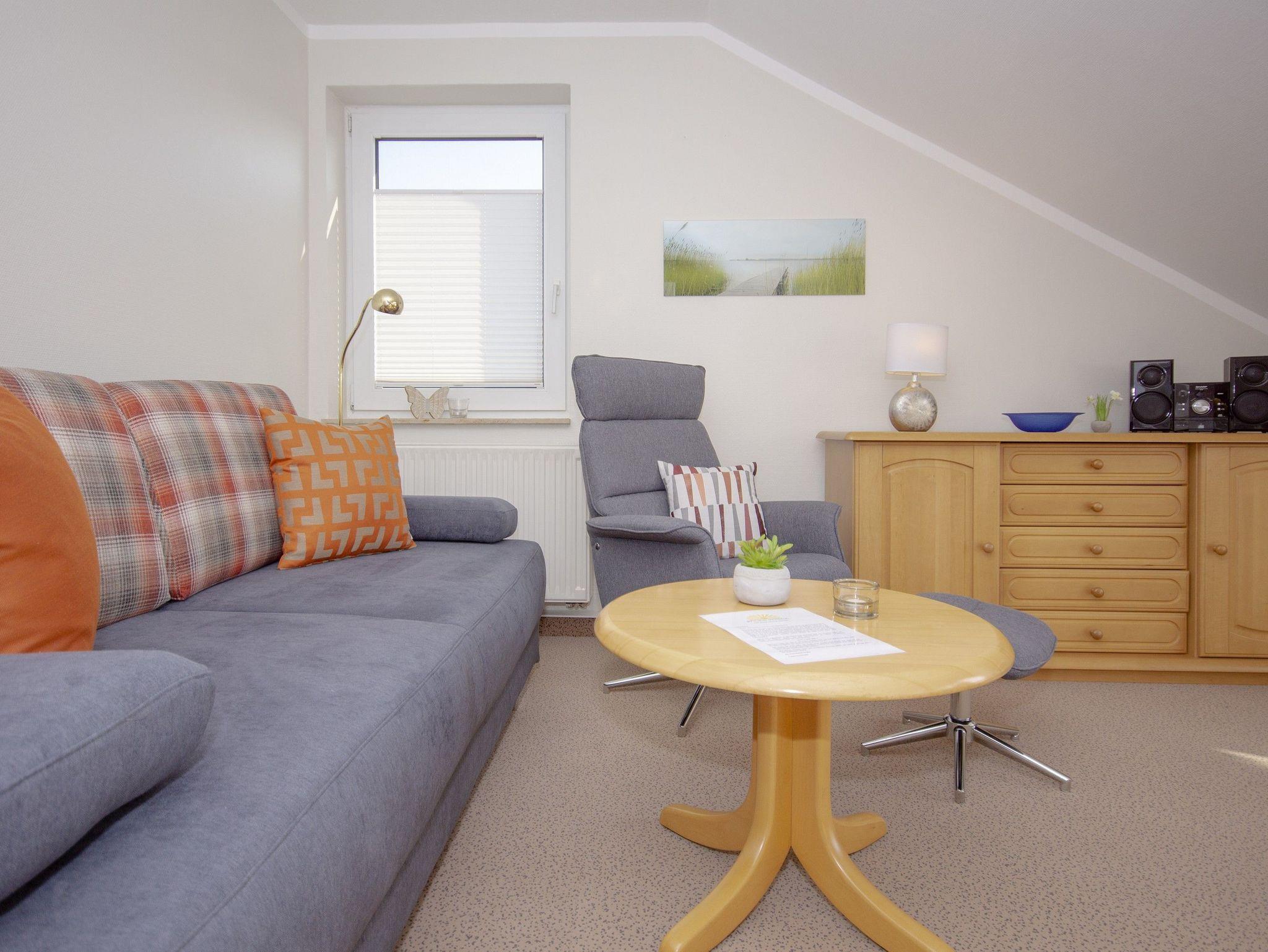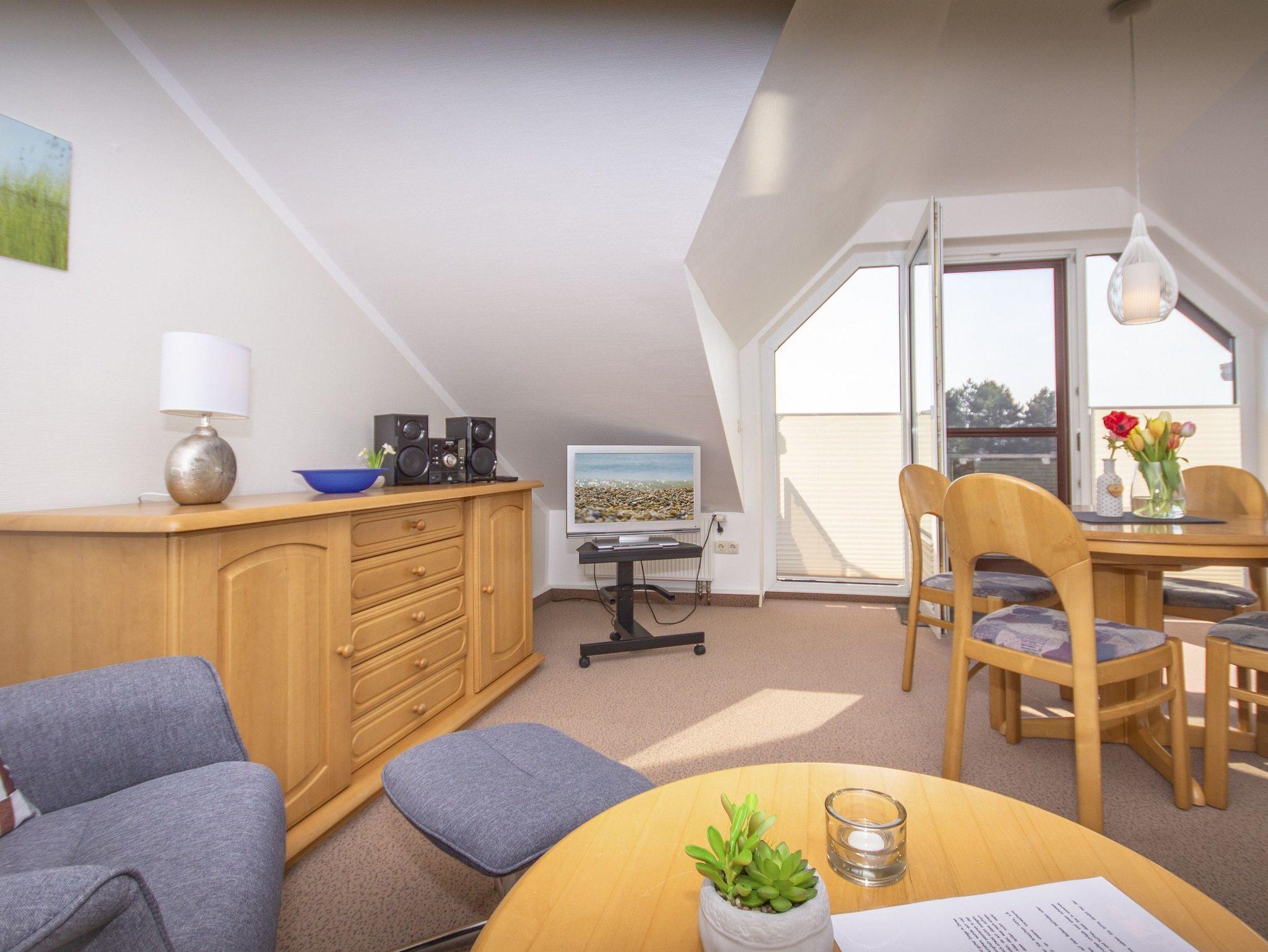 Der freundliche Wohnbereich bietet einen gemütlichen Ort zum Ausklingen der erlebnisreichen Tage auf Rügen. Hier befindet sich neben einem modernen Flachbild-TV auch eine außerordentlich komfortable Couchgarnitur, die eine optionale Aufbettung für bis zu 2 weitere Personen darstellt. Von diesem Zimmer erhalten Sie einen direkten Zugang auf den Balkon, welcher mit komfortablen Balkonmöbeln ausgestattet ist. Hier können Sie nach einem erlebnisreichen Strandtag in Baabe einfach mal die Seele baumeln lassen.
