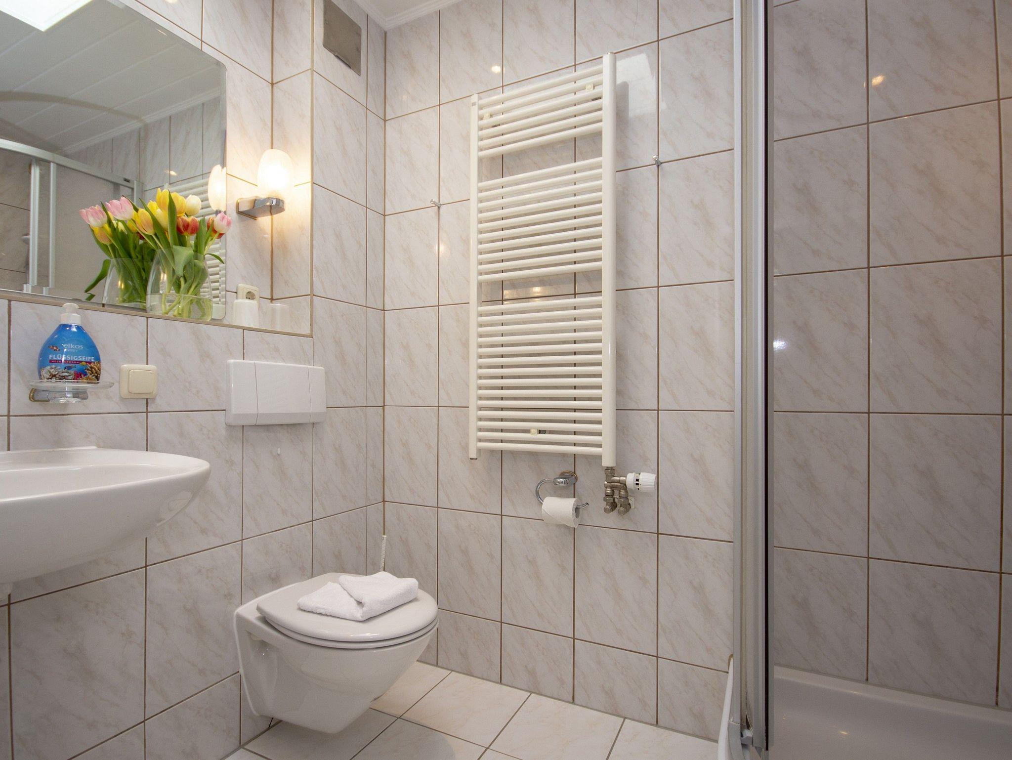 Das Badezimmer verfügt über eine Dusche, WC und einen Waschtisch mit großen Spiegel.