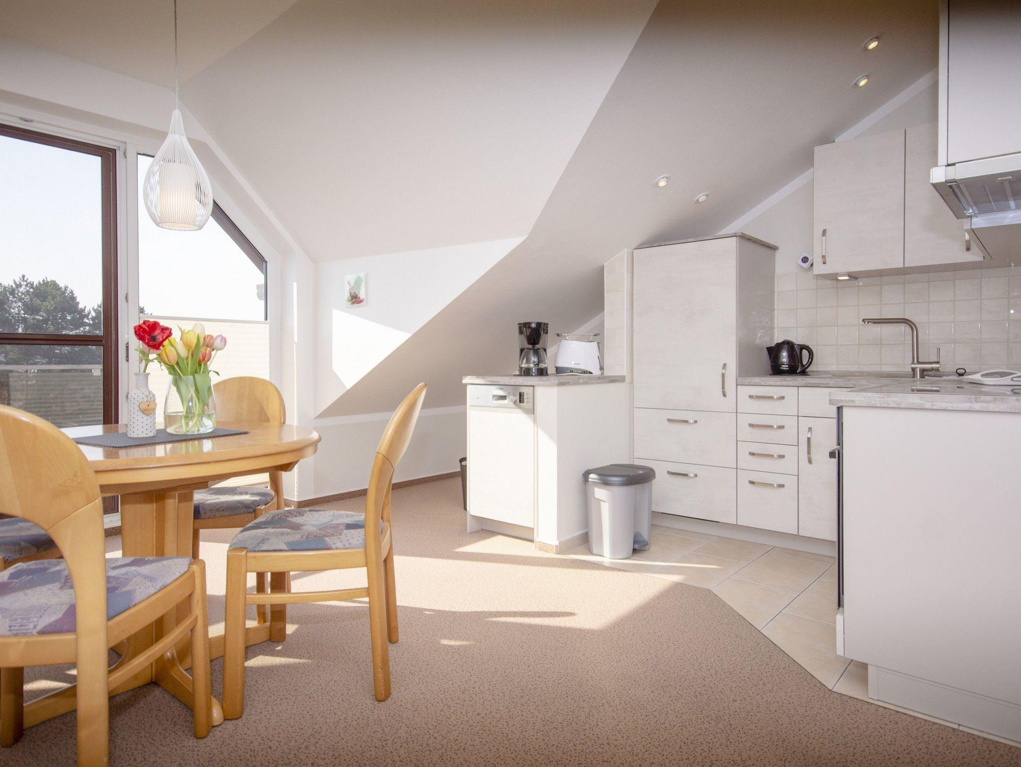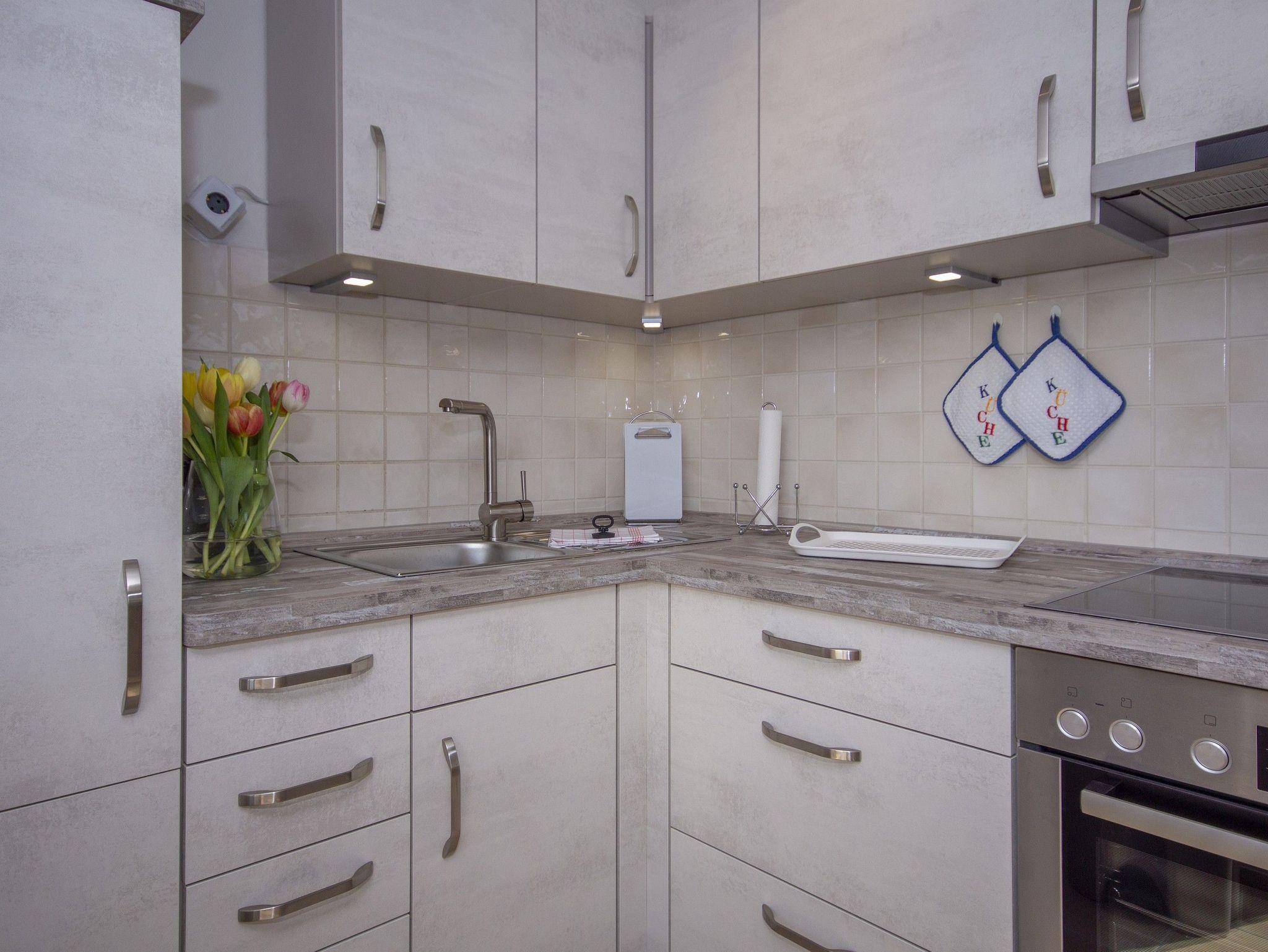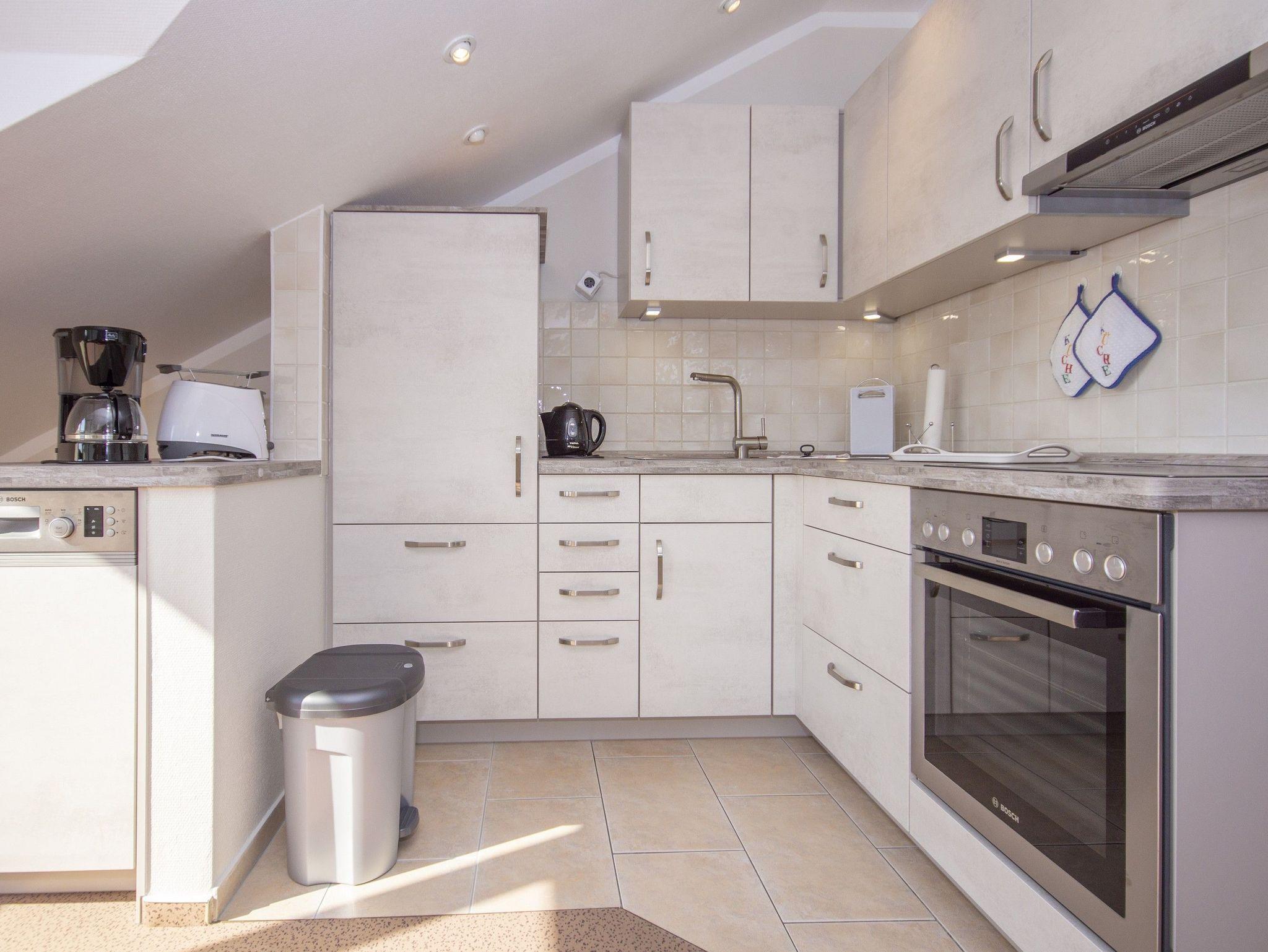 In der Wohnung befindet sich eine offene, voll ausgestattete Küche mit Spülmaschine, Herd, Cerankochfeld und Mikrowelle. Zahlreiche Küchenutensilien eröffnen Ihnen die Möglichkeit, einen kulinarischen Kochabend zu verleben.