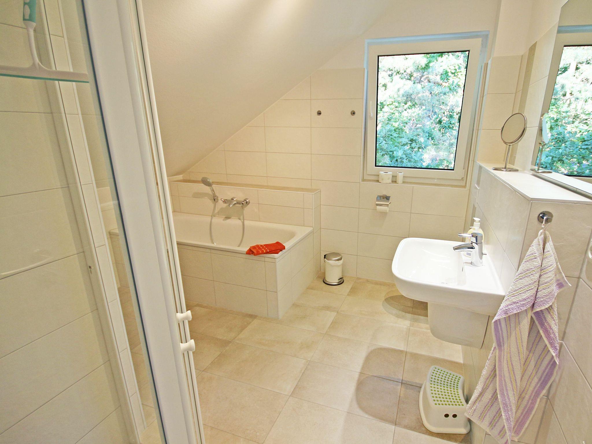 Im Obergeschoss gibt es eine separate Relaxecke mit Relaxliegen und einer Kinderspielecke, zwei weitere Schlafzimmer sowie das zweite Bad mit bodengleicher Dusche, Badewanne und Münzwaschmaschine.