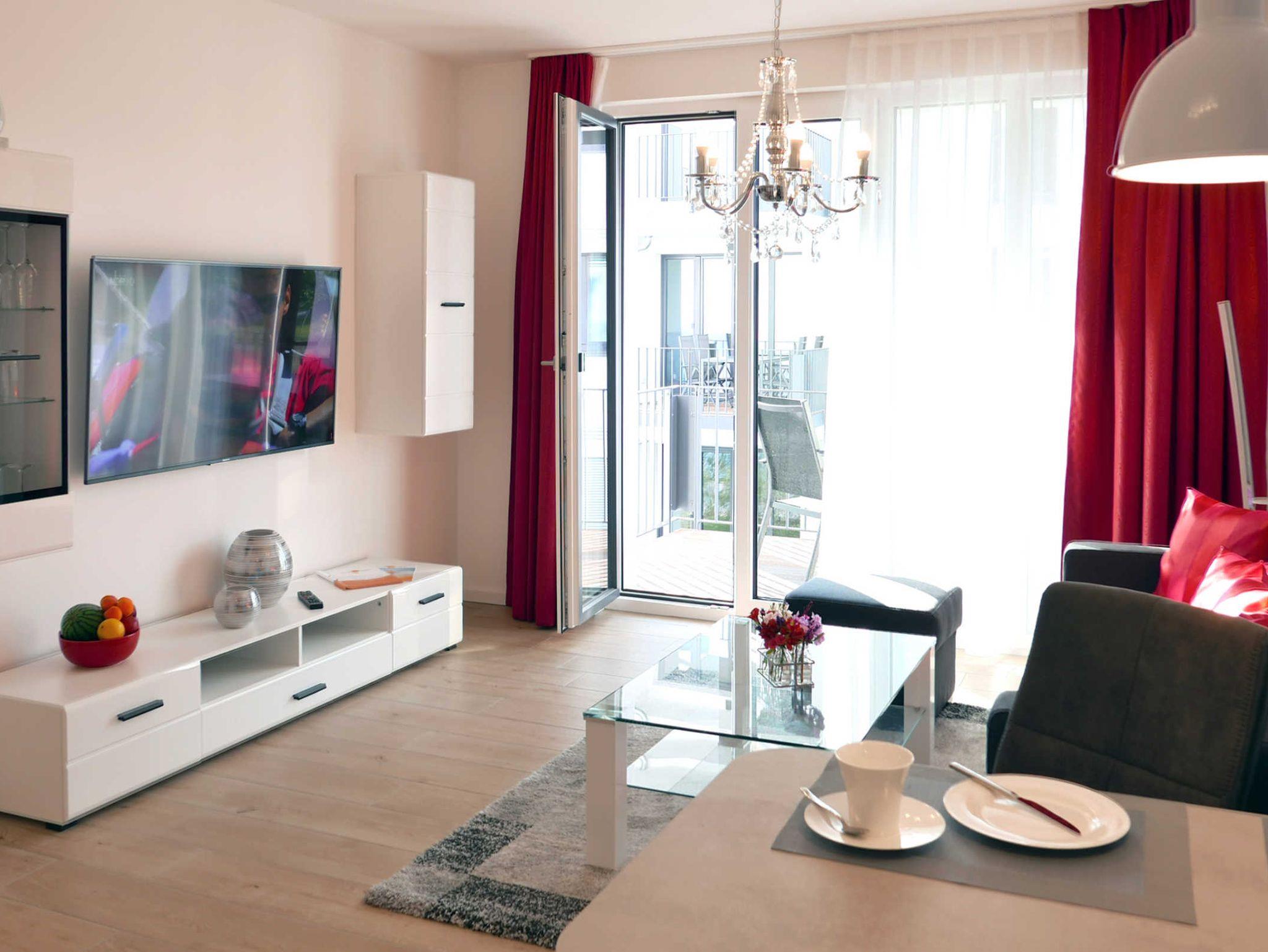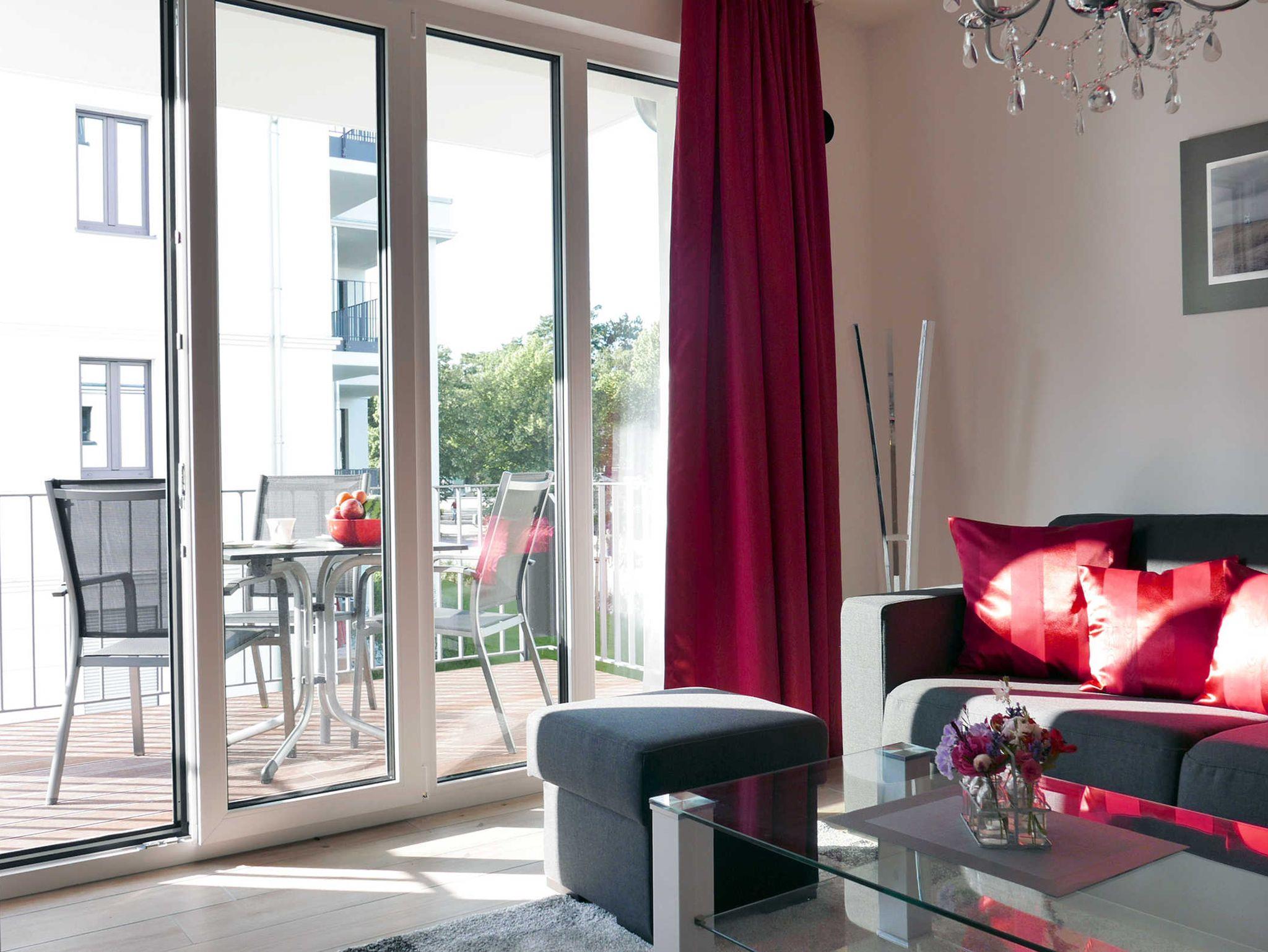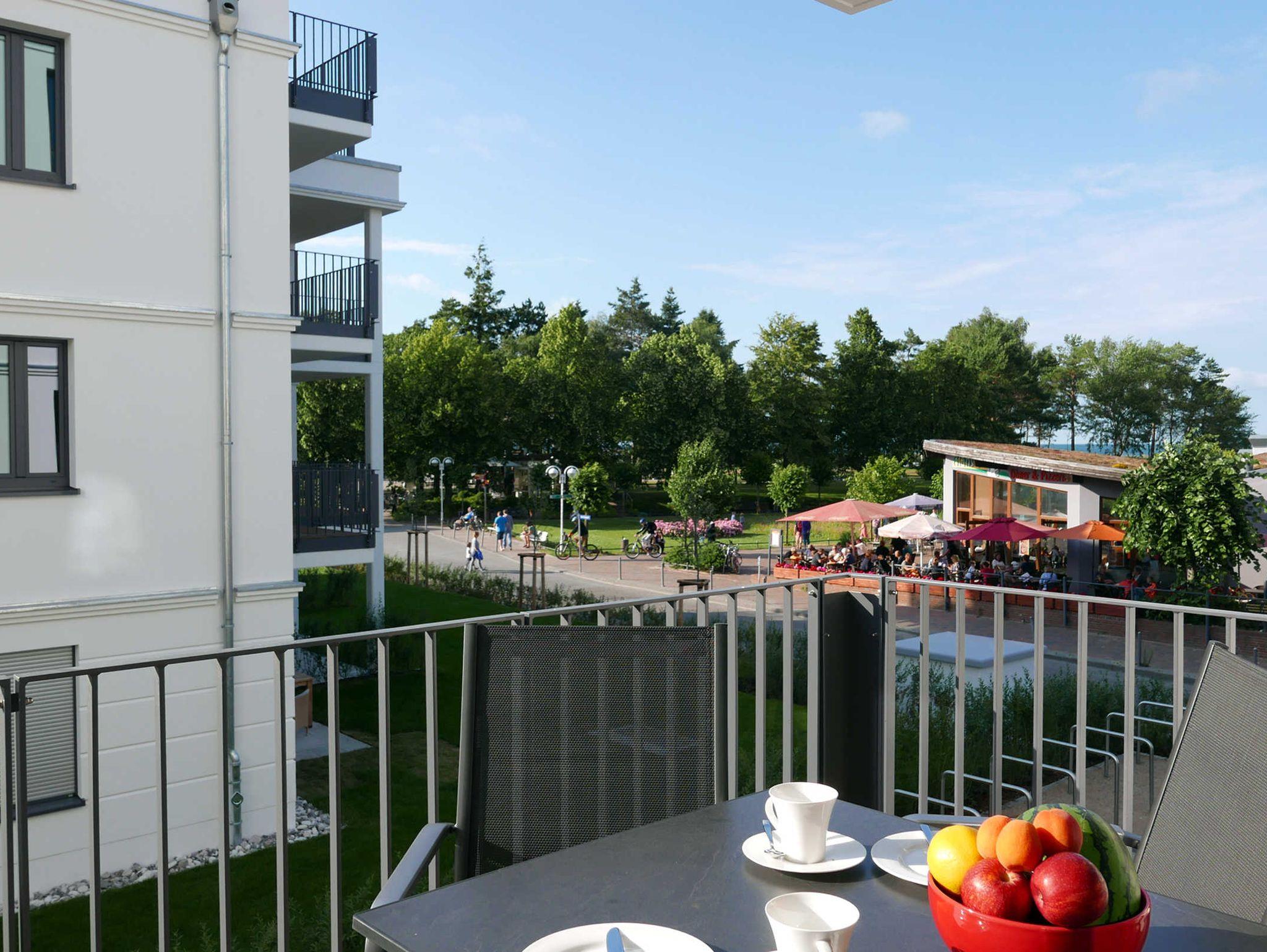 Modern eingerichtete 2-Zimmer-Wohnung mit Balkon und seitlichem Meerblick in Baabe, nahe Strand und Zentrum.